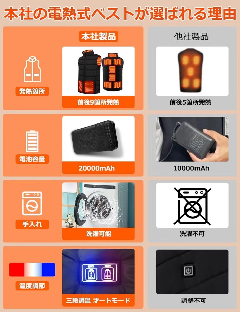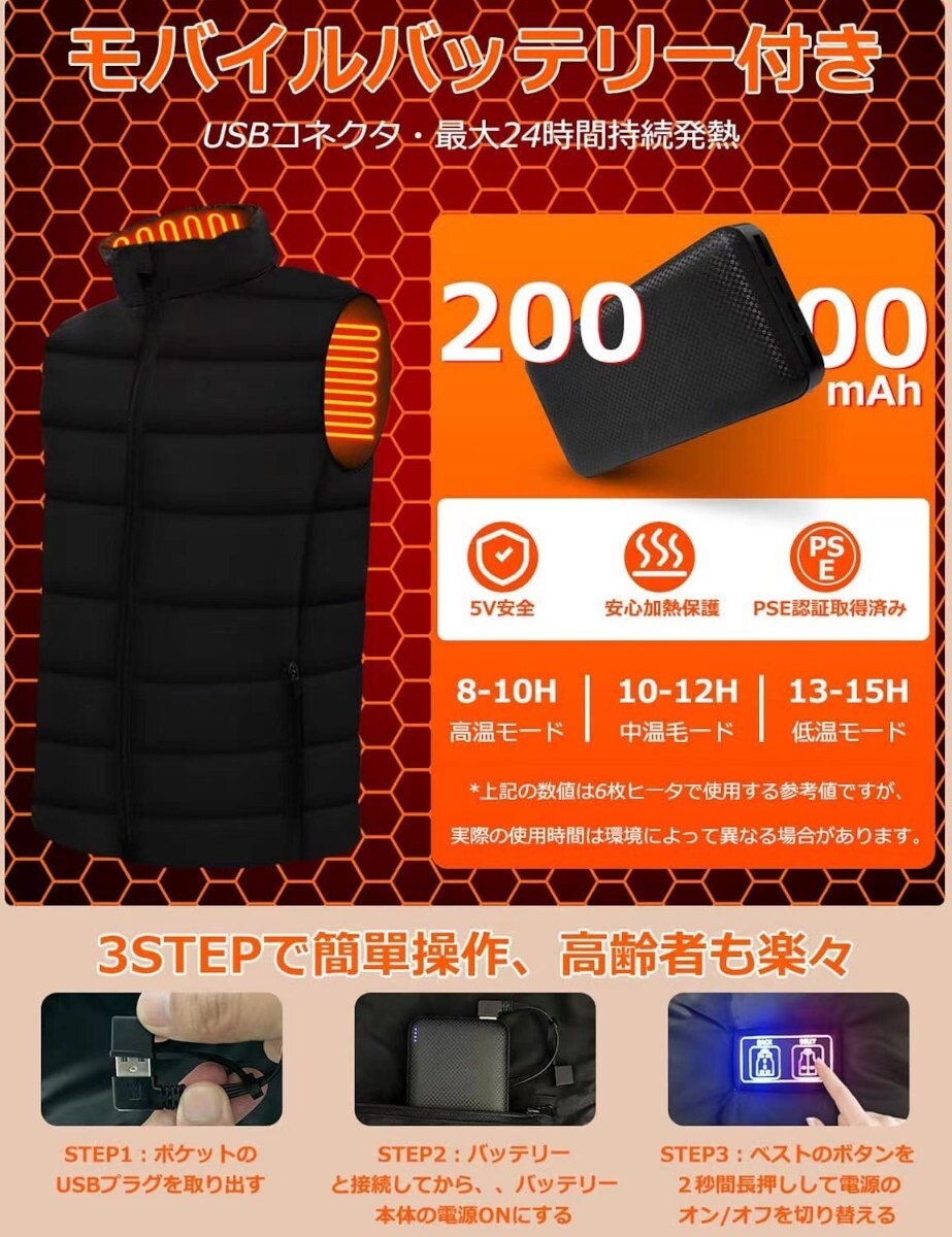 【20000mAh大容量バッテリー付属】充電式ではなく、USB給電式なので、裏ポケット内のUSBケーブルでモバイル電源に接続しながら使用する電熱ベストです。20000mAhモバイルバッテリーを付属、高温で約8-10H、中温で約10-12H、低温で約13-15Hと長く使えます。