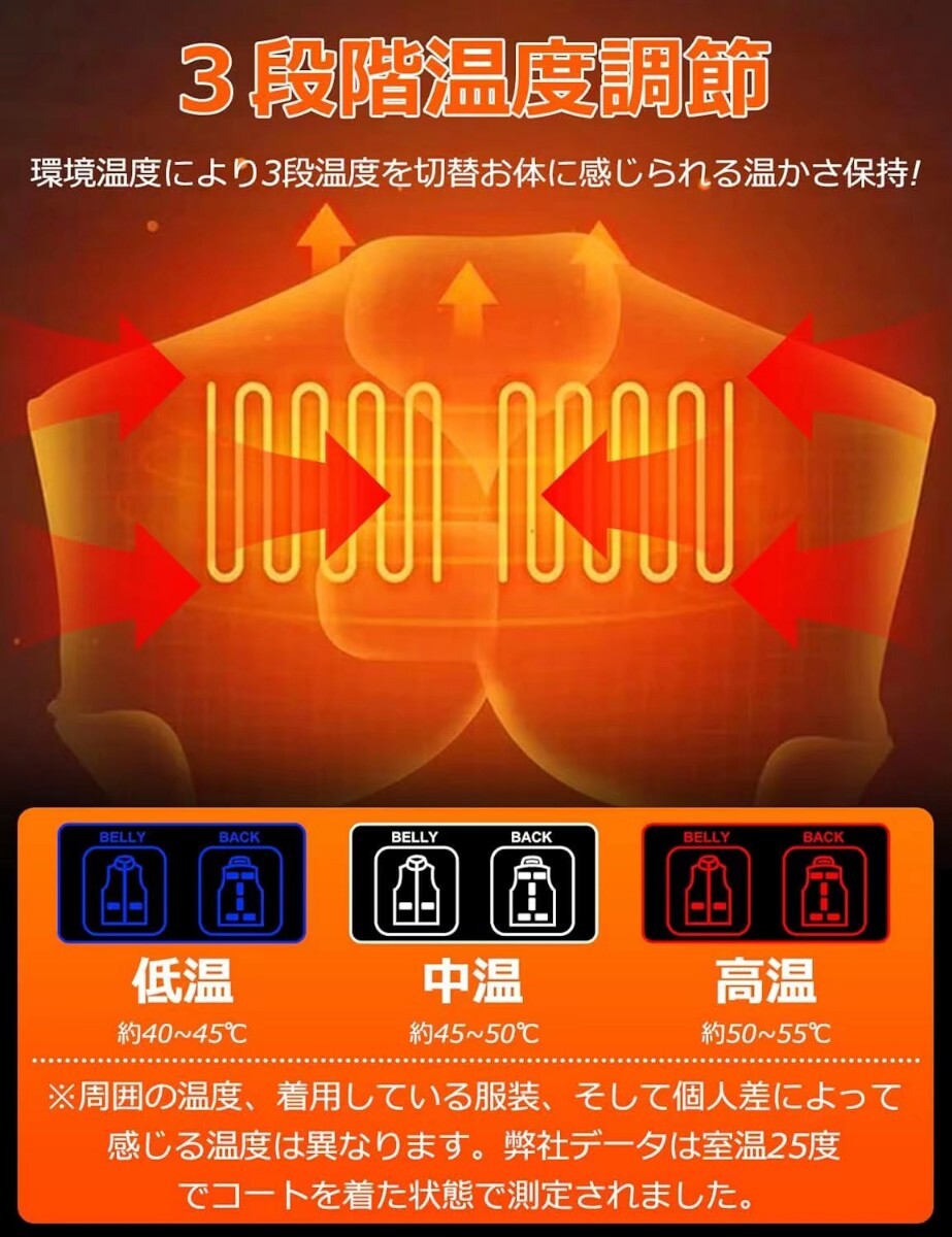【3段階温度調節・自動調温機能】二つの制御ボタンを備え、前(2つ)・後(7つ)別々に設置することができます。温度調節は、高温(50℃)・中温(45℃)・低温(40℃)と3段階から切り替えられ、ボタンの色[赤(高温)・白(中温)・青(低温)]で判別できて分かりやすい。前後9箇所を同時に温めることができれば、前か後ろだけ発熱させることも可能で、気温や使う場面に応じて使い分けできます。