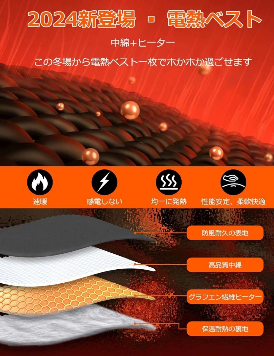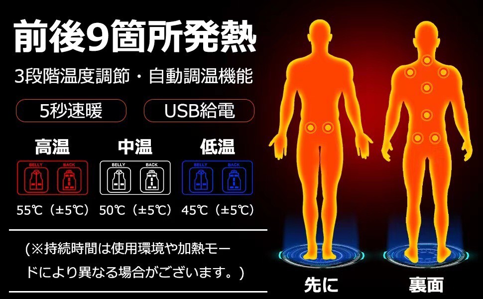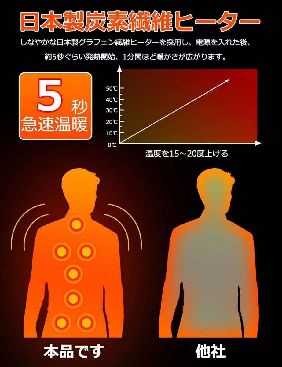 【2024新開発・5秒速暖】 5秒速暖USBヒーターベストが新登場!電熱ウェアは日本製炭素繊維(カーボン)ヒーターを採用しているため、熱は生地全体に均等に広がり、コントローラーのスイッチを入れて、わずか5秒感で発熱!電熱ベストは最初高温モードで5分間動作した後、操作がなくても自動的に中温モードの切り替わます。