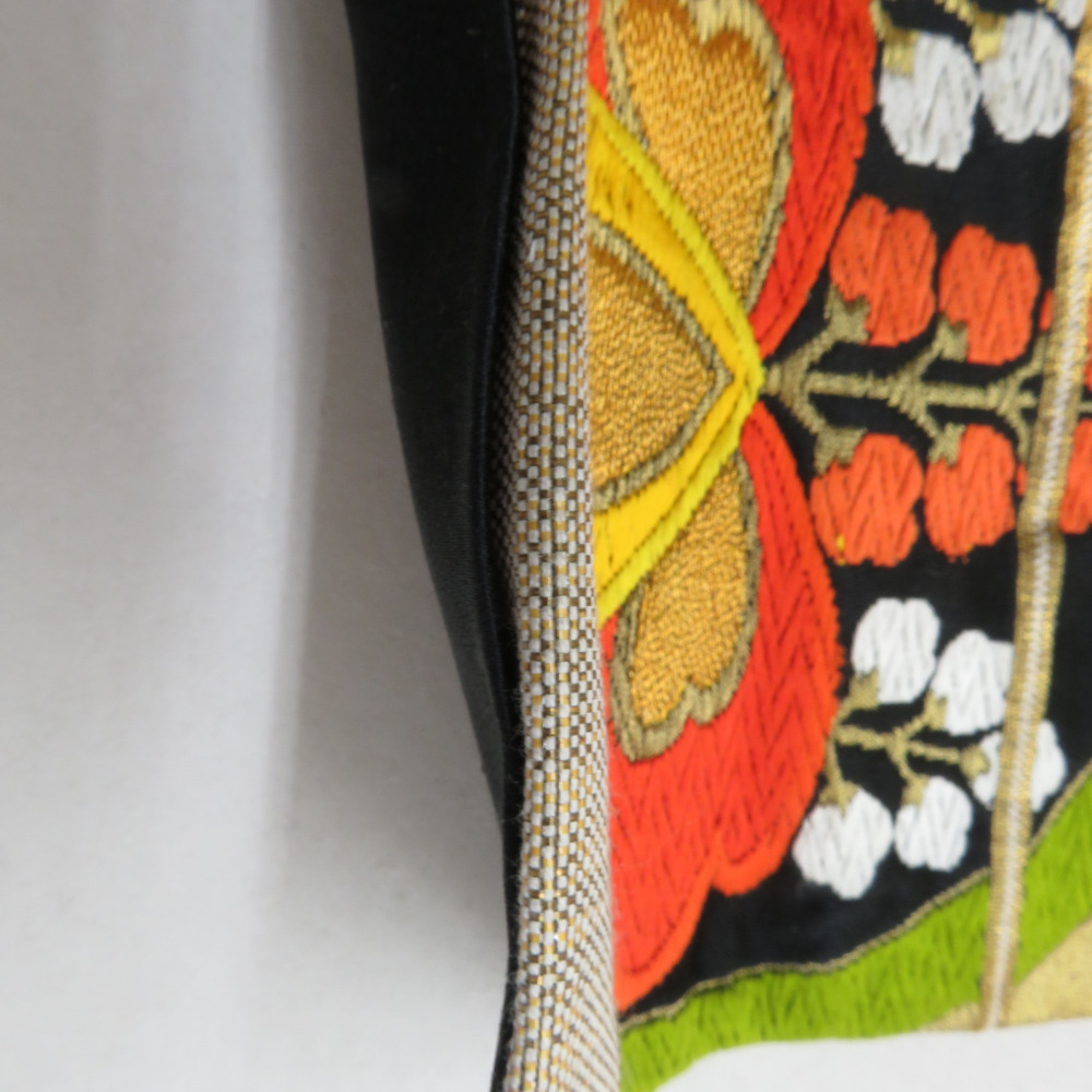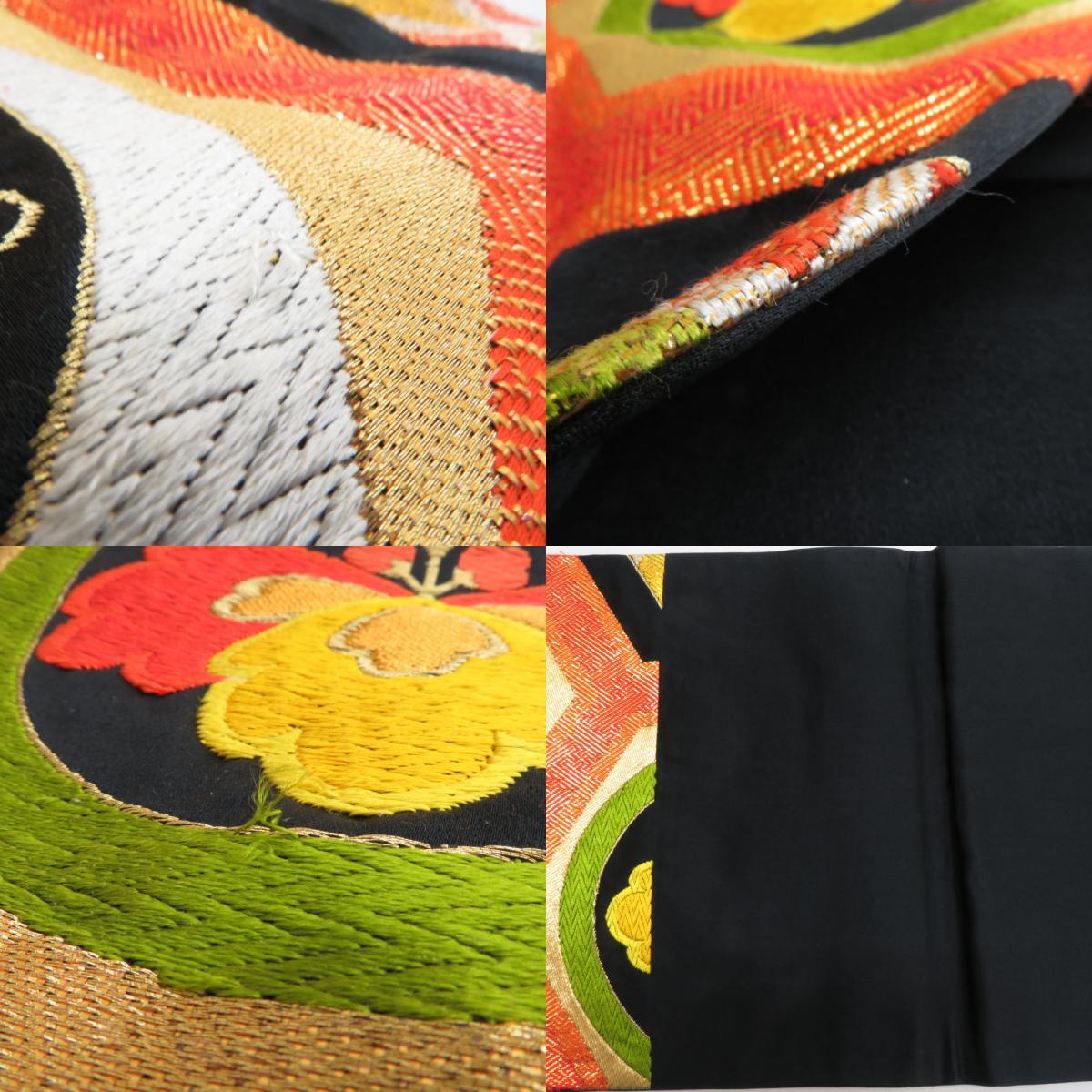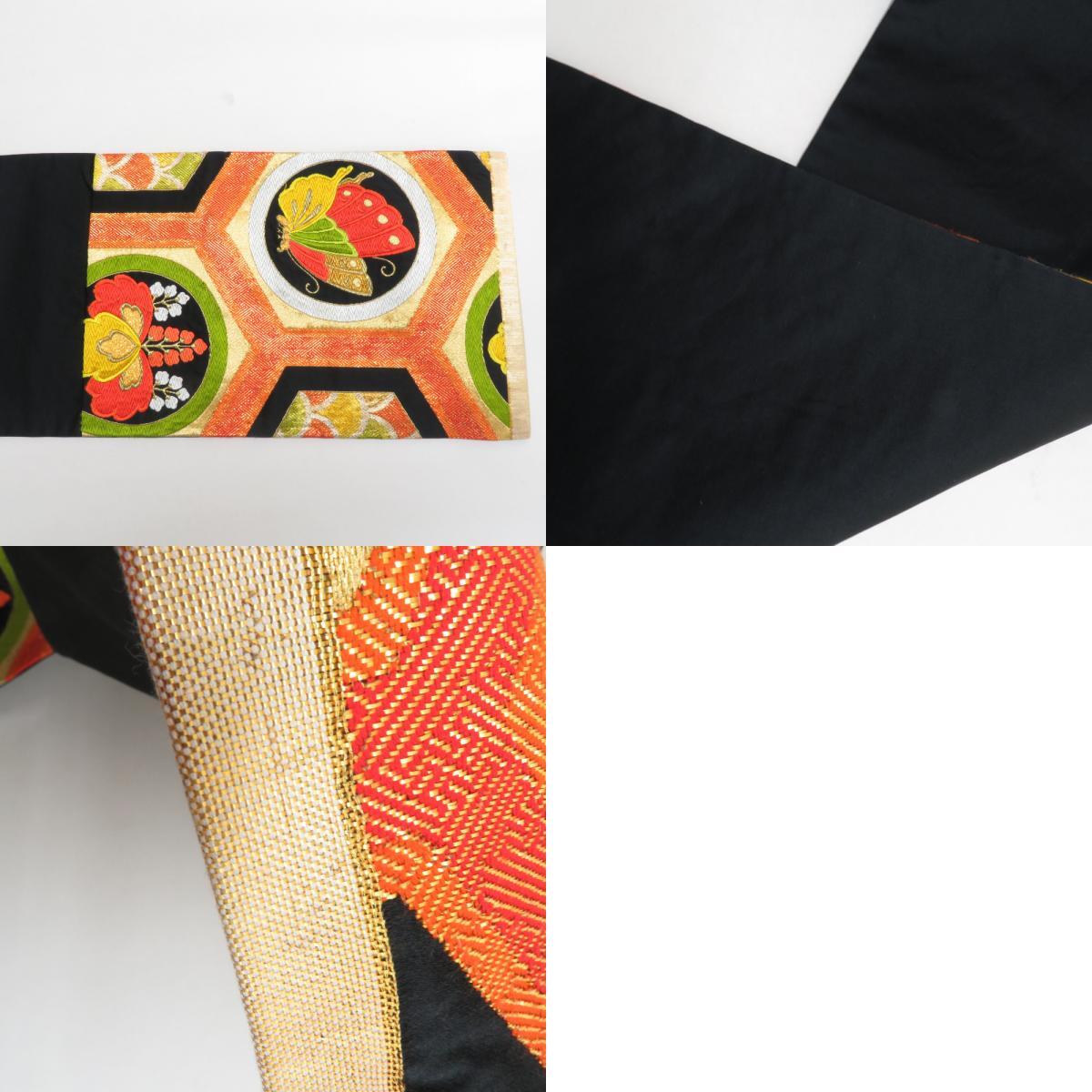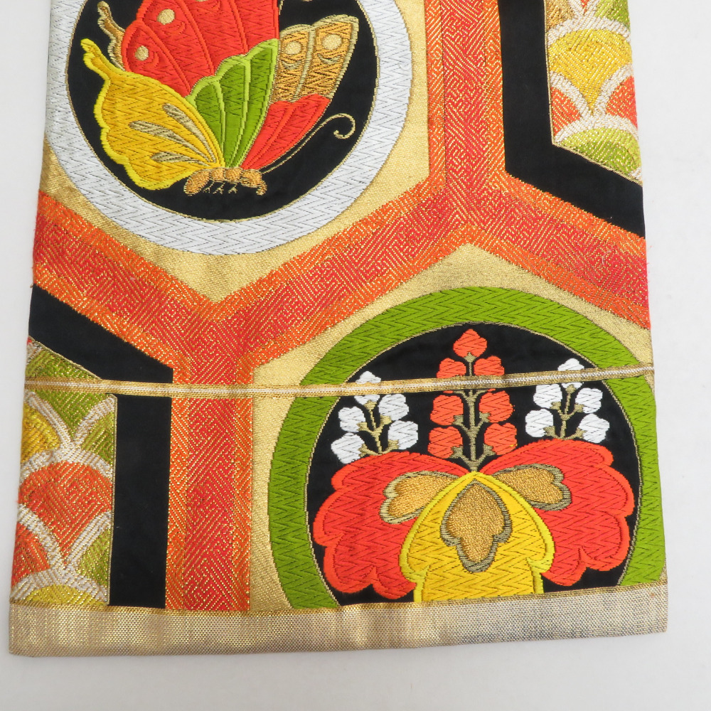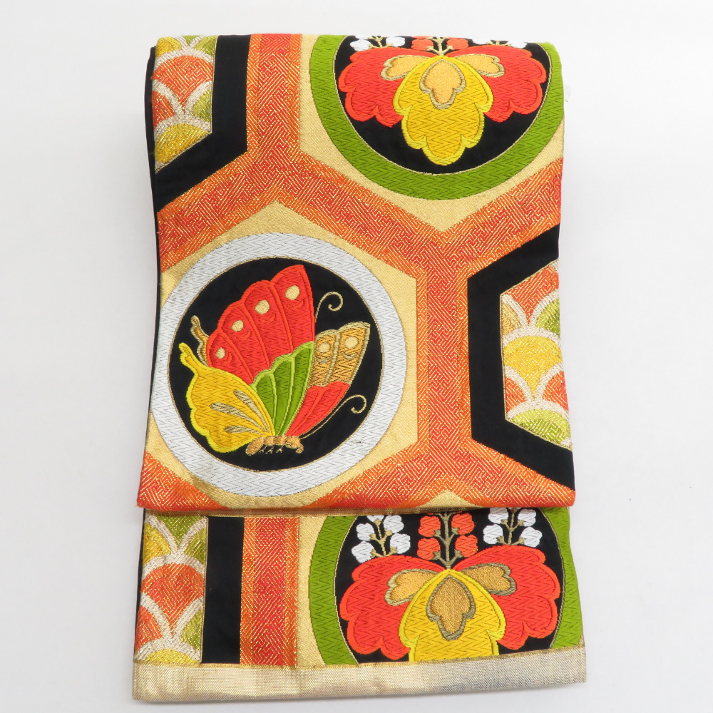 | 袋帯 正絹 振袖用 亀甲に蝶々と五三桐文 黒色x金色x多色 金糸 六通柄 フォーマル 礼装 長さ424cm |