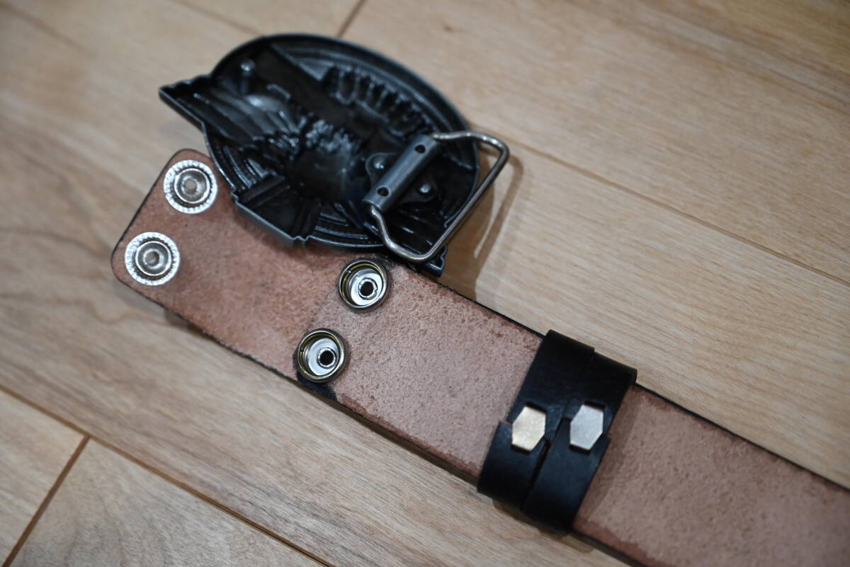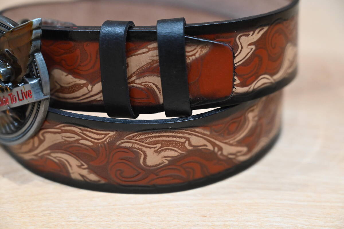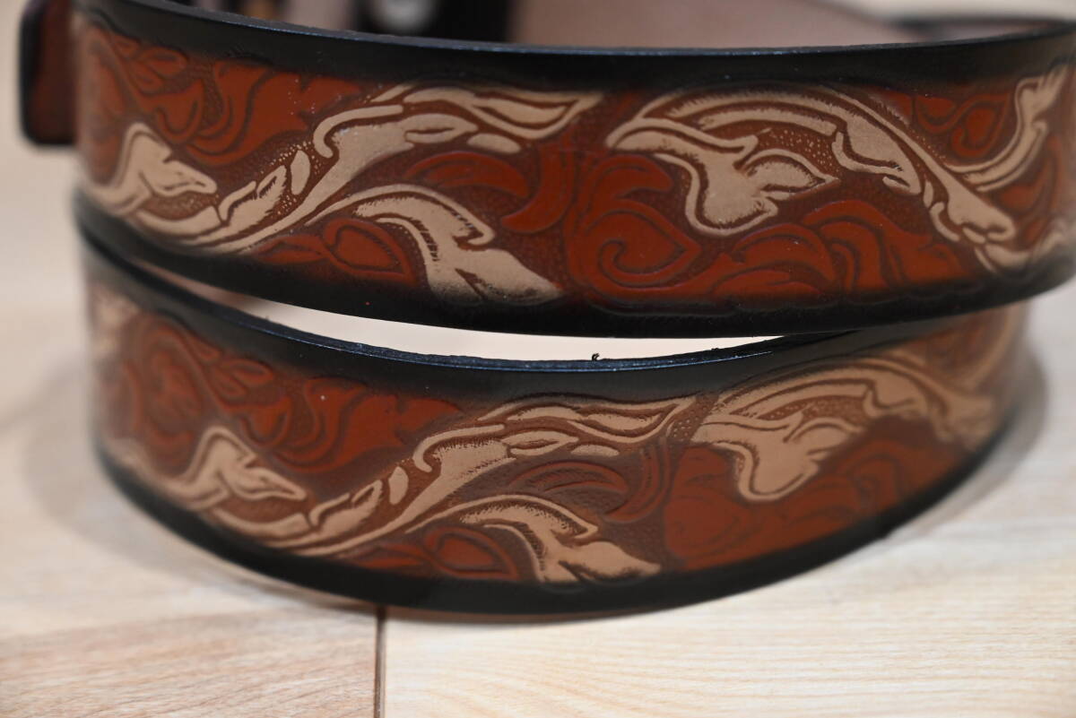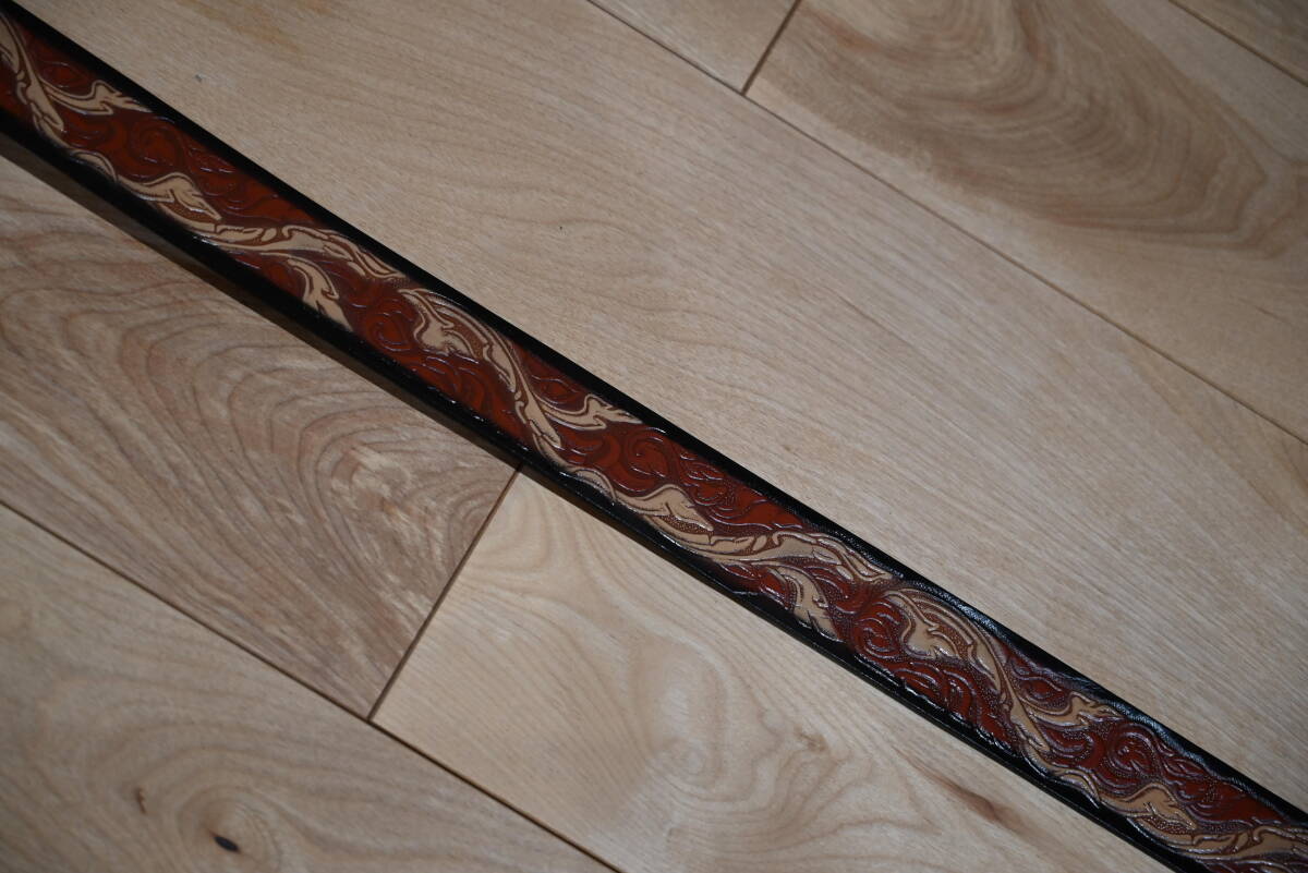商品説明 | 牛革で作成した、カービング柄 カントリースタイルベルトです。 色は濃い茶で、未使用品になります。 サイズは、ベルト本体は108㎝、幅は3.7㎝、革の厚さ3㎜程です。バックルは約縦6.5㎝×横9㎝程になります。 全体に植物の茎を流線状に表現していますので、炎舞の様なデザインになっています。2色でペイント仕上げをしてます。また両淵が黒色で、より表現が引き立つようにデザインしています。 バックルの部分は、ボタンタイプなので、交換も可能になっています。羽を広げた鷲がデザインされた物を採用しています。この点はインパクトが出ています。 ベルトの穴あけは、購入者の方にお願いします。フリーサイズで可能になるよう当方では加工無しの状態で出品致します。 発送は、定形外郵便を利用します。送料は、450円になります。 こちらは、ハンドメイドなので、多少の傷や汚れ等はご了承下さい。細かい点まで、気になる方はご遠慮下さい。 |
