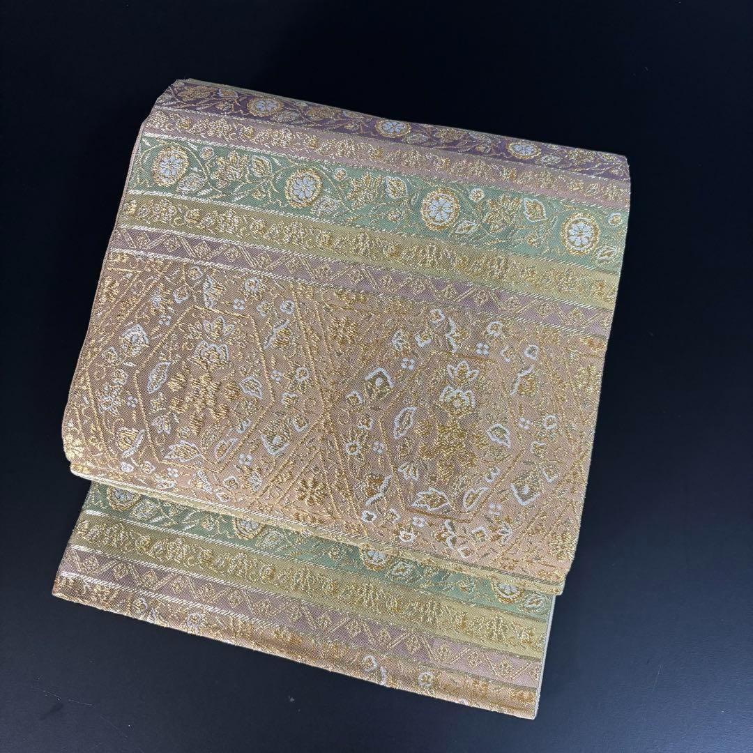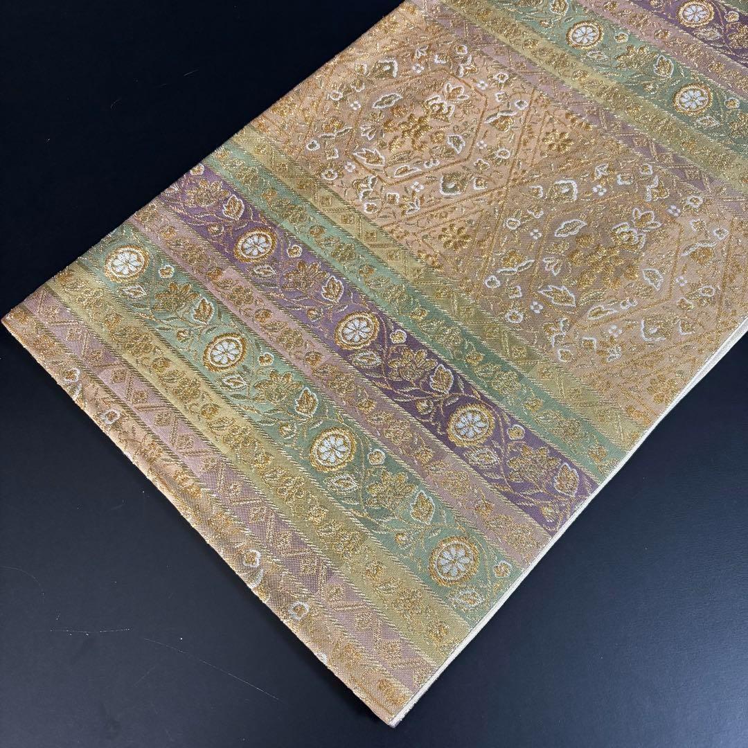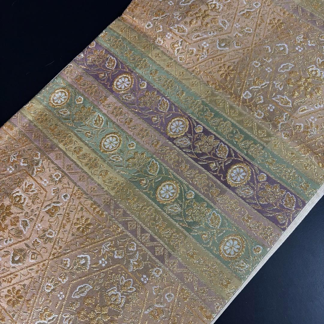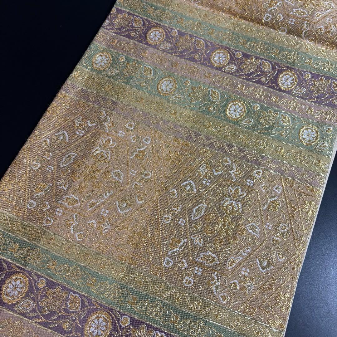 ZY-590 袋帯 金通し 花唐草 オリエンタル 横縞 六通 正絹 高級 特選