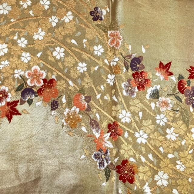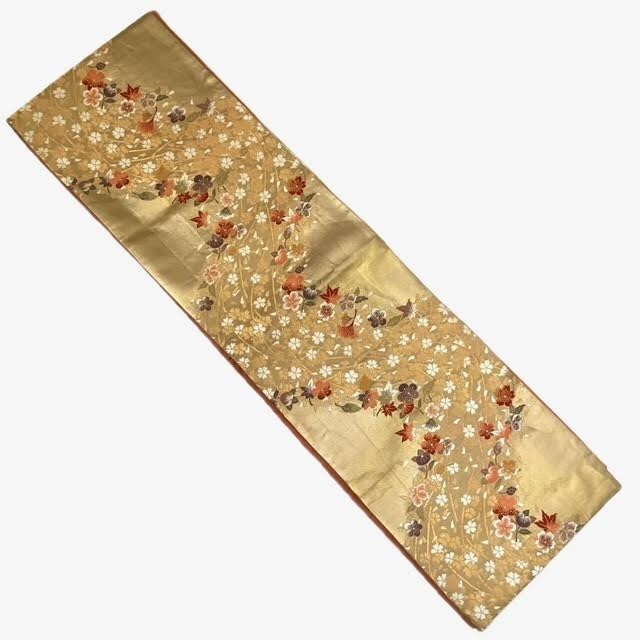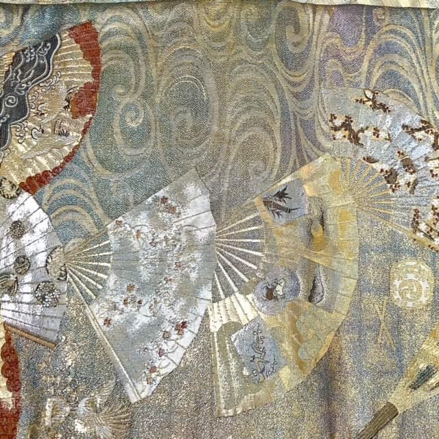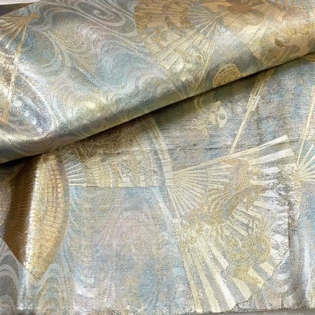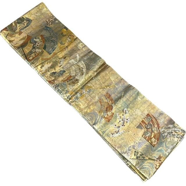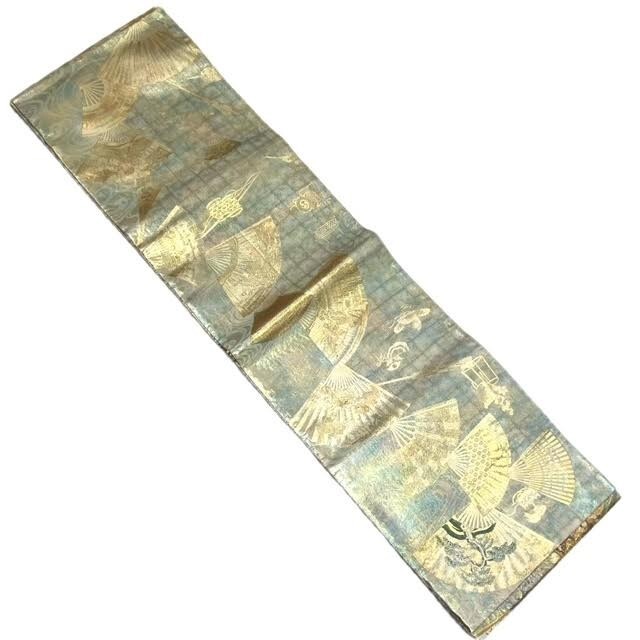 仙17【2点】西陣あさぎ 両面 全通柄袋帯 徳川美術館秘蔵 能楽百扇 純金箔 プラチナ箔 分析通知書付き / 袋帯 秀品 六通 正絹 金糸 桜