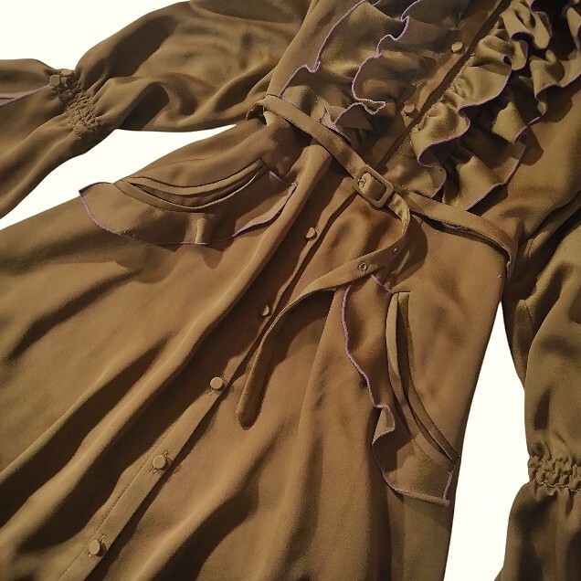 胸元のフリルやベルスリーブデザインが華やかな印象、光沢感のある生地で光に当たると少し色味が変わって見え綺麗です♪