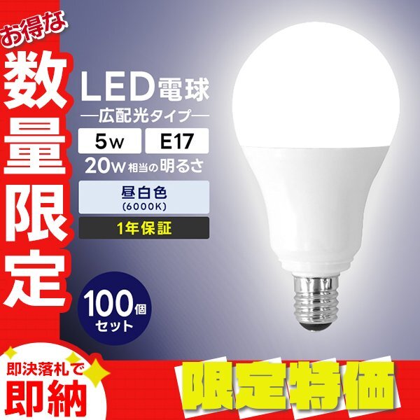 安心の1年保証付き! ECO!省エネ&長寿命のLED電球! 落ち着いた雰囲気の「昼白色」タイプです。 白熱電球・電球形蛍光ランプに近い光の広がりで しっかり照らします。 ご使用中の照明をLEDに変えるだけで、節電効果がUP! さらに約40000時間もの長寿命!!長時間使う部屋や、取り替えにくい所にオススメです。 発熱量が少ないので、光の下にいても暑くありません。 また、LEDの光は、赤外線や紫外線をほとんど含まず、紫外線による色あせなども抑えます。 白熱灯と比べると電気代もかなりお得です♪ ■商品仕様 ■口金:E17 サイズ(約):全長82mm×最大径45mm 消費電力:5W電圧:AC90~130V 50/60HZ 寿命:約40,000時間 ※表示寿命は設計寿命であり、製品の寿命を保証するものではありません。 色温度:昼白色 6000~6500K 全光束:昼白色 400lm 材質:アルミニウム、PC樹脂 PSE取得品 ■商品内容■ LED電球 E17 5W 昼白色×100 ■注意事項■ ・取付・取外しは必ず電源を切った状態で行なってください。 ・ランプはソケットに確実に取り付けてください。 ・リモコンタイプの照明器具は調光器に対応しておりません。・断熱材施工器具と密閉器具にはなるべく使用しないでください、使用寿命の減少の原因になります。・周囲温度が40℃を超える場所や腐蝕性環境では使用しないでください。 ・直流電源では使用しないでください。・点灯中・点灯直後は直接手でふれないでください。 ・水洗いや分解・改造はしないでください。水滴などがかかる場所では使用しないでください。 ・紙や布などでおおったり、燃えやすいものに近つけないでください。(火災、器具過熱の原因) ・電源を入れた状態や電源を切った後しばらくの間は、ランプが熱いので触れないでください。(ヤケドの原因) |