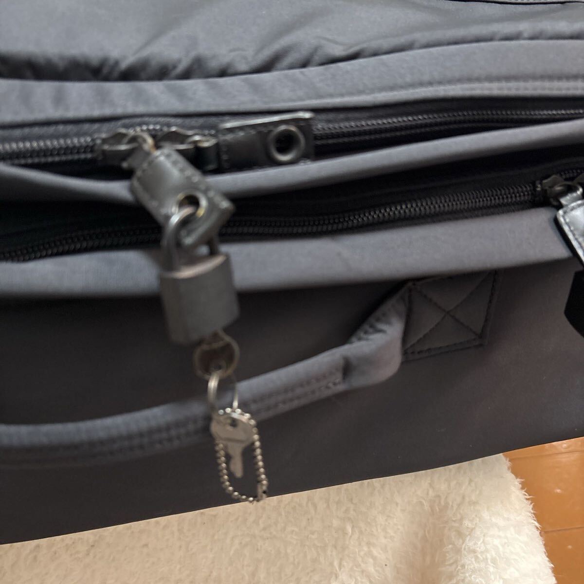 写真の通り、キャリー部分を脱着しショルダーストラップをつけれる2wayタイプで、南京鍵付きです。