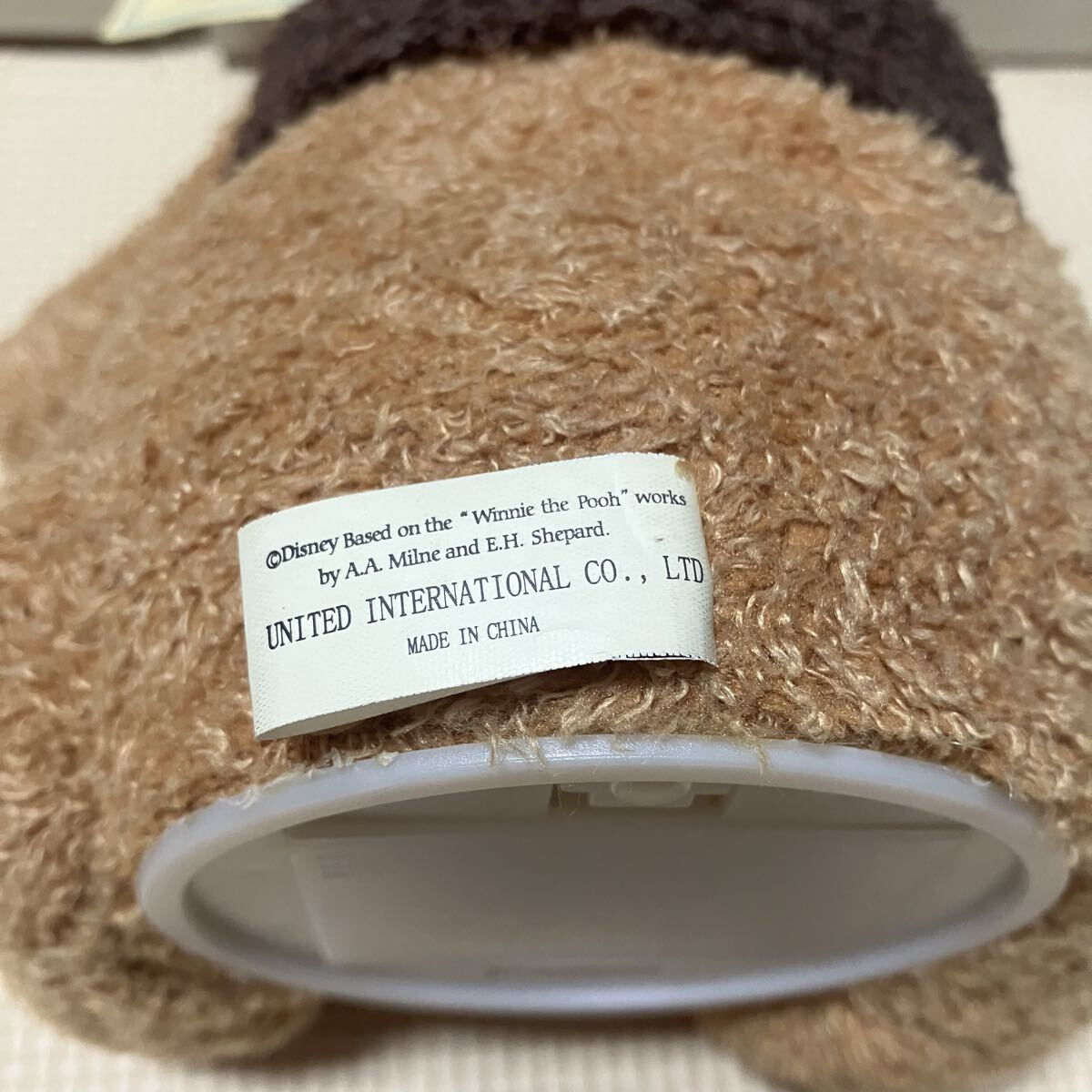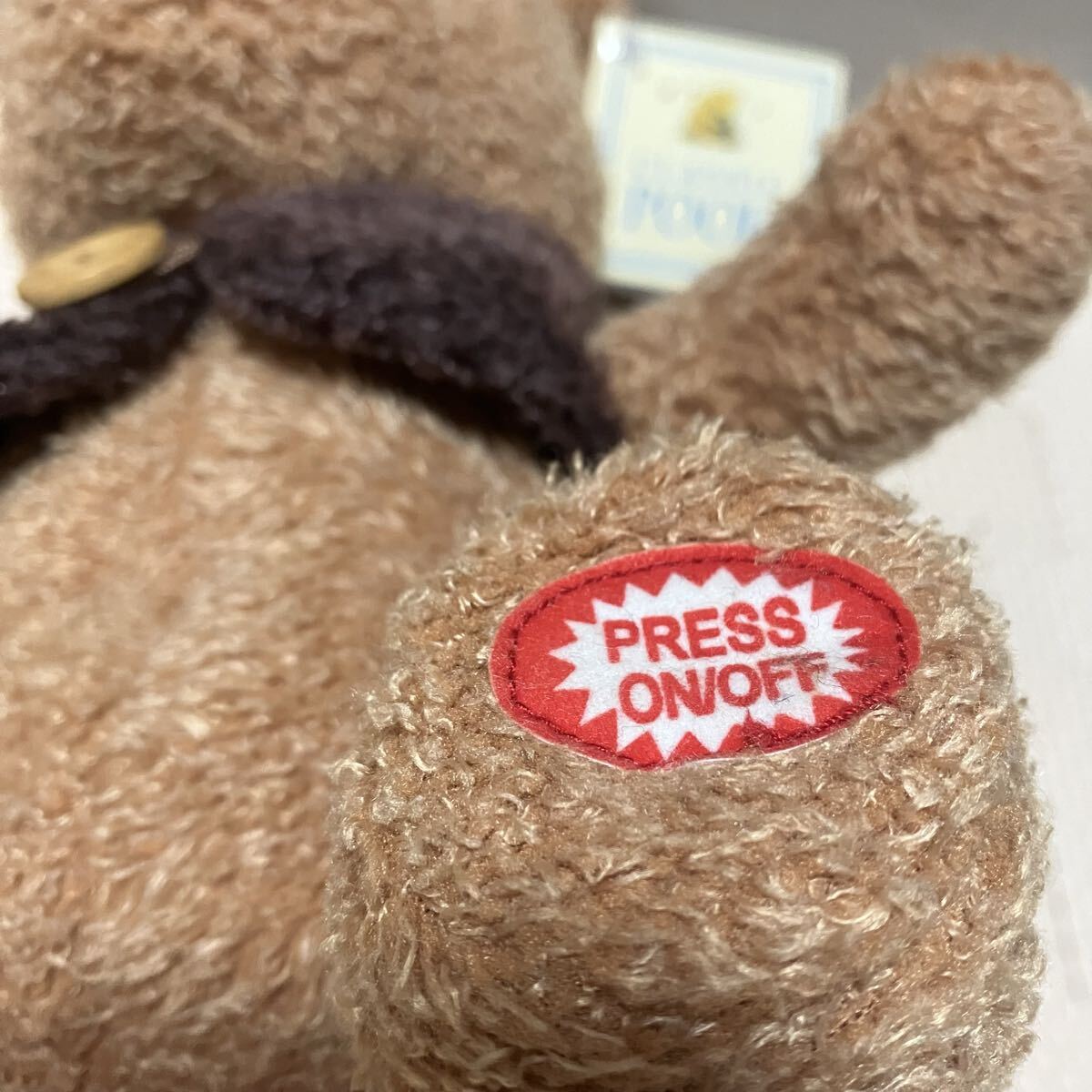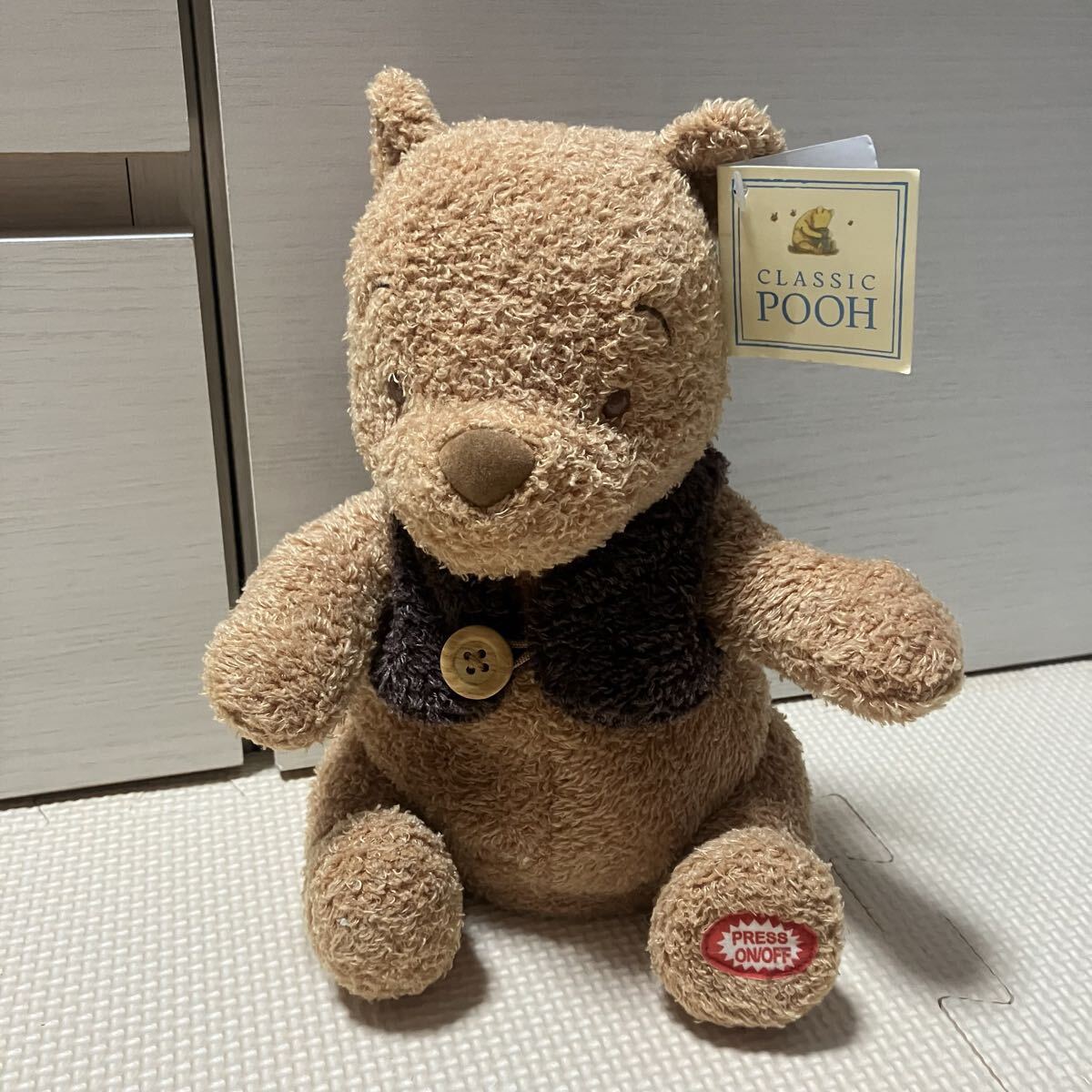 何十年も前のクラシックプーのぬいぐるみです。電池を入れてpushボタンを押すと左右の腕が動いて、音楽が何曲も流れる物でした。現在は経年劣化で壊れてしまい腕は動きませんが、音楽は電池を入れると何曲も流れます。腕は傾いたまま動かなくなったので、写真のままの状態です。ジャンク品です。