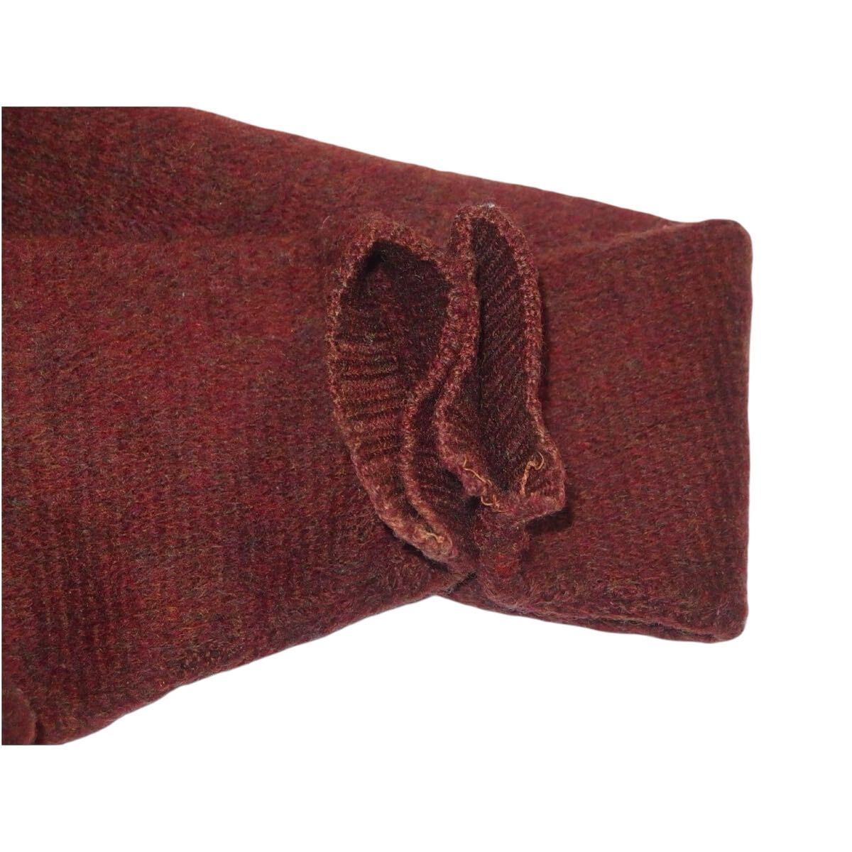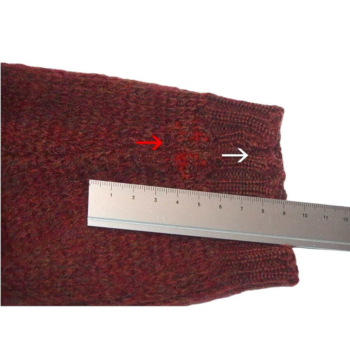 赤矢印の箇所に当時に施したと思われる補修が赤い毛糸で施されてます、とても丁寧に行われており良いディテールです。白い部分は指摘されないと分からないかと思いますが少し解れていたので自ら補修しました。
