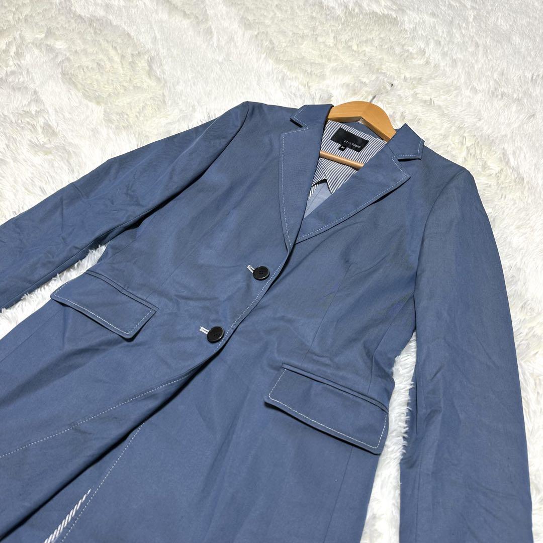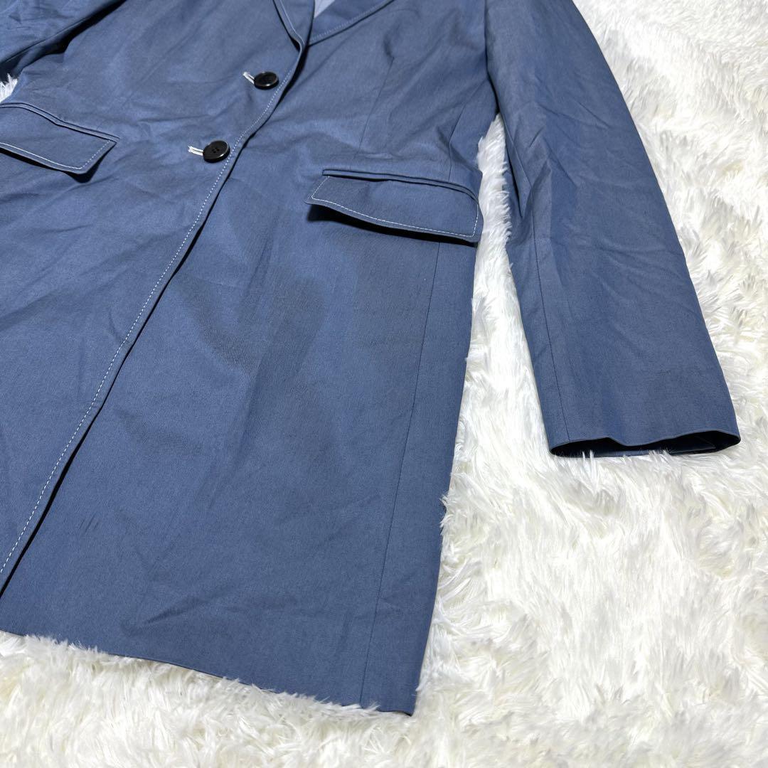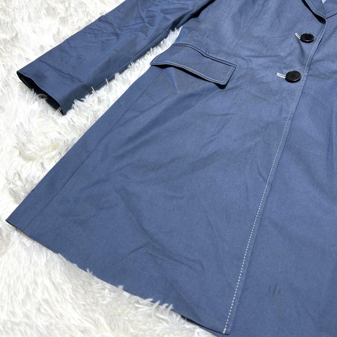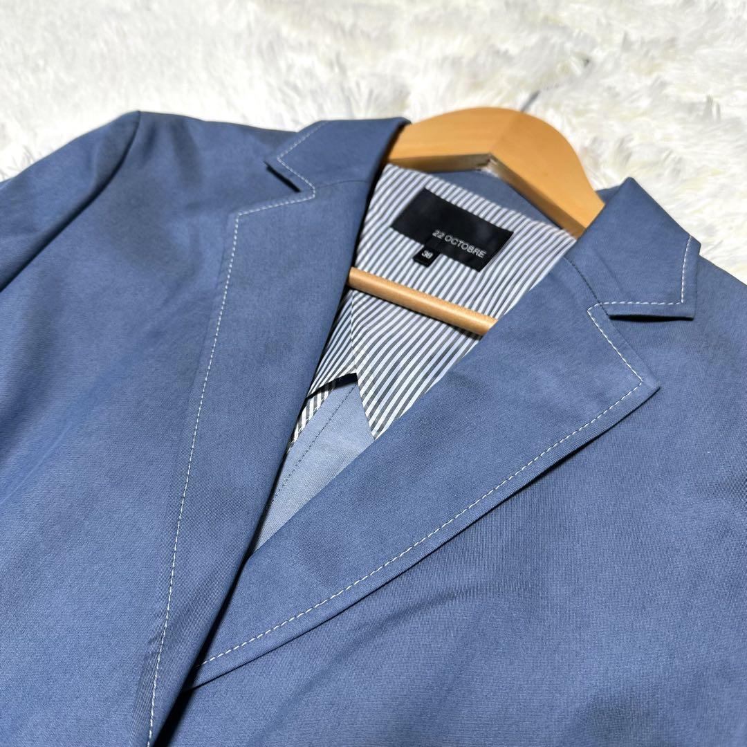 ブルーのロングコートです。高品質な素材で仕上げられたこのコートは、ビジネスシーンにもカジュアルな場面にも対応できる万能アイテム。襟元とポケットのデザインが上品さを引き立て、サイズは38(Mサイズ相当)で、22 Octobreのタグ付き。軽やかな着心地と洗練されたシルエットで、秋冬のコーディネートにぴったり。