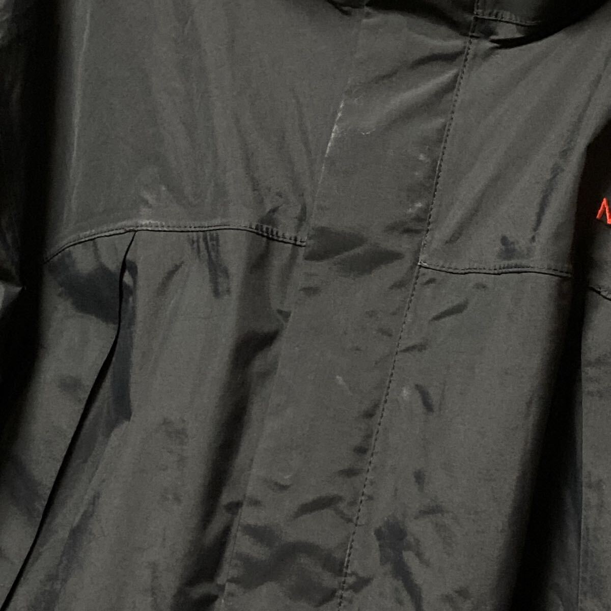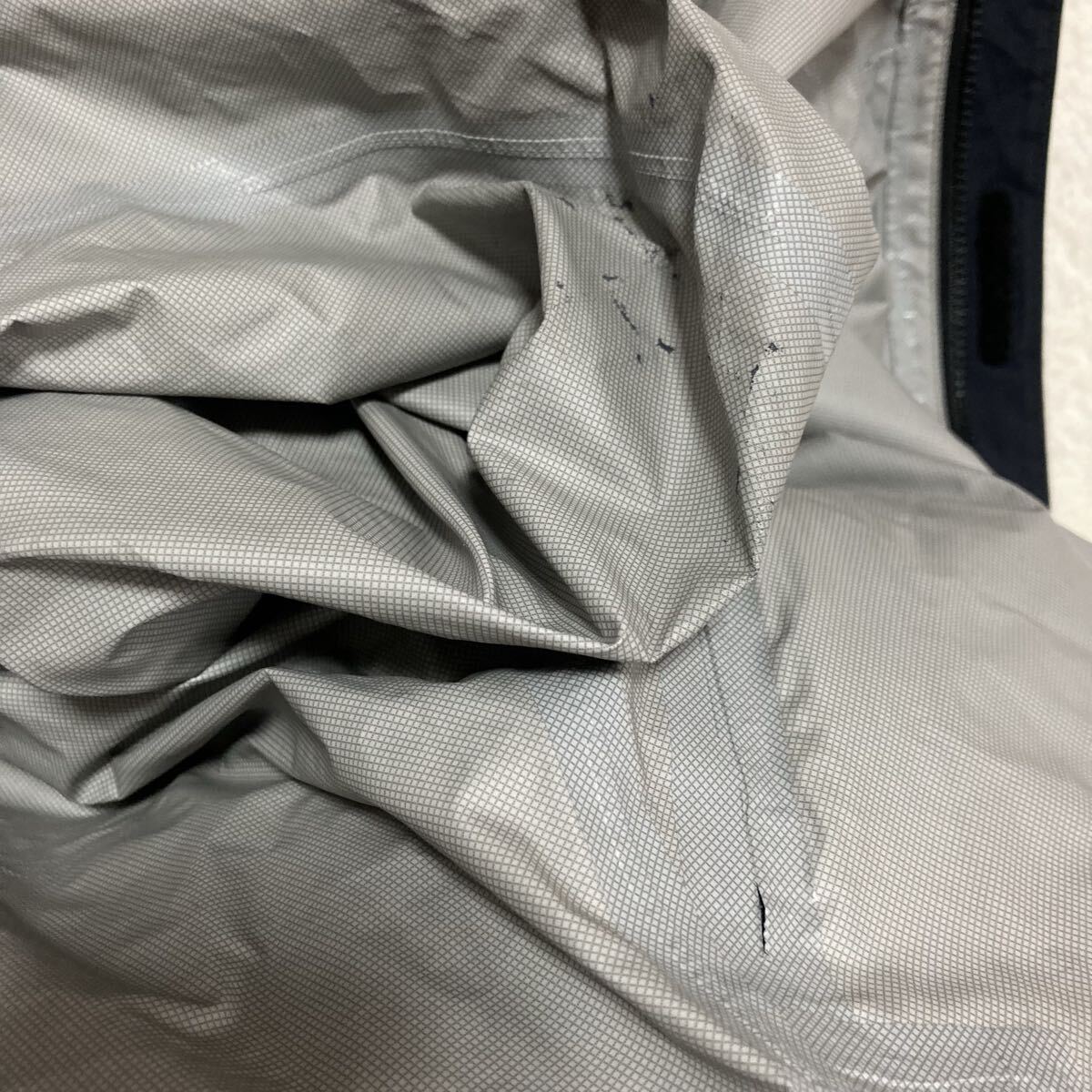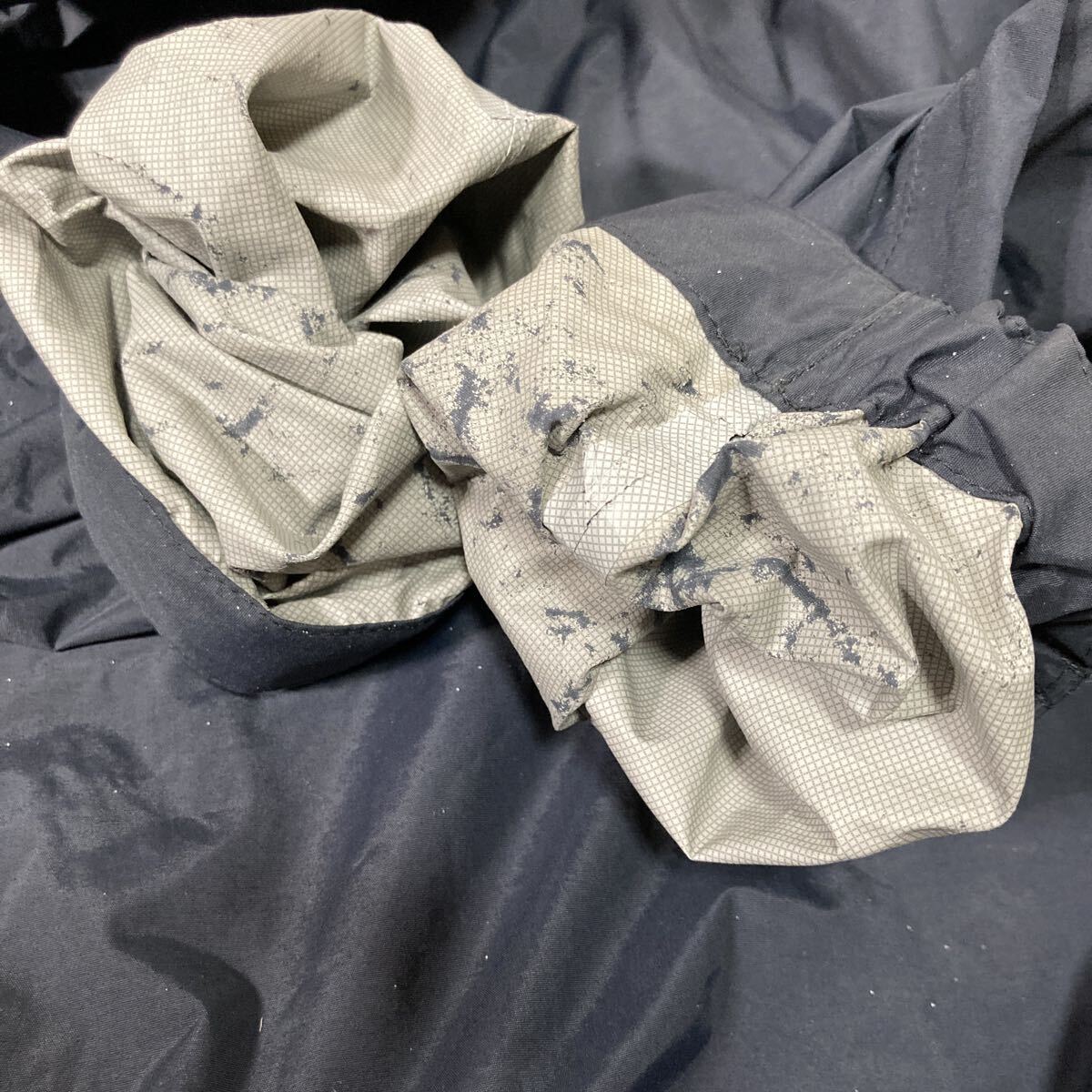 外側:若干の着用感有り、微かなテカリ有り、メンファスナーに繊維付着有り