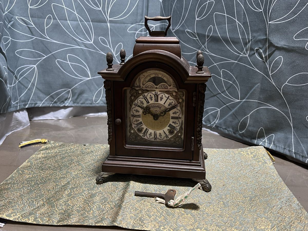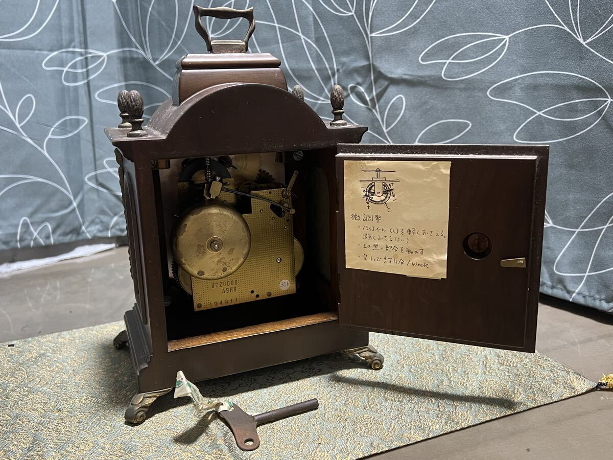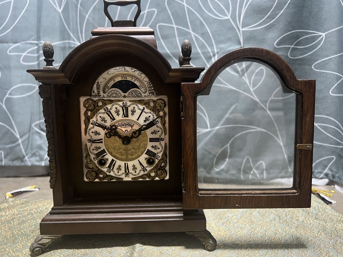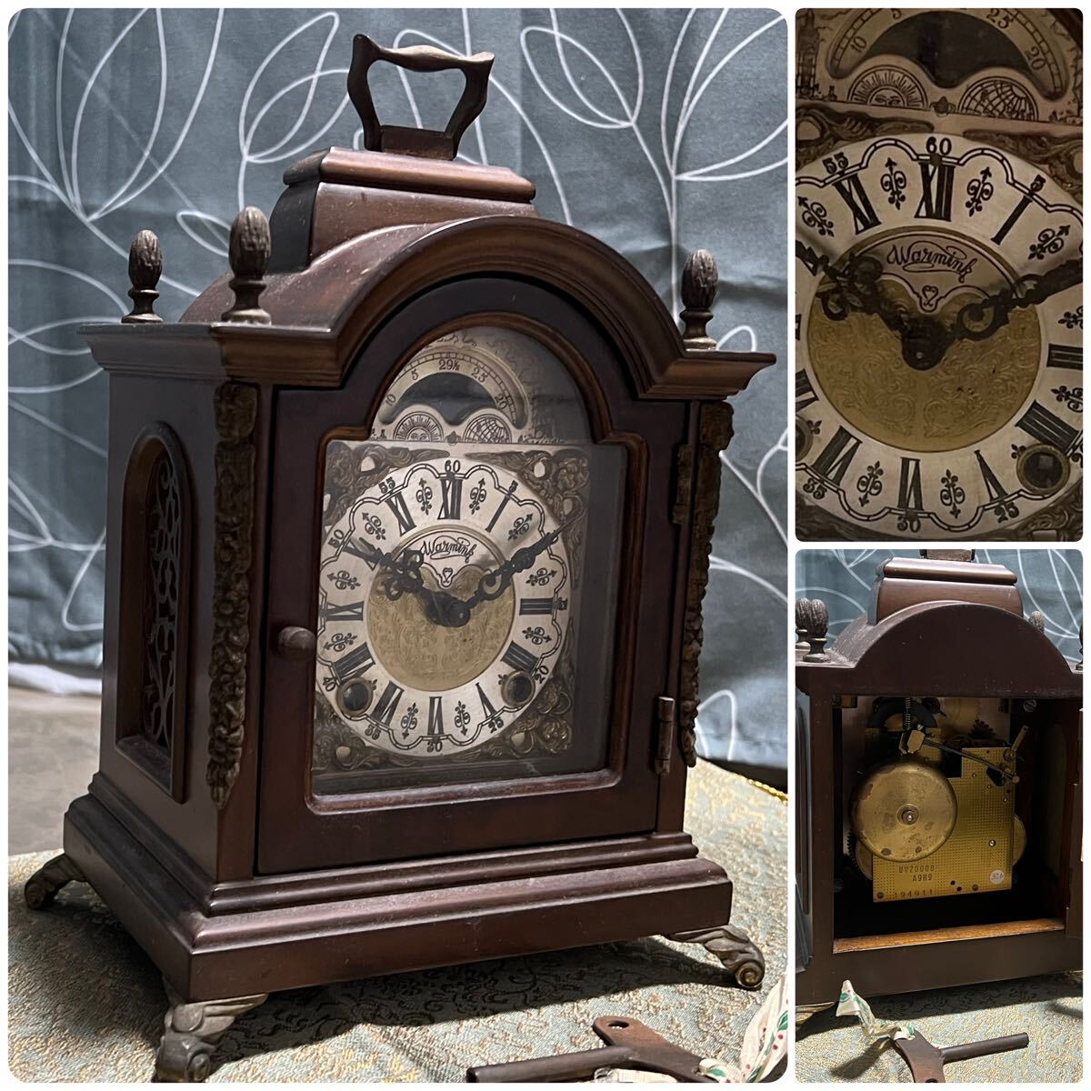 オランダのワルミンク(Warmink)社製のWUBAアンティーク置き時計 ダークブラウンの木製アンティーク置時計、手巻き式で鍵付き。 - 素材: 木製 - デザイン: アンティークスタイル - 機能: 手巻き式 - 色: ダークブラウン - 付属品: 鍵付き - 社名: ワルミンク(Warmink) - 旧社名: Warmink Uurwerken en Barometers Almelo(WUBA) - タイプ: 卓上時計、置き時計 - サイズ: 幅17×奥行12×高さ24cm - スタイル: ローマ数字の文字盤に、エンジェルの装飾や月齢表示(ムーンフェイズ) - 製造国: オランダ ご覧いただきありがとうございます。 個人の不用品出品ですので、納品書等用意ございません 領収書ですが、ヤフオクから手数料を差し引いた分が売上金となりますので、ヤフオク様への入金履歴が領収書代わりになります よろしくお願い致します