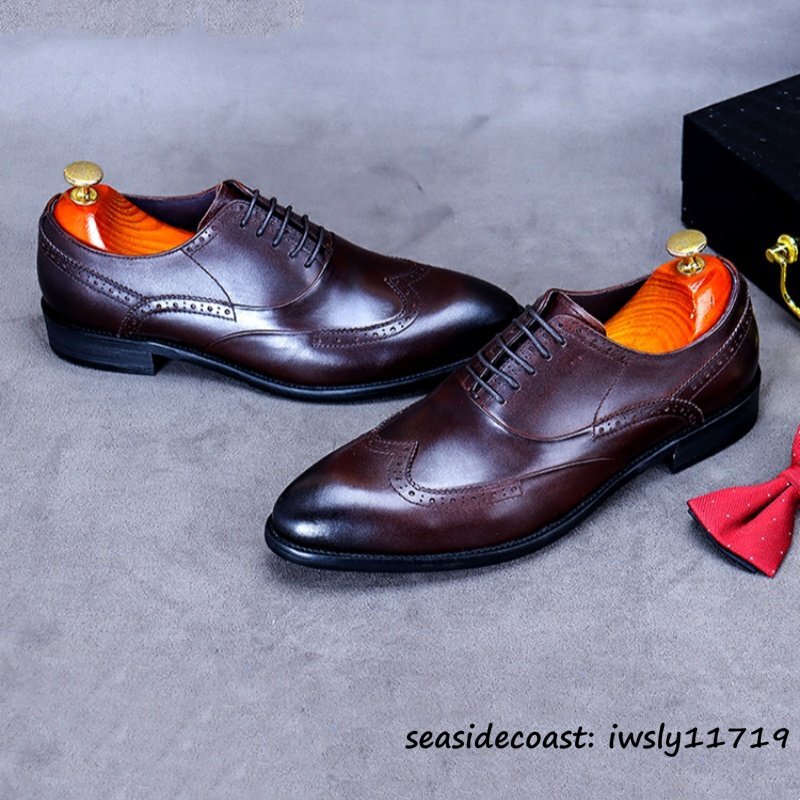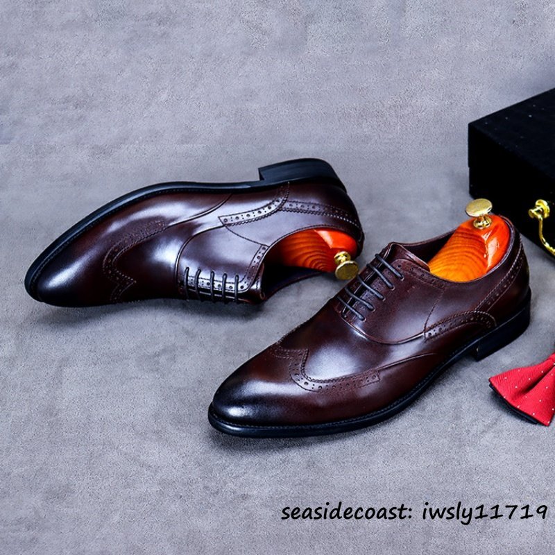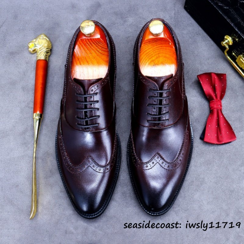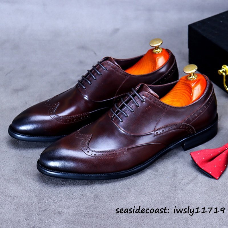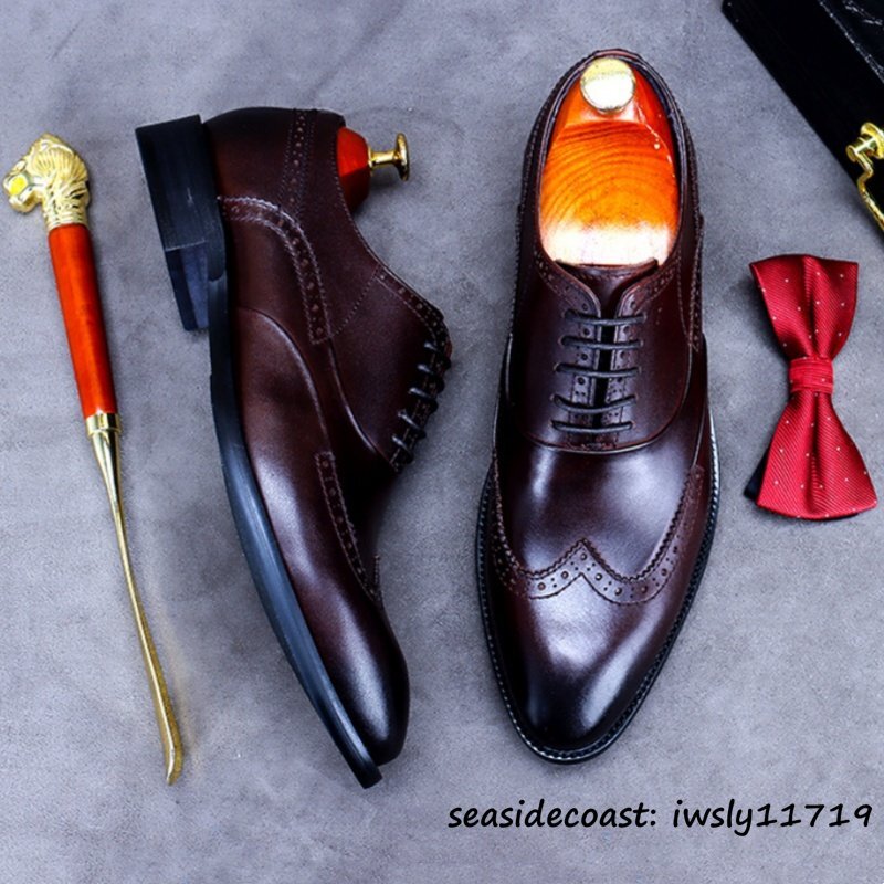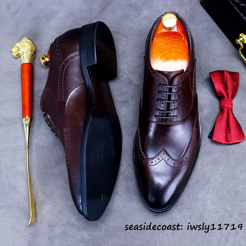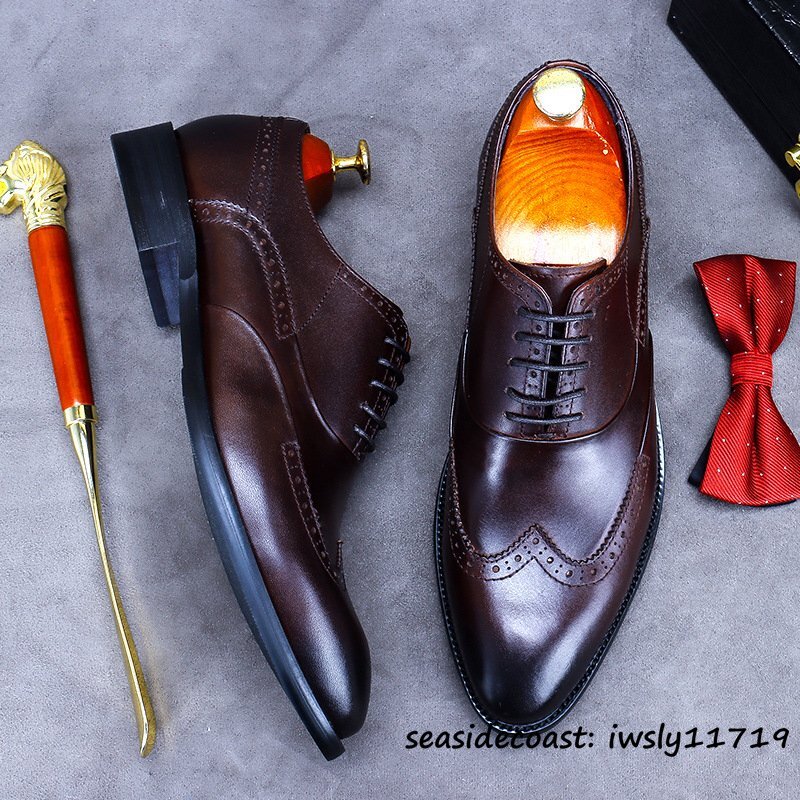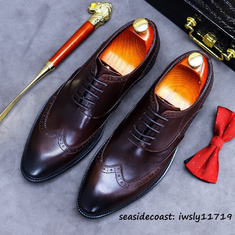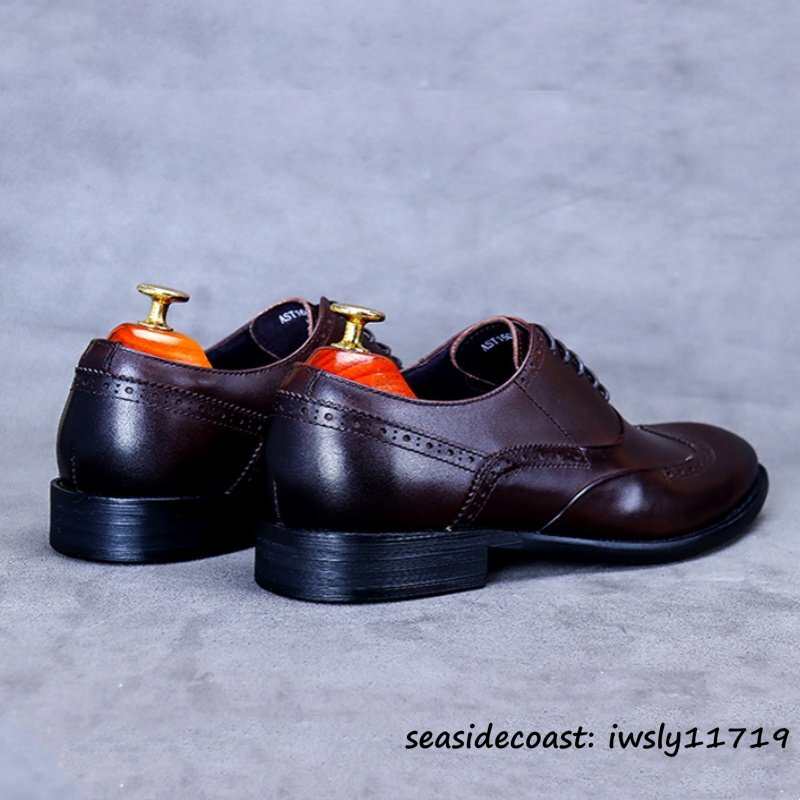 入手困難◆ビジネスシューズ 本革 超希少 職人手塗り上げ レザーシューズ 牛革 彫り 新品 冠婚葬祭 シンプル フォーマル 珈琲色 24.5cm