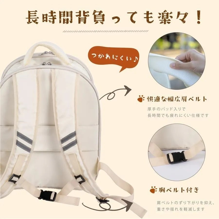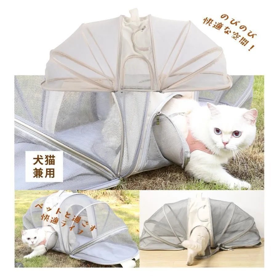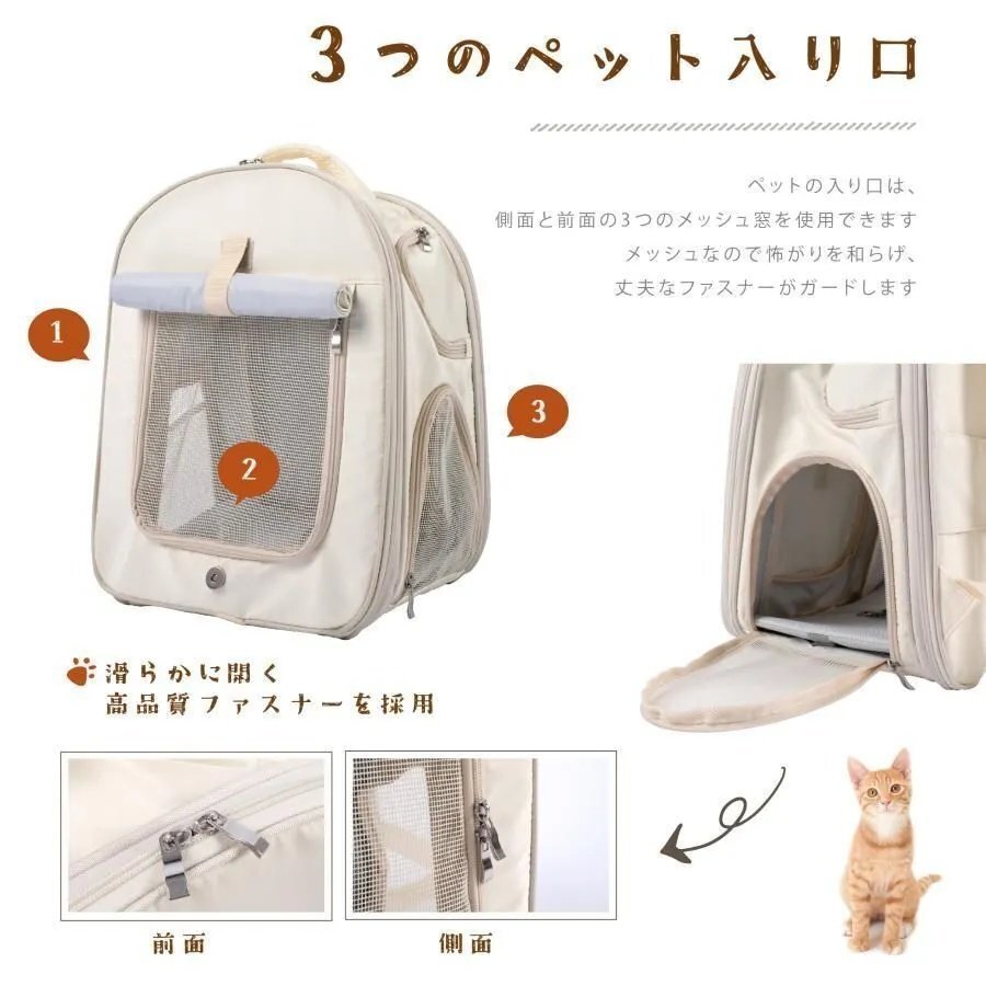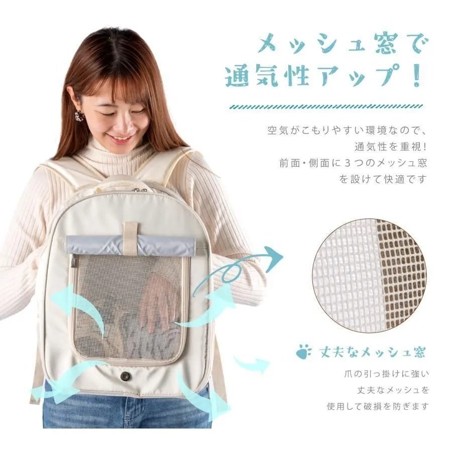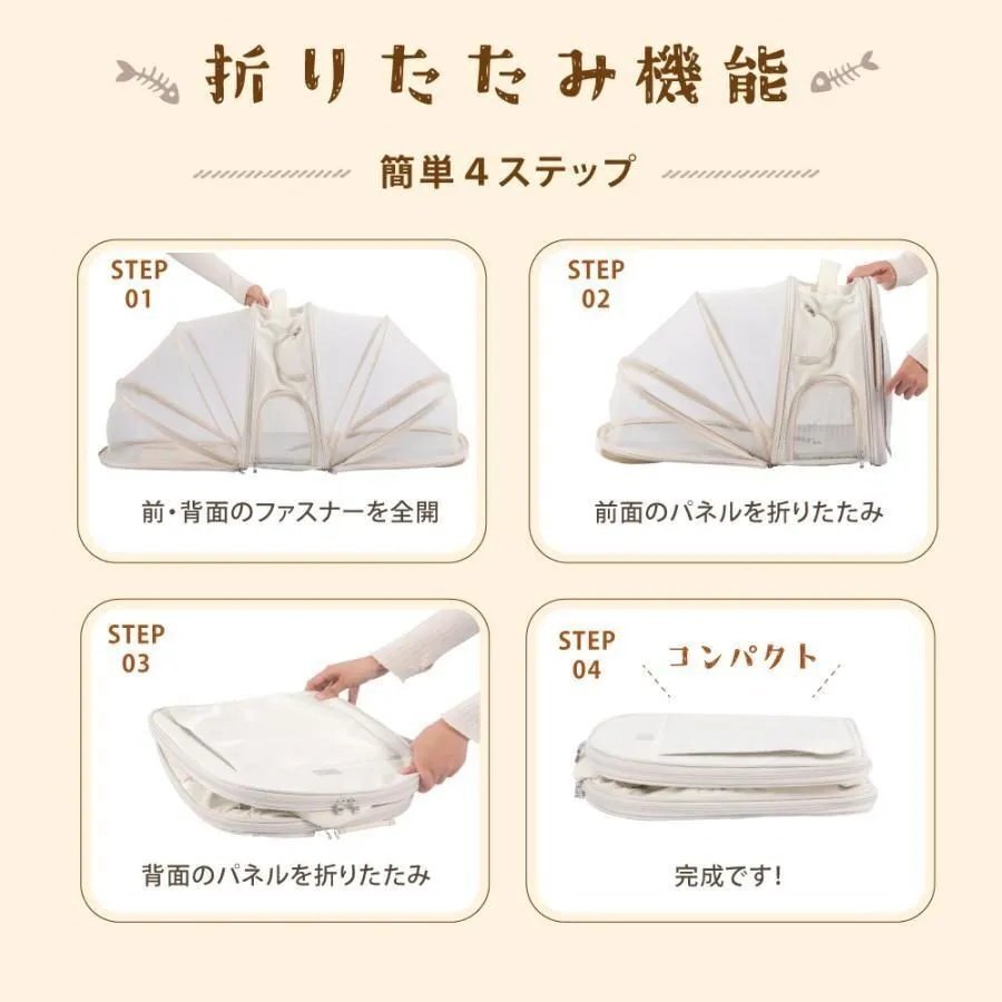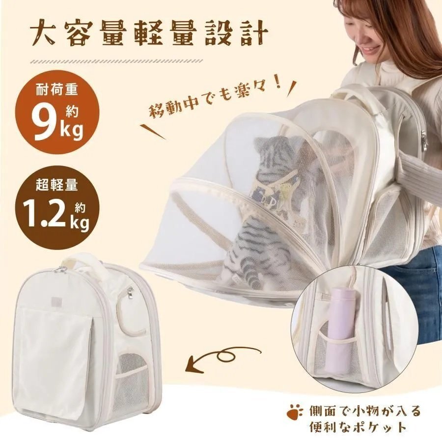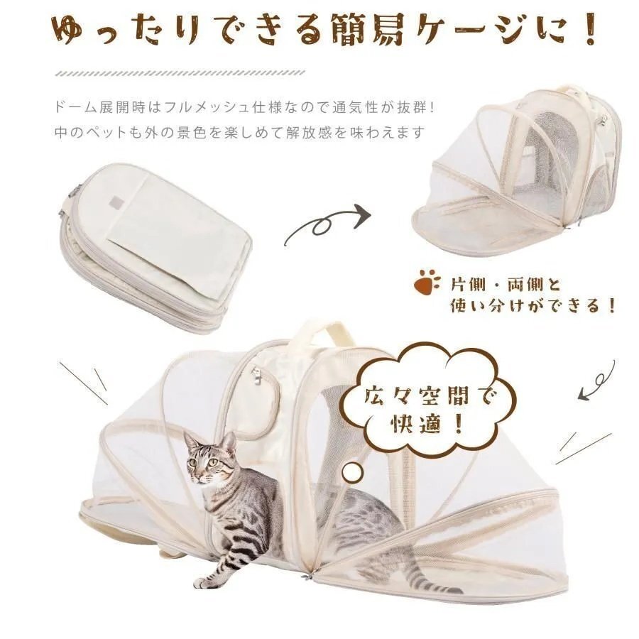 【折りたたみ】ドーム展開時はフルメッシュ仕様なので通気性が抜群!中のペットも外の景色を楽しめて解放感を味わえます。片側・両側と使い分けができる!ペットとのお出かけに快適なキャリーリュックバッグ。車や電車、飛行機、バスなどの移動時や通院時、災害時など、さまざまなシーンで活躍できます。 【便利な持ち運び】持ち運びはリュック・手持ち・背面ベルトはにキャリーオンシーンに合わせて使い分けできます。長時間背負っても楽々!厚手のパッド入りで長時間でも疲れにくい仕様です。肩ベルトのずり下がりを抑え、重さや揺れを軽減します。 【大容量軽量設計】厚みのある生地と底板は、適正体重で猫9kg、犬6kgの耐久性ペットが中で動き回ったり暴れたりしてもしっかりと守ります。側面で小物が入る便利なポケット。底板は面ファスナー式で取り外しが可能折りたたむと、厚さ約7cmに使わない時は省スペースに収納できます。 【製品仕様】展開サイズ :約W102xD32xH39cm / 収納サイズ :約W32xD7xH39cm /カラー:アイボリー / 材質:ポリエステル100%/ 重量:約1.28kg