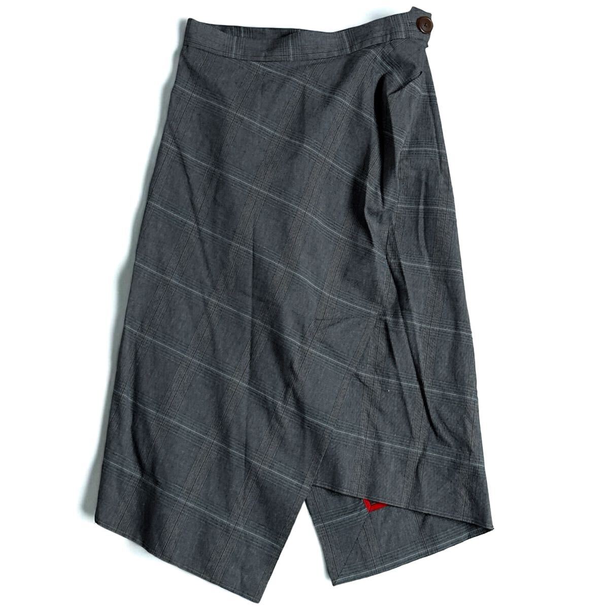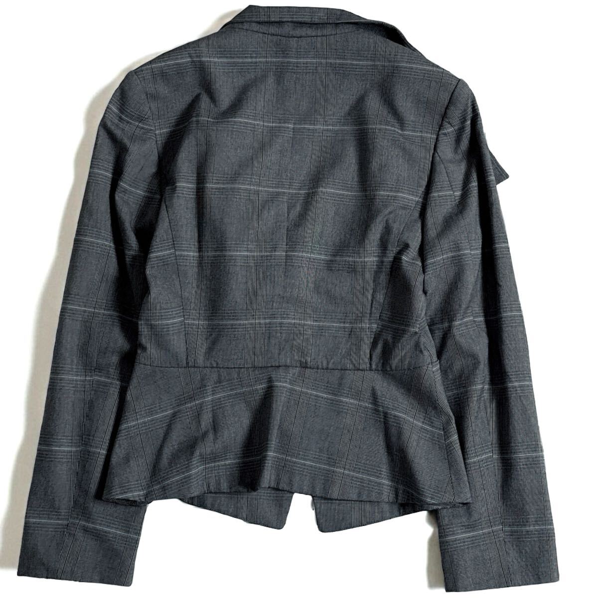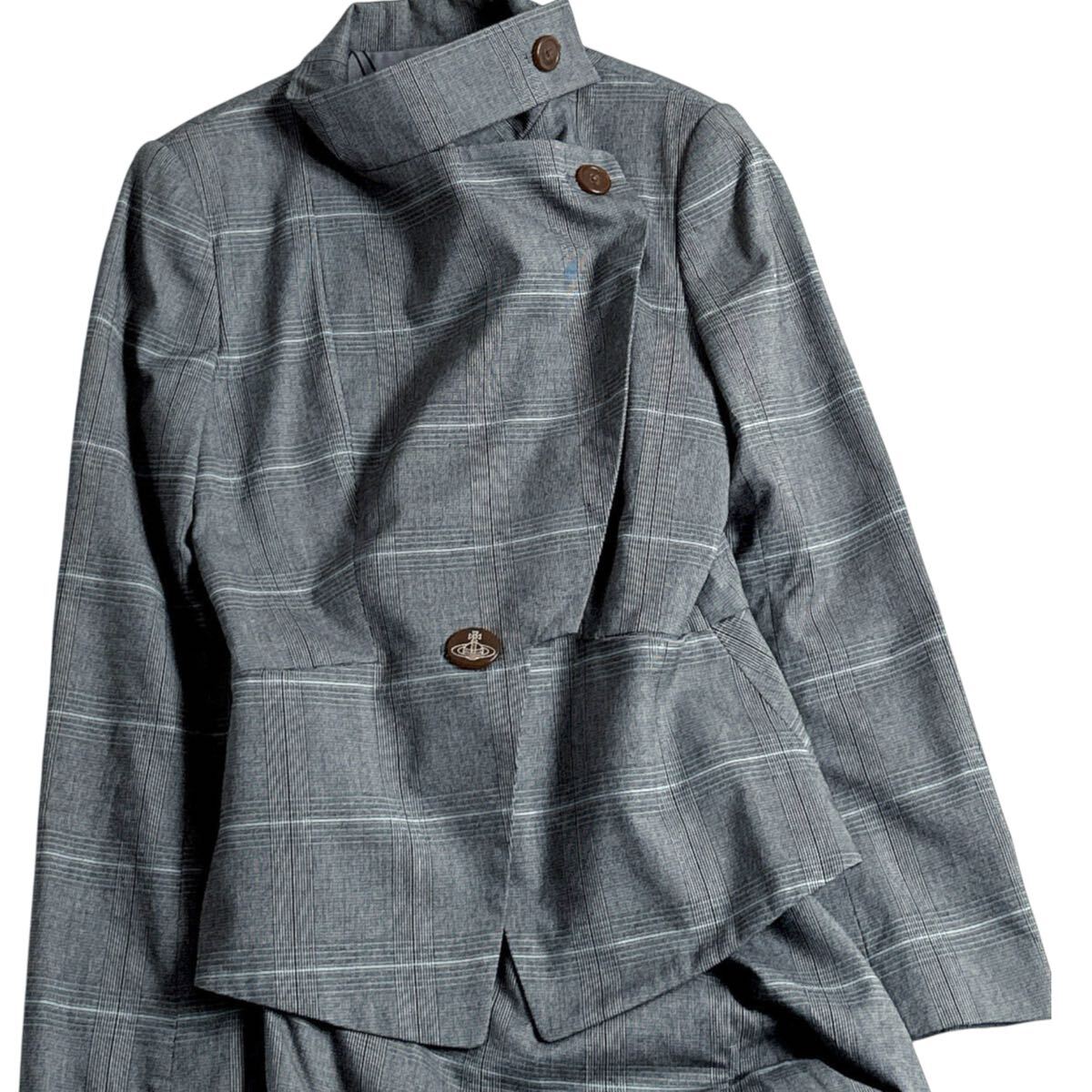 クラシカルなチェック柄に、ヴィヴィアンらしい独特のカッティングが映えるデザイン。ウエストを美しくシェイプしつつ、アシンメトリーなジャケットとタイトスカートが知的で女性らしい印象を演出します。ビジネスシーンはもちろん、特別なシーンやフォーマルにも活躍する逸品です。
