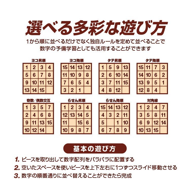 1から順に並べる基本の遊び方だけでなく、独自ルールを定めて並べることで、就学前学習など数字の予備学習としても活用することもできます。