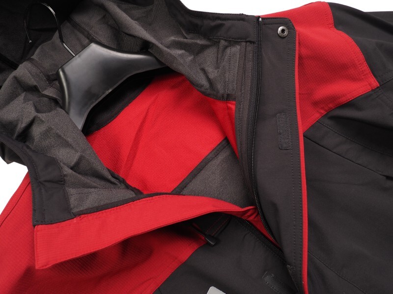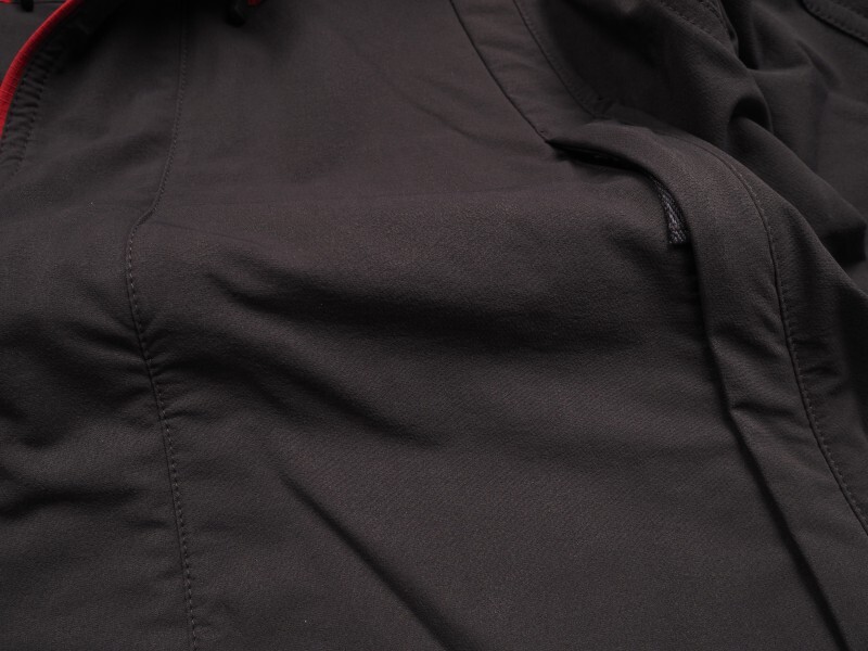 撥水・防汚加工を施した生活防水のストレッチソフトシェル生地を使用しています。負荷のかかる肩と腕の一部を更に強靭なリップストップ生地で切り替えています。