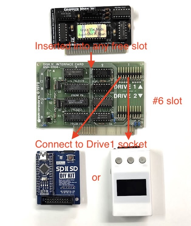 Apple II の視点から見ると、Apple II は Disk II カードをSmartPortデバイスのホストカードとして使用するため、Grappler Minus カードは単独では機能しません。 *Grappler Minus カードは、常にDisk II カードとセットで使用します。