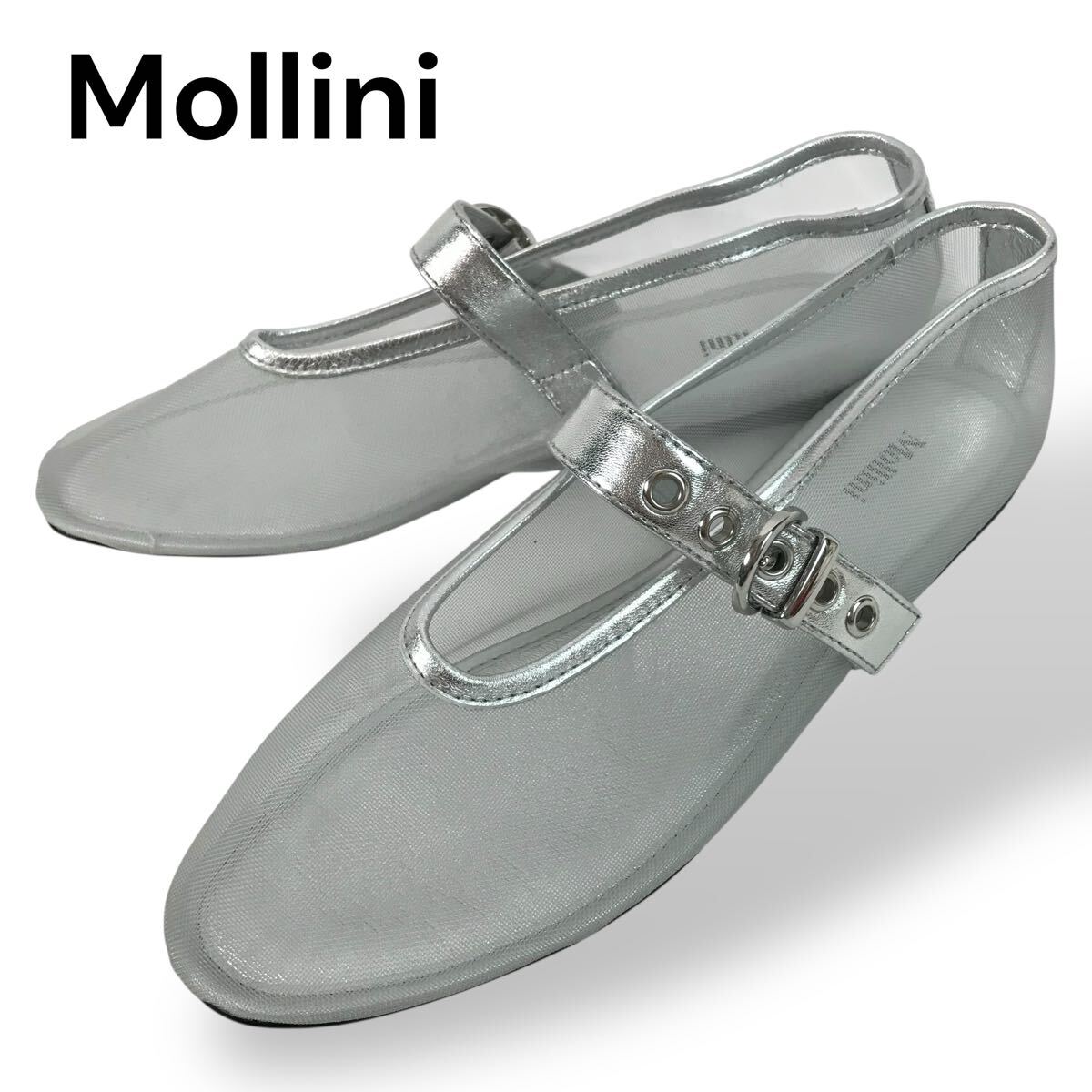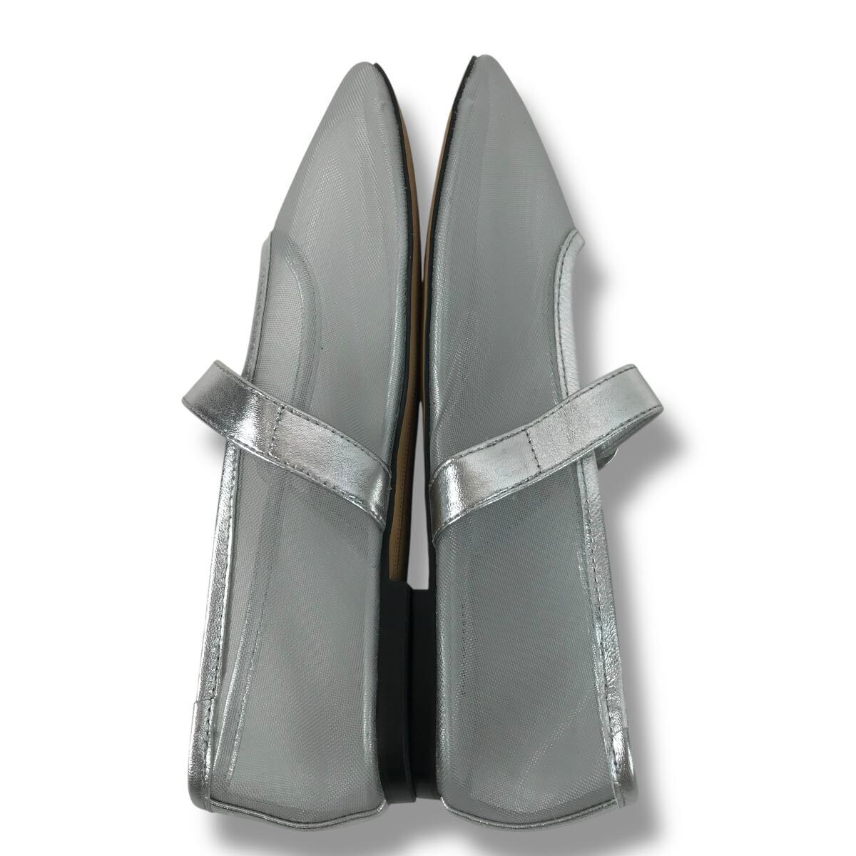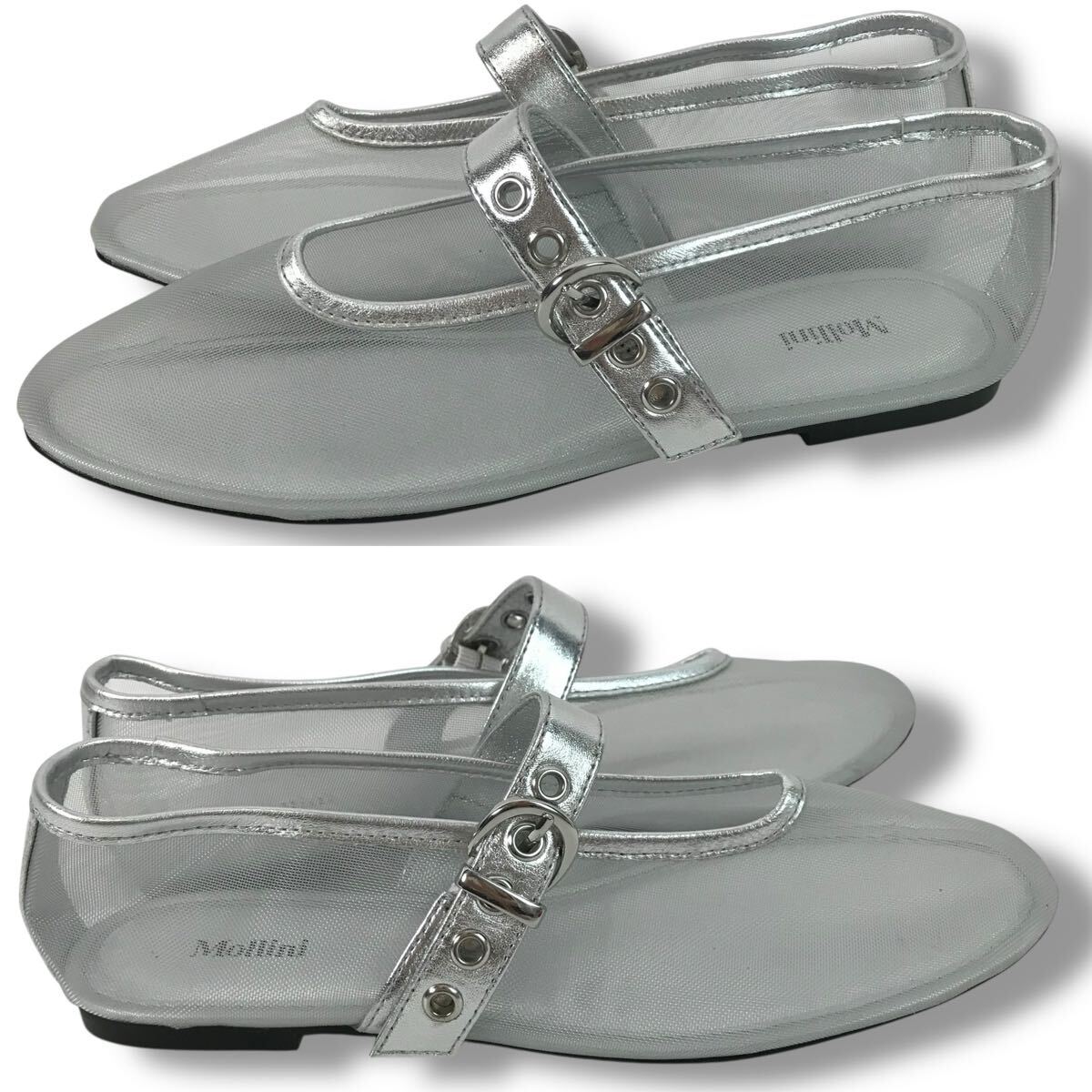 d76 未使用 Mollini モリーニ メッシュ フラットシューズ パンプス シルバー ベルトデザイン 37 レディース 正規品 ローファー