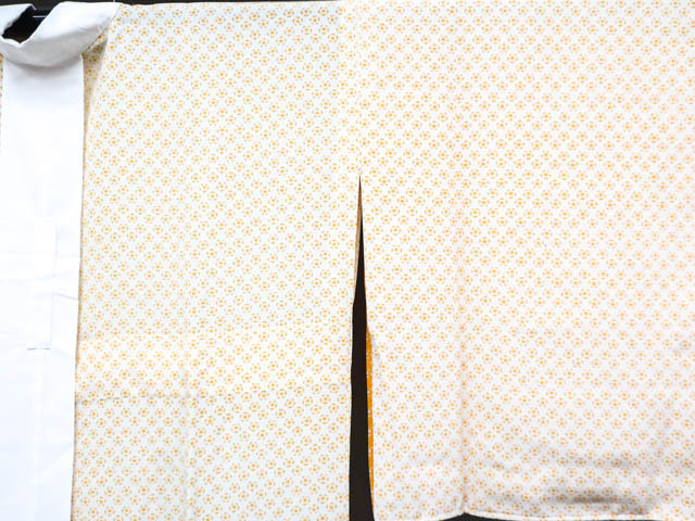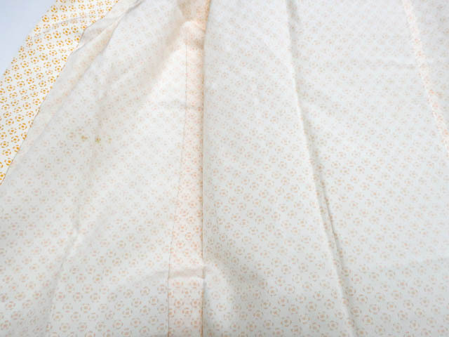 リサイクル商品のため、衿汚れ、右前身頃、裏にシミがございますがご使用頂けると存じます。 地色は生成り・橙です。 1枚目の画像が近いお色かと思われます。 素材は正絹です。 |