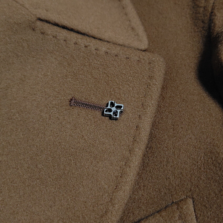 ◆備考:ダブル6つボタン、袖ボタン開き見せ仕様、センターベント、ピンバッチ付き