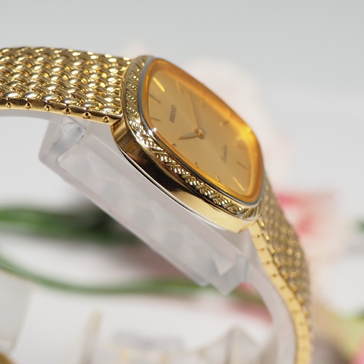 セイコーエクセリーヌのリューズに1Pダイヤが付いたレディース腕時計です。 稼働品で除菌クリーニング致しておりますのですぐにご使用いただける状態です。 ☆管理番号:H348 ☆稼働品 ☆クリーニング (超音波洗浄+エタノール除菌クリーニング) ☆防水:- ☆ムーブメント:クォーツ ☆素材:ステンレス ☆電池交換:新品電池交換済(2025/10) 【サイズ】 ◇ケース幅約21mm×21mm(リューズ含まず) ◇厚さ約5mm ◇腕回り約160mm 【カラー】 ◇文字盤:ゴールド ◇ケース:ゴールド ◇ベゼル:ゴールド ◇ベルト:ゴールド 【状態】 ◇A ☆ケース:ほぼキズなし ☆ベゼル:キズなし ☆ガラス:キズなし ☆裏蓋:わずかに薄キズ ☆ベルト:キズなし ☆その他特記事項:- 【付属品】 ◇本体のみ ※公安委員会の古物商許可証の元古物市場(コメ兵、ブランドオフ、エコリング等)にて購入したものです。 全て【正規品保証】致します。 過去1度も経験はございませんがコピー品であった場合返品返金対応をさせていただきますので安心してご購入下さい。 |
