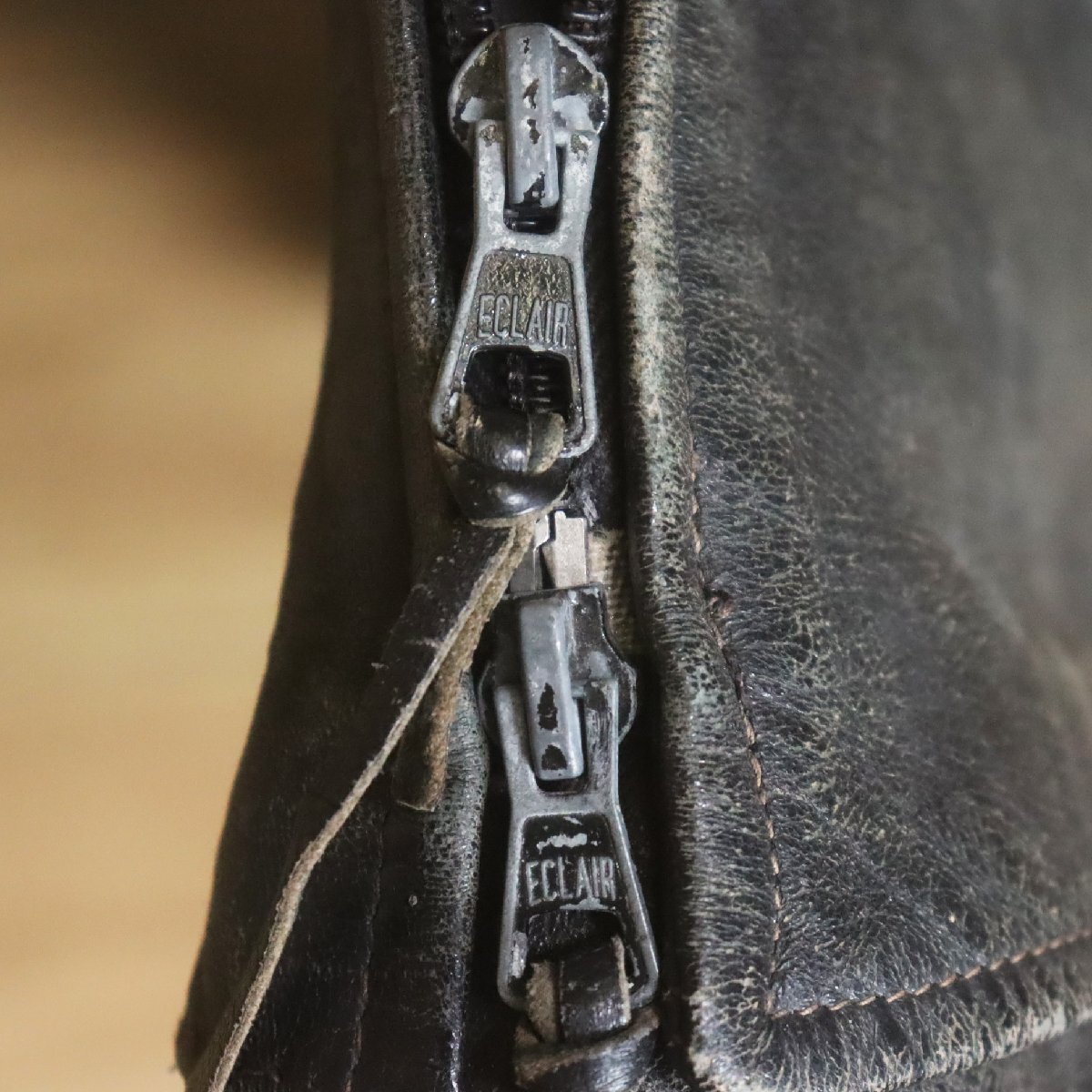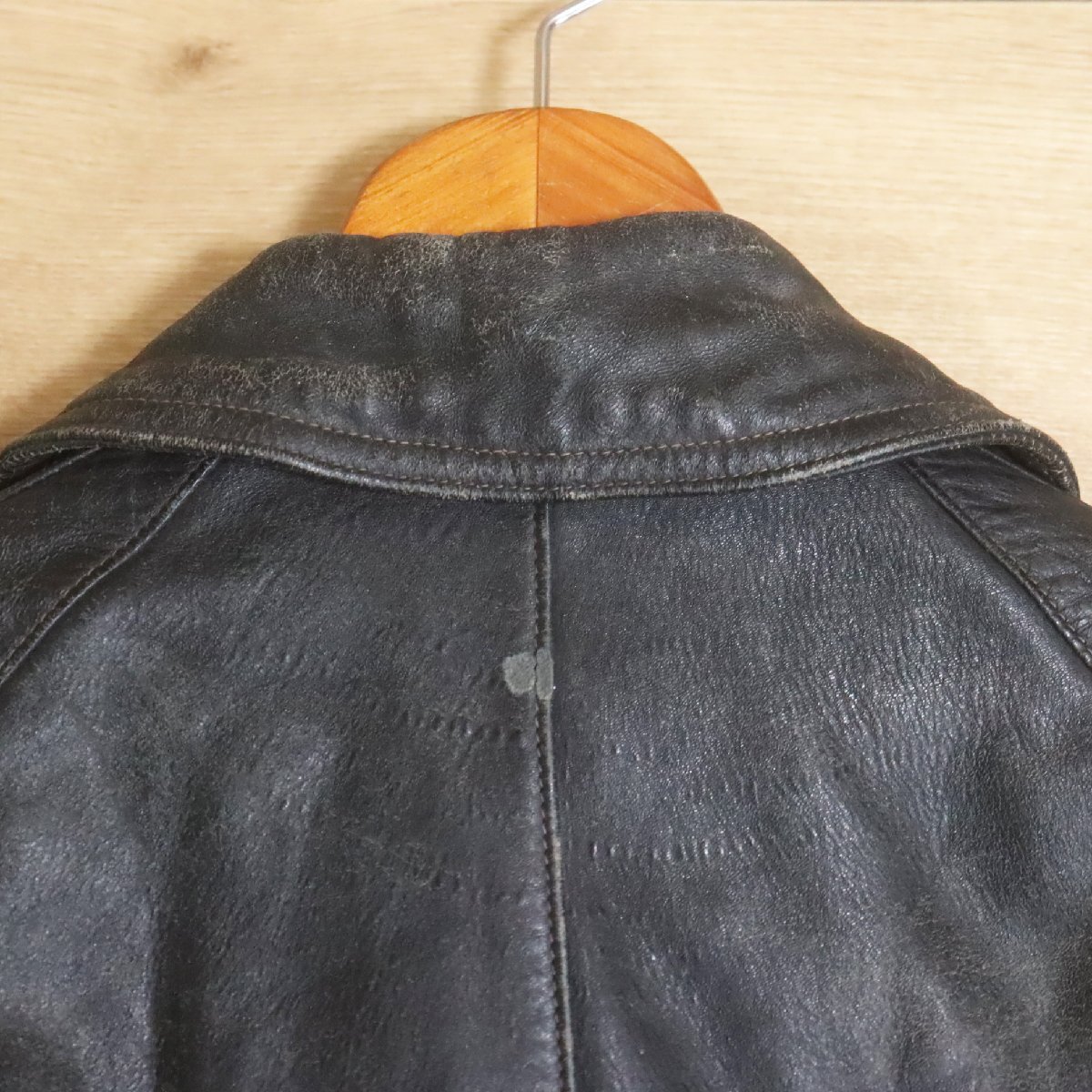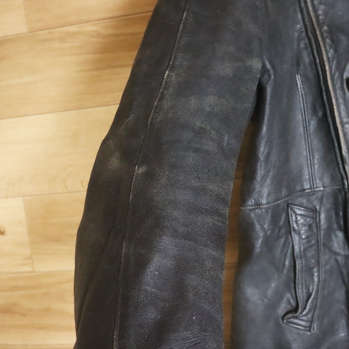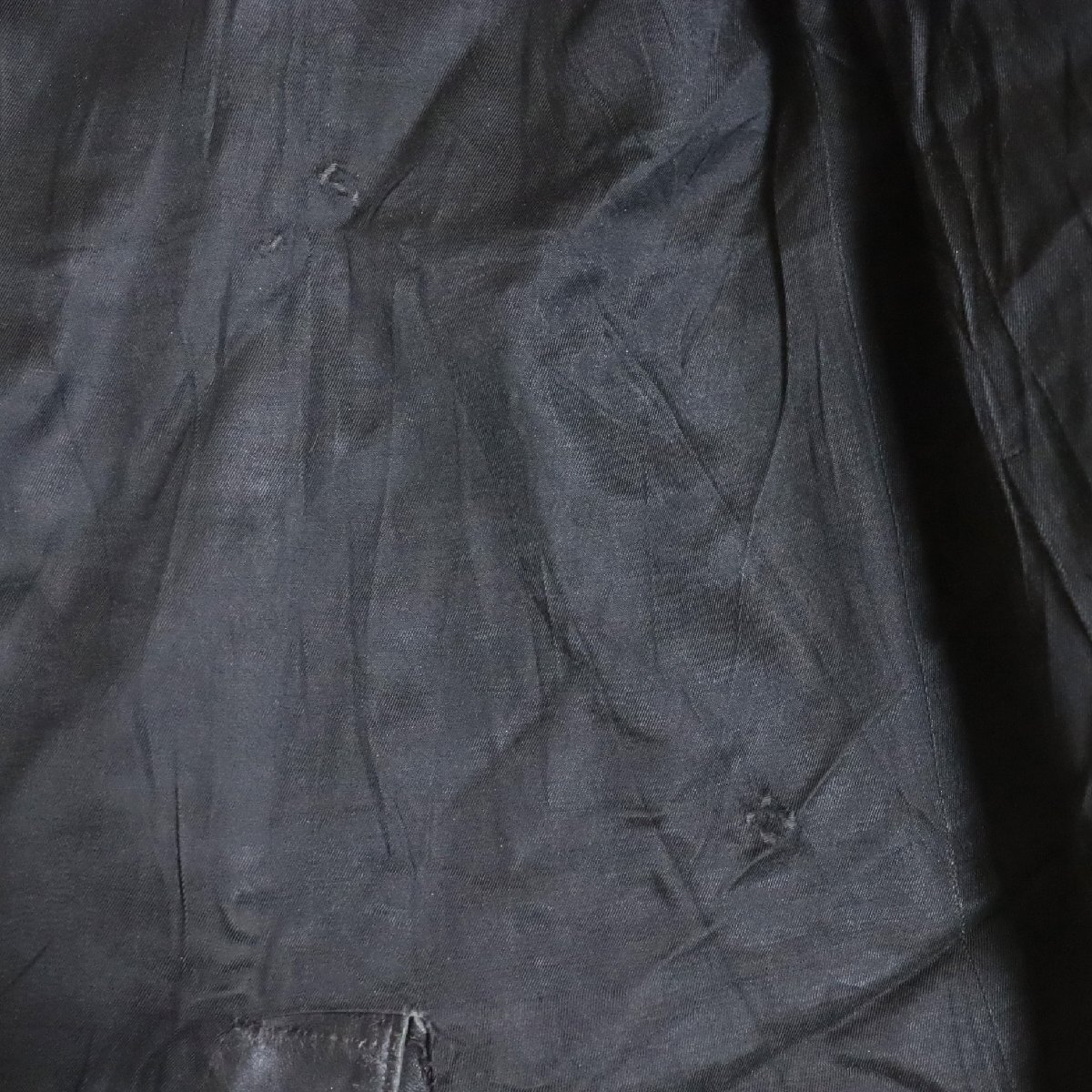中古品です。使用感があります。写真にあるようにレザーに経年による擦れと剥がれ(ボタンとジッパーの塗装 剥がれ含む)、裏地に汚れと生地が薄くなっている箇所があります。