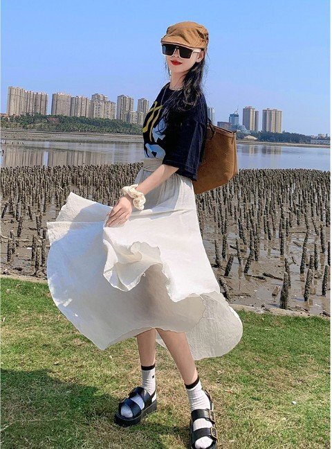 ロングスカート フレア シンプル カジュアル ゆったり お出かけ レディース 6XL ブラック
