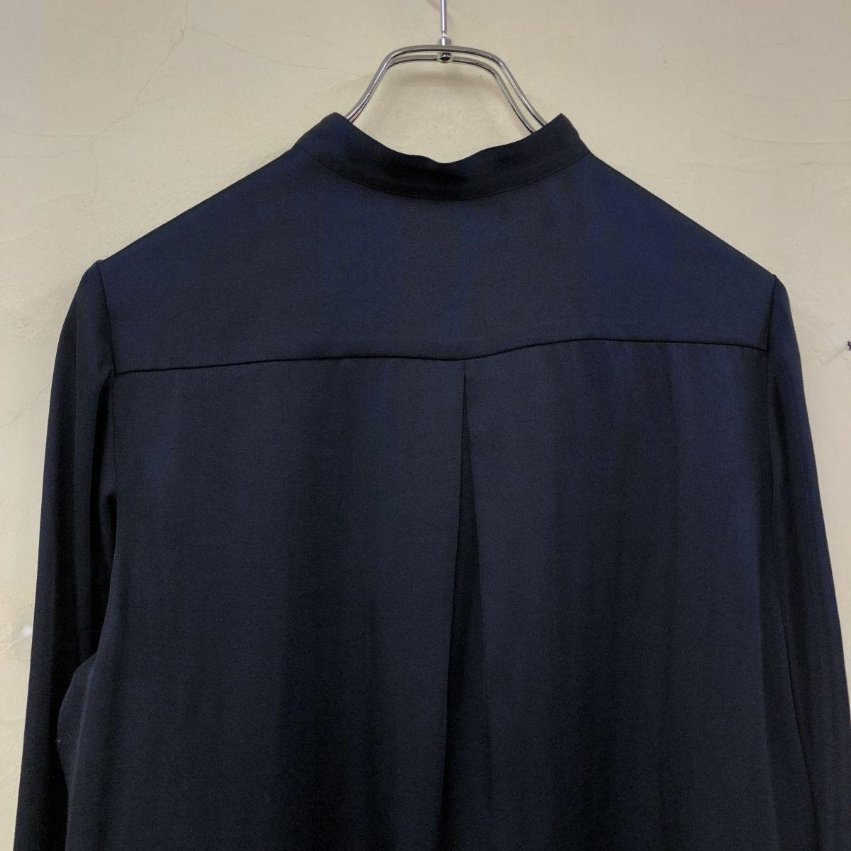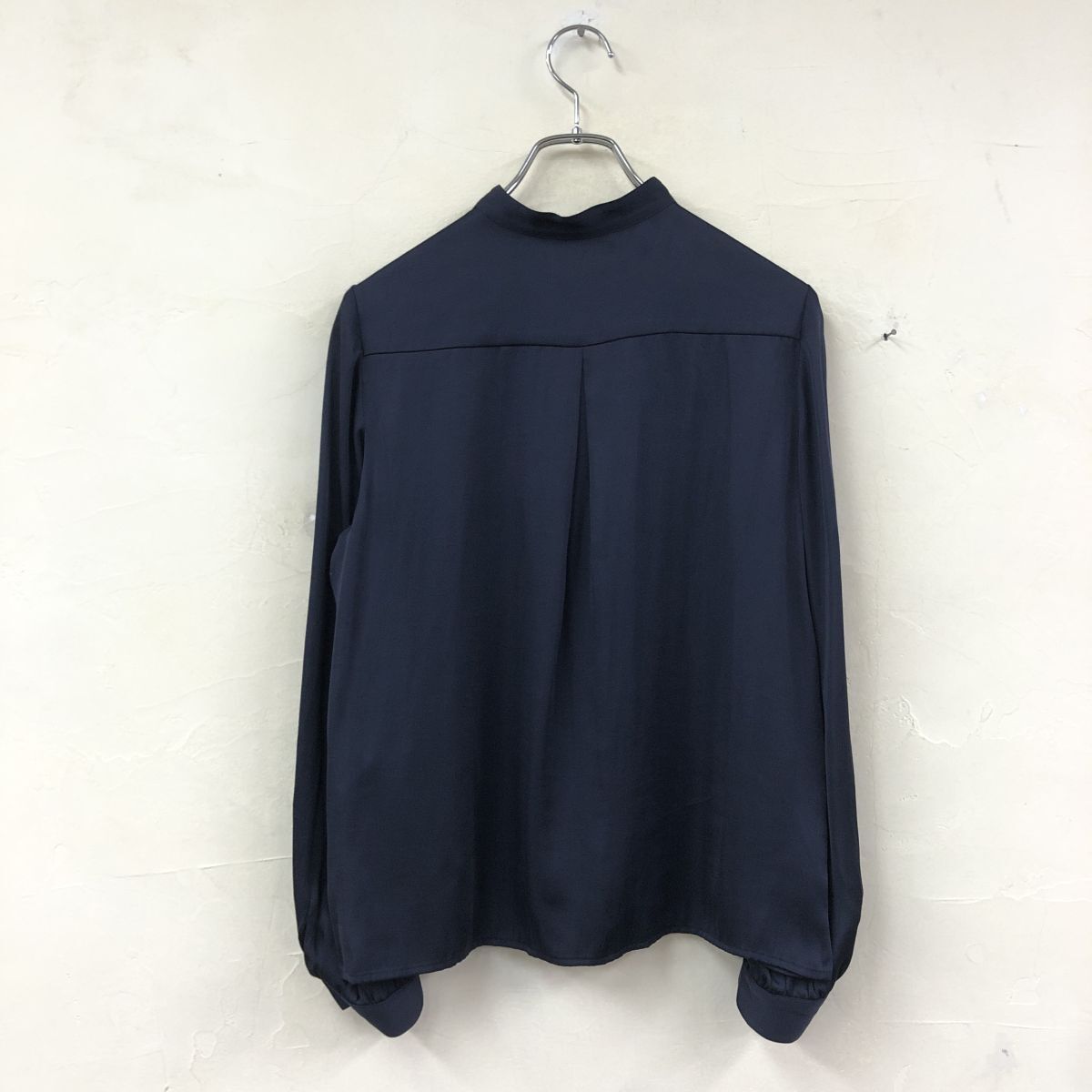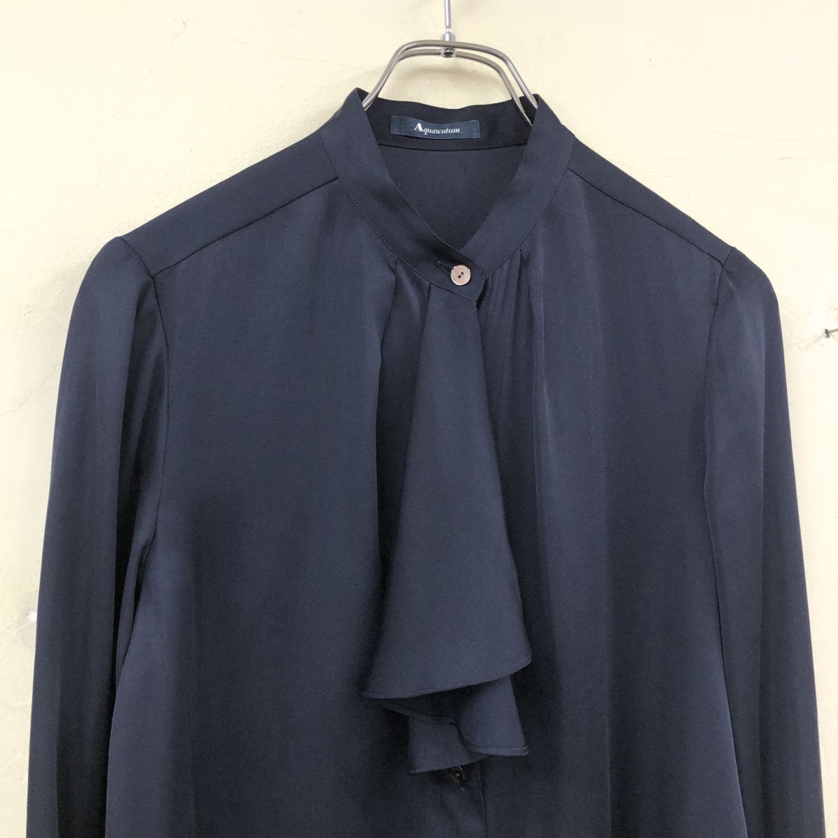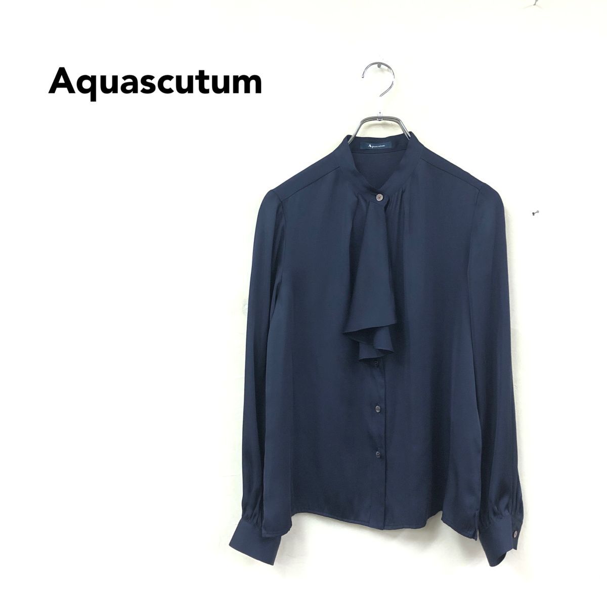 2O1653-K◆良品 日本製 Aquascutum アクアスキュータム 長袖フリルブラウス◆ネイビー 無地 バンドカラー 薄手 光沢 キレイめ レディース