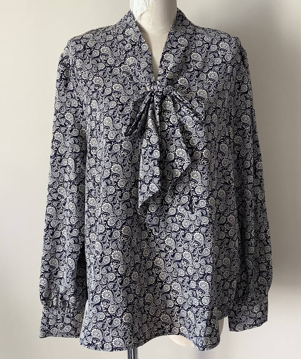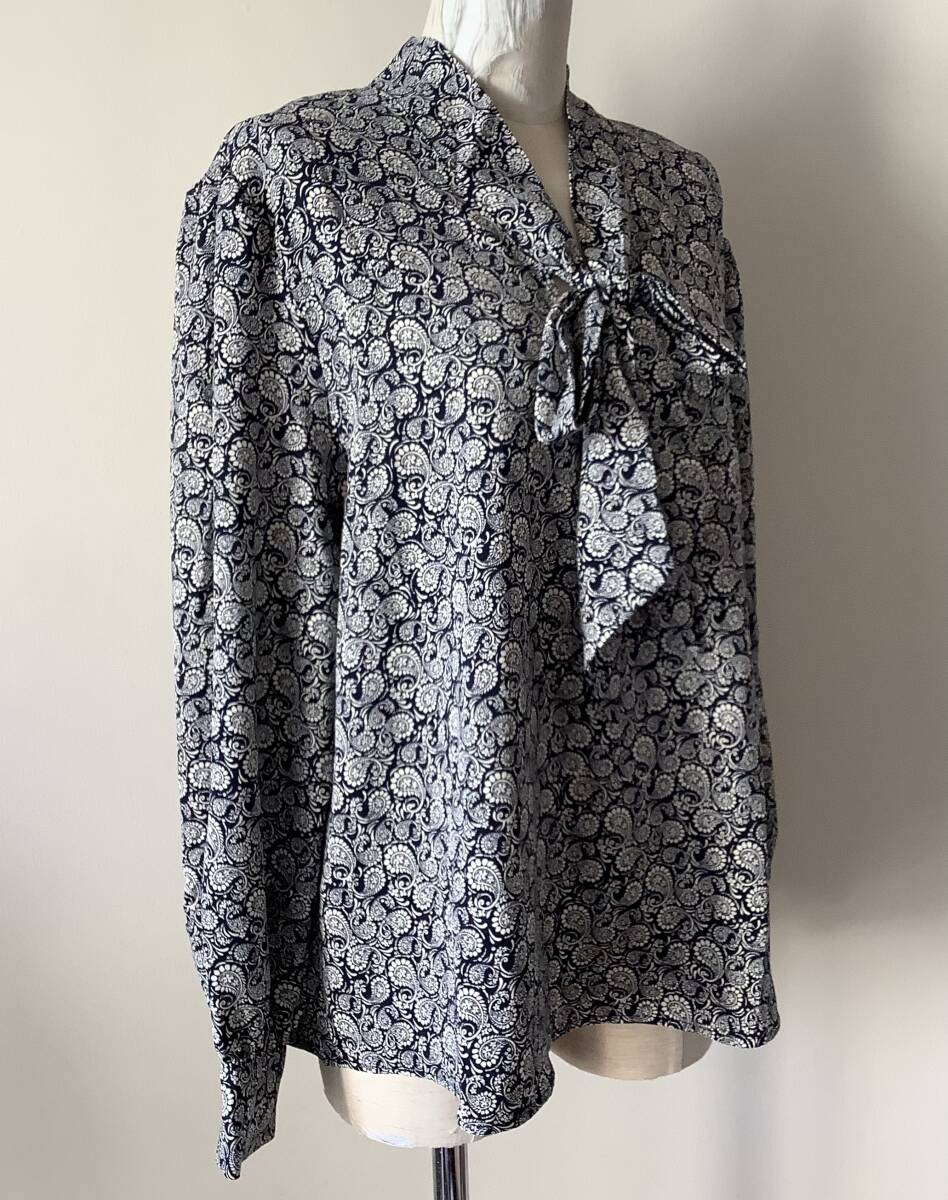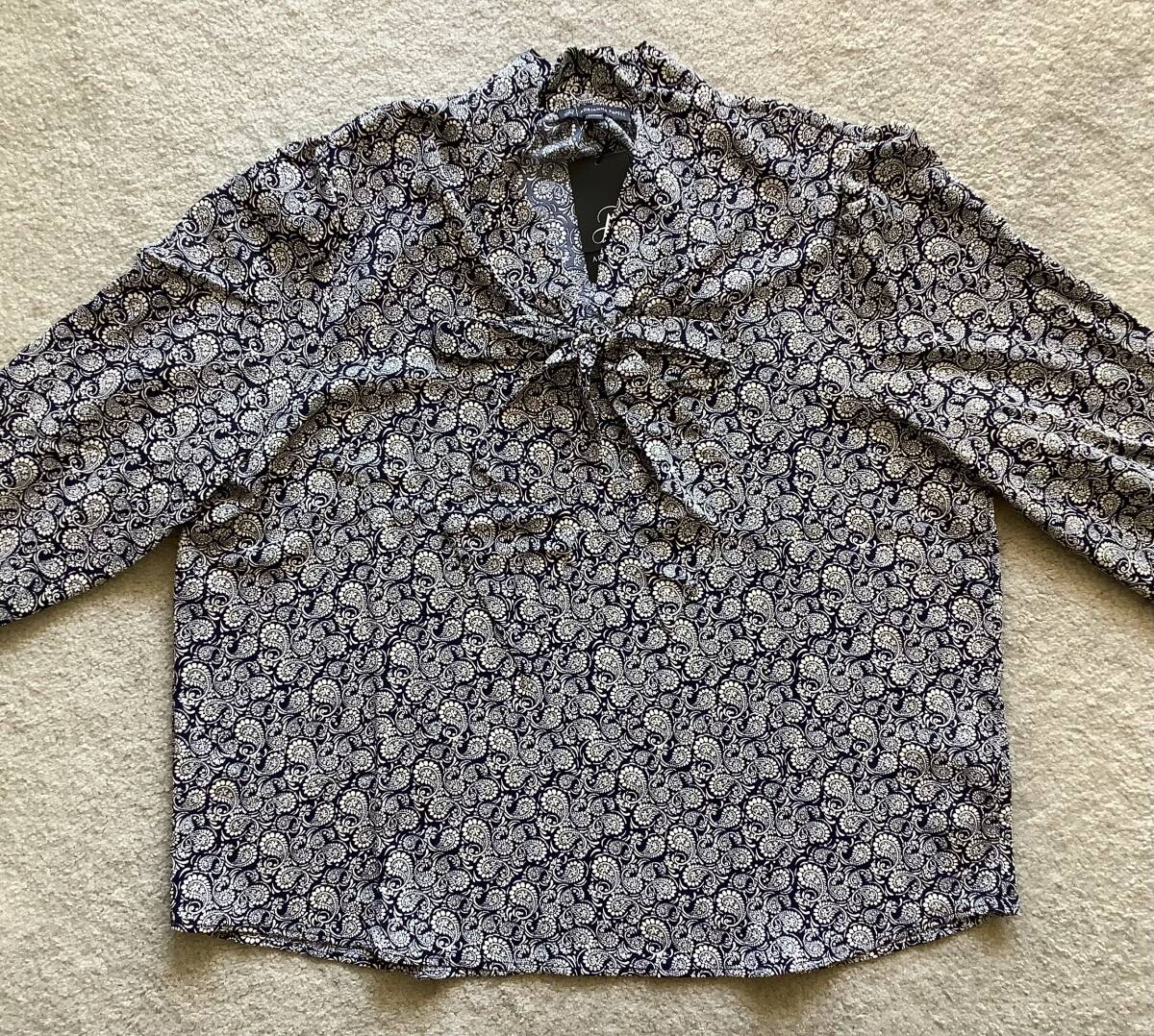 ADRIANNA PAPELLアドリアナパペル新品XL♪ボウタイネック紺白ペイズリー柄シルキーな肌触りのエレガントな長袖ブラウス
