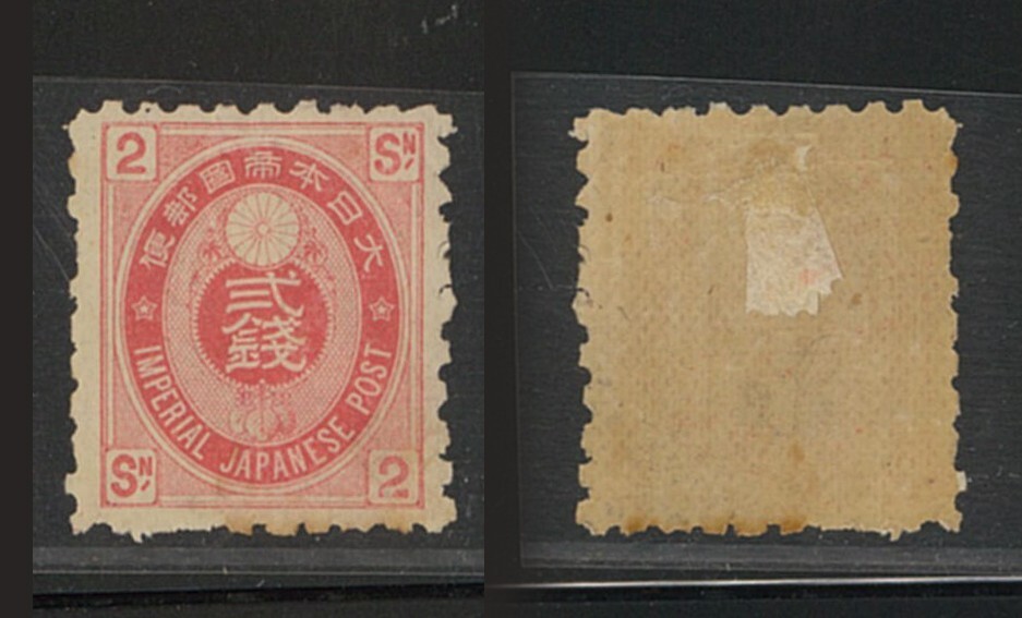 日本切手 未使用 U小判 2銭 木綿紙8.5 うす紅 縦斑点 下辺少シミ ヒンジ付