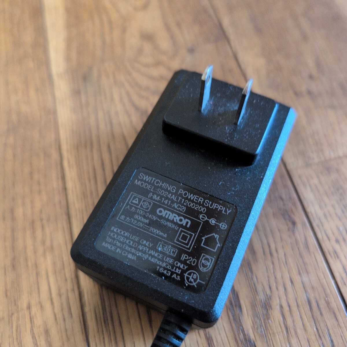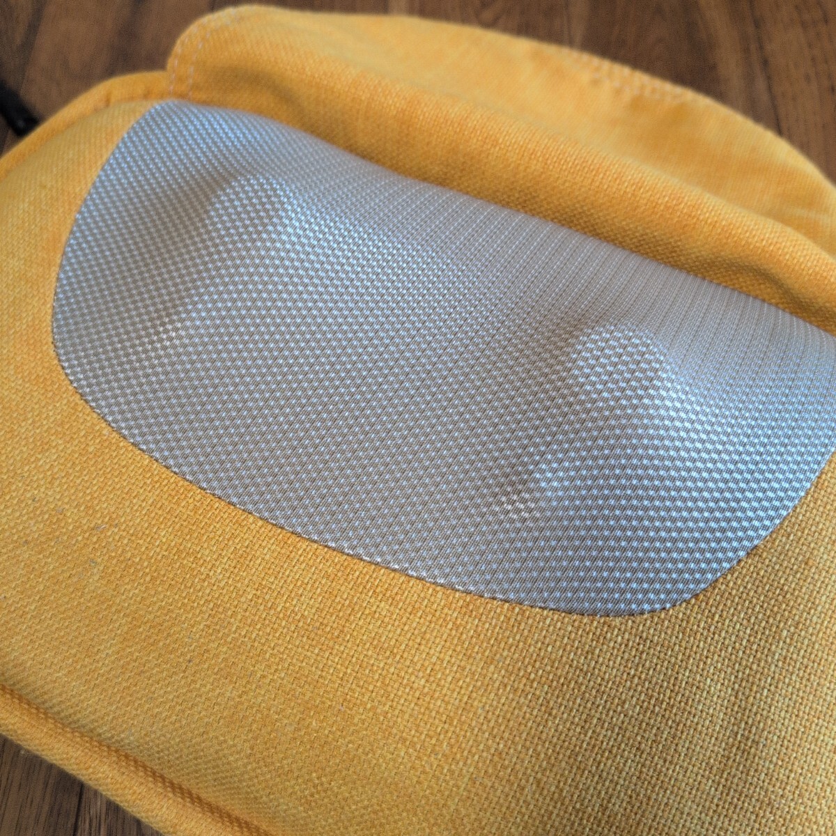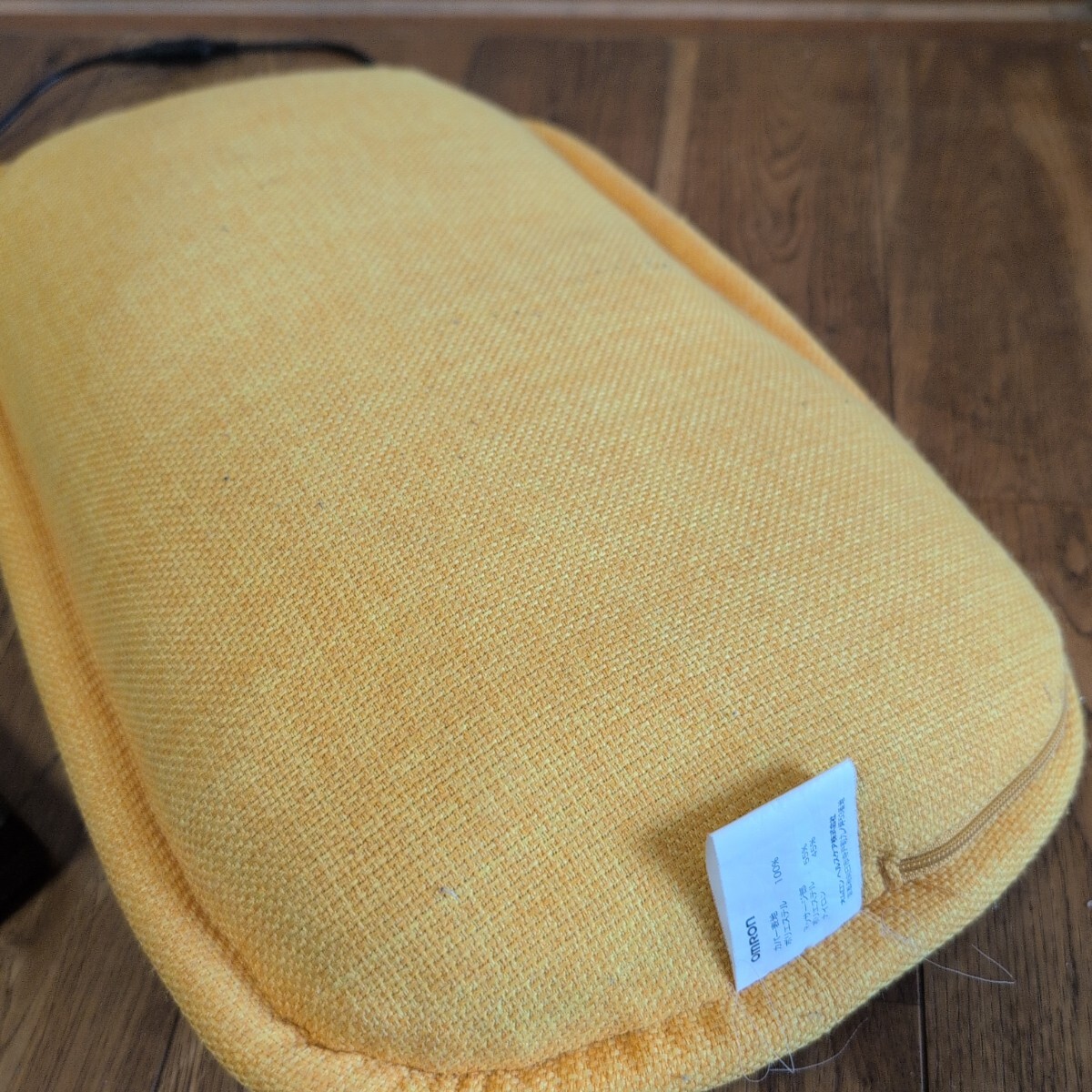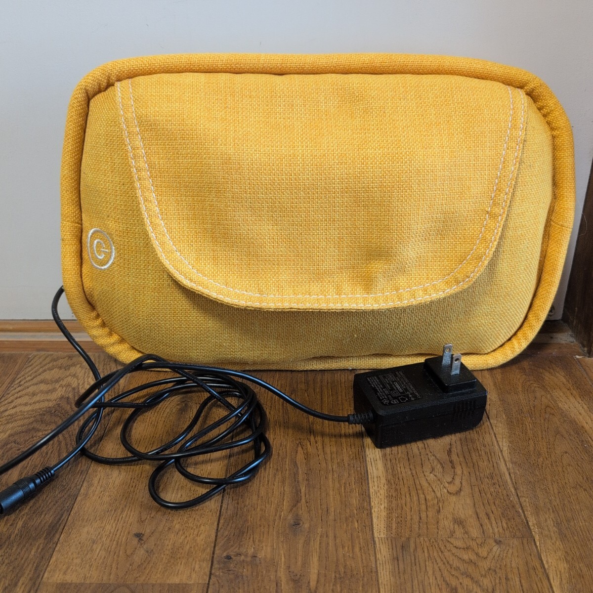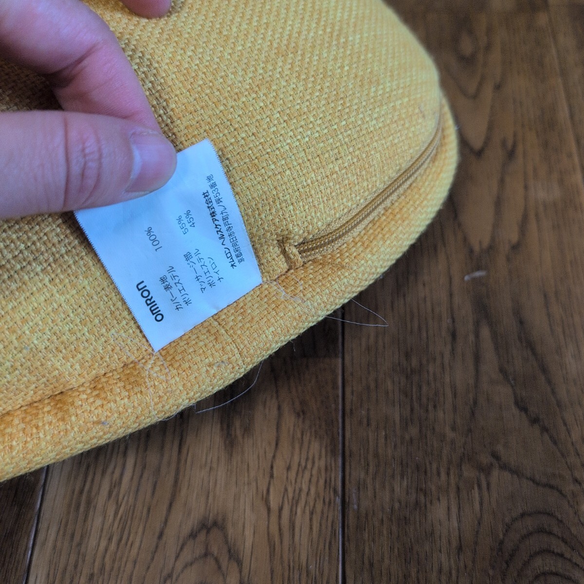 キャンバス生地の黄色いマッサージクッション、OMRON製アダプター付き。