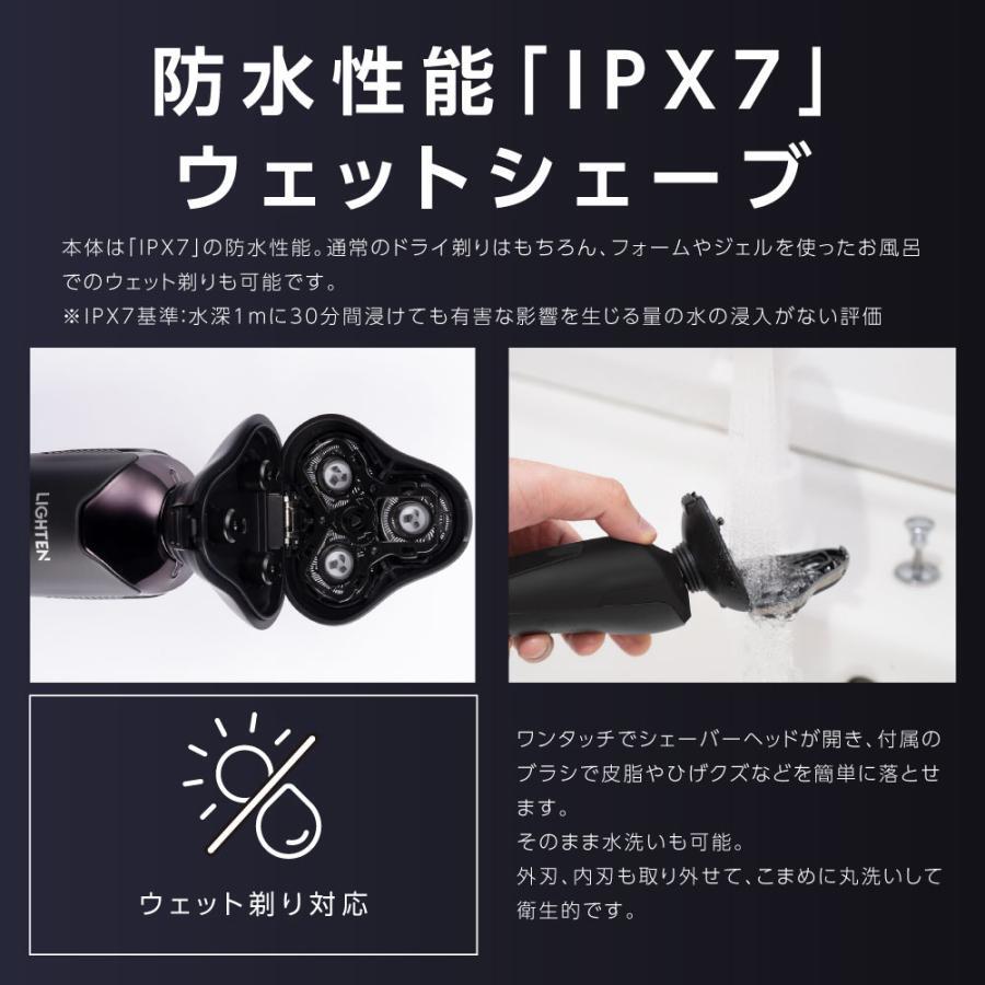 回転式で透明肌を保つやさしいシェービング!回転式は刃が肌に触れにくく、圧力を分散する構造で、肌負担を軽減します。敏感肌の方にはおすすめです。本体は「IPX7」の防水性能。通常のドライりはもちろん、フォームやジェルを使ったお風呂でのウェット剃りも可能です。