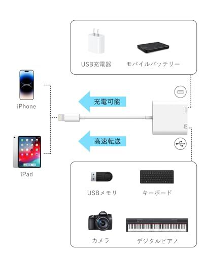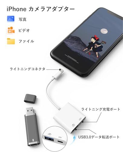 iPhone USB 変換アダプタ【Lightning - USB 3カメラアダプタ】ライトニング急速充電 + USB3.0データ転送 双方向 高速転送 写真/ビデオ/ファイル iPhone/iPad対応