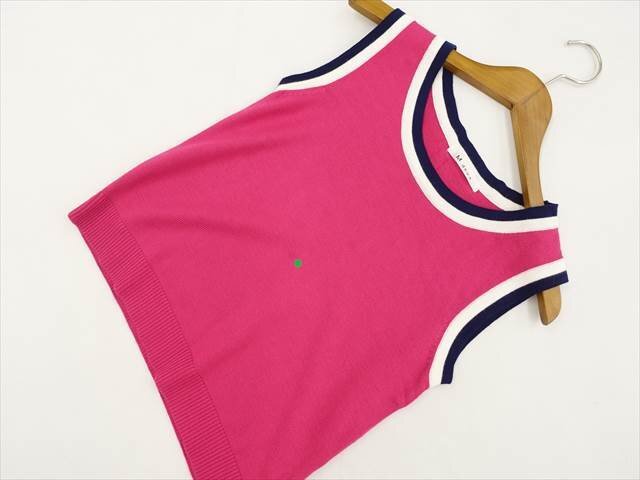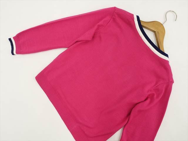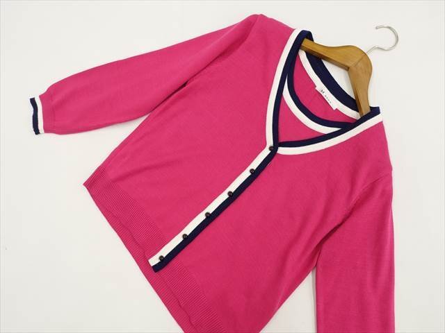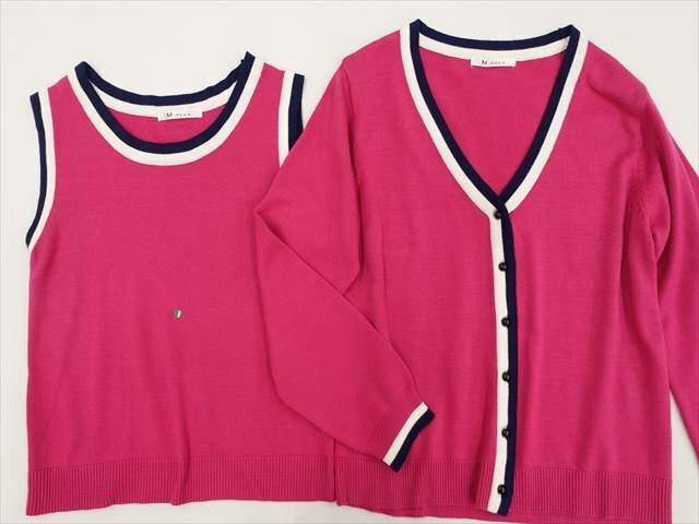 長袖ニットカーディガン+ニットジレベスト アンサンブルニット2点セット 38 ショッキングピンク&ネイビー×オフホワイト