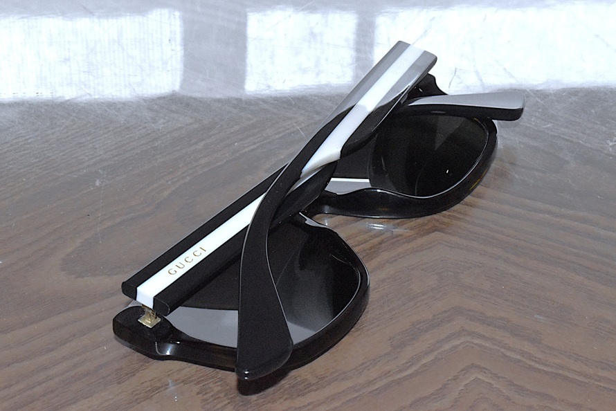 GG0341Sの003は、黒白のストライプ仕様のシェリーラインを採用するモデルで、さりげないブランドロゴとシックなアイコン配色が、都会的でモダンな印象を引き立ててくれます。