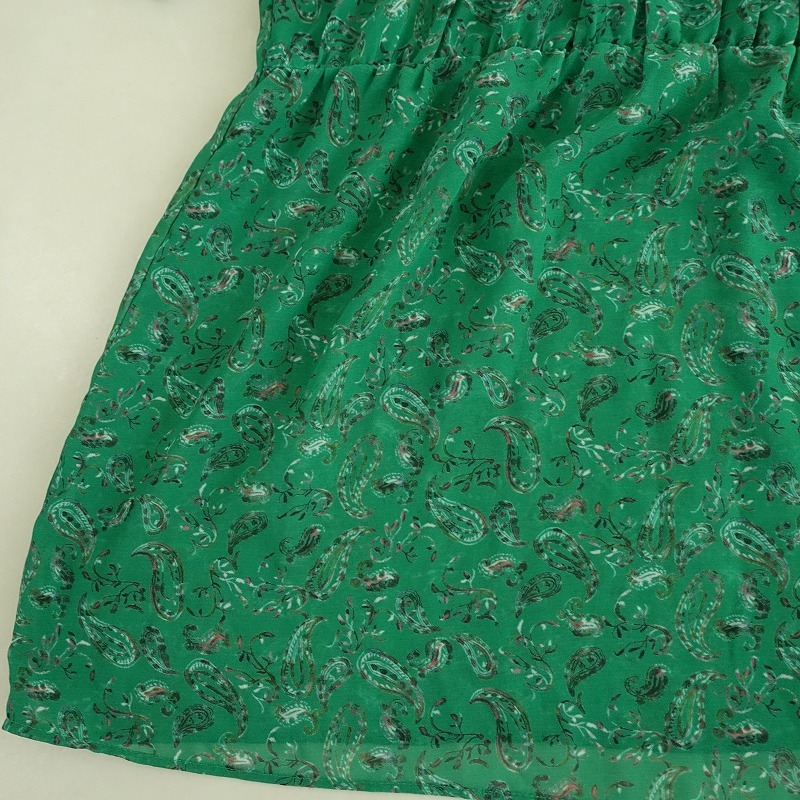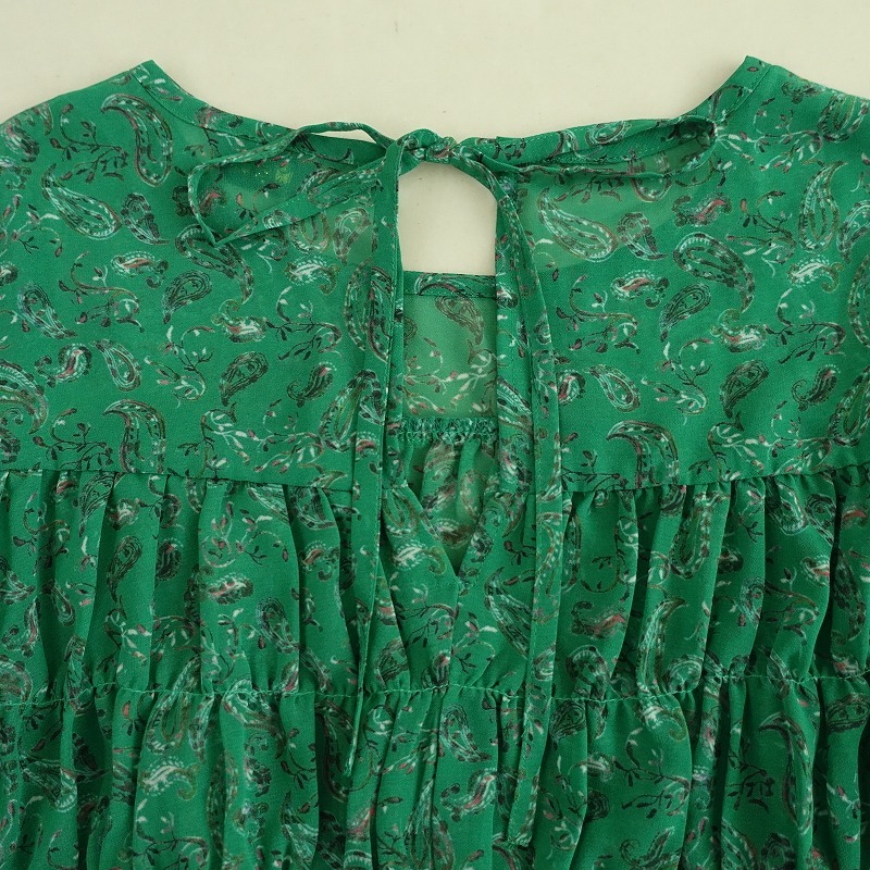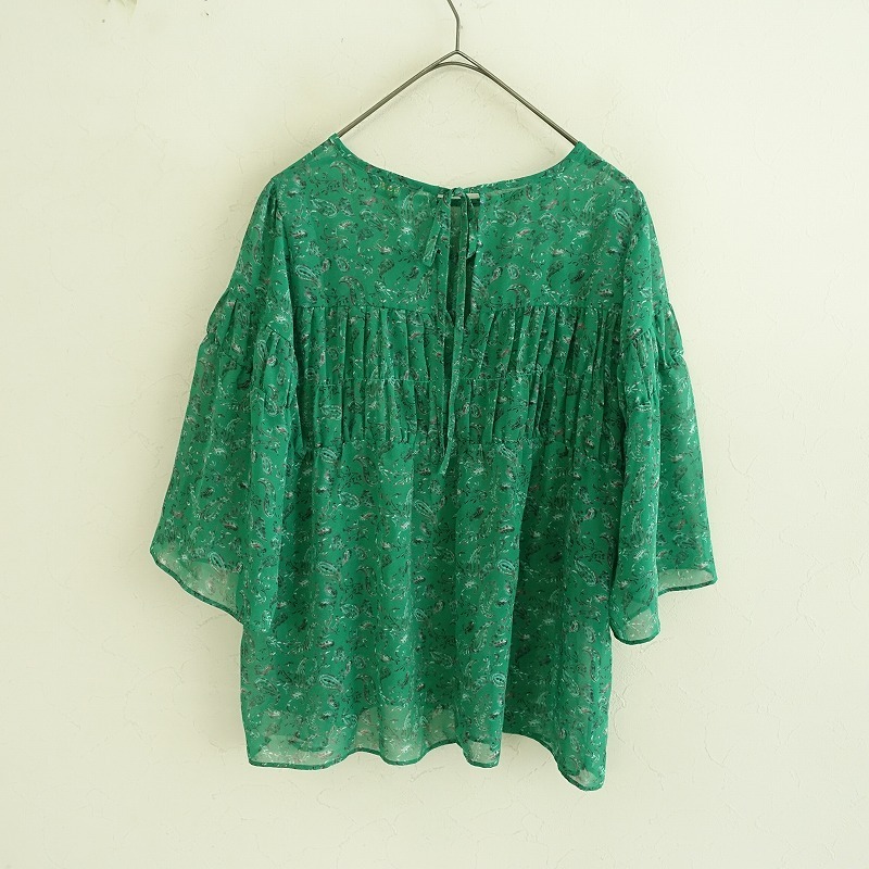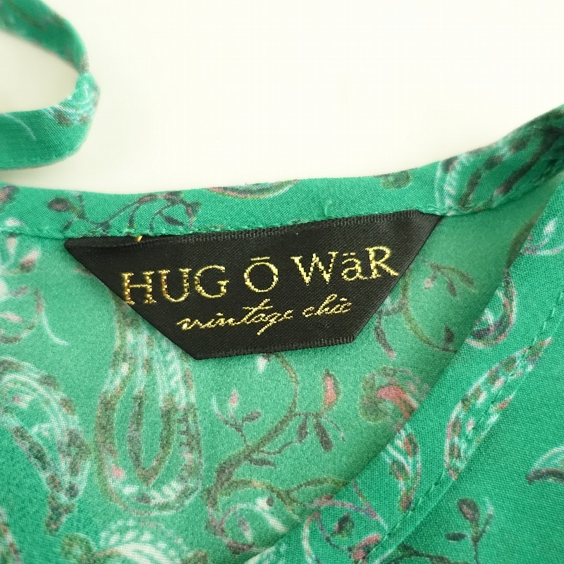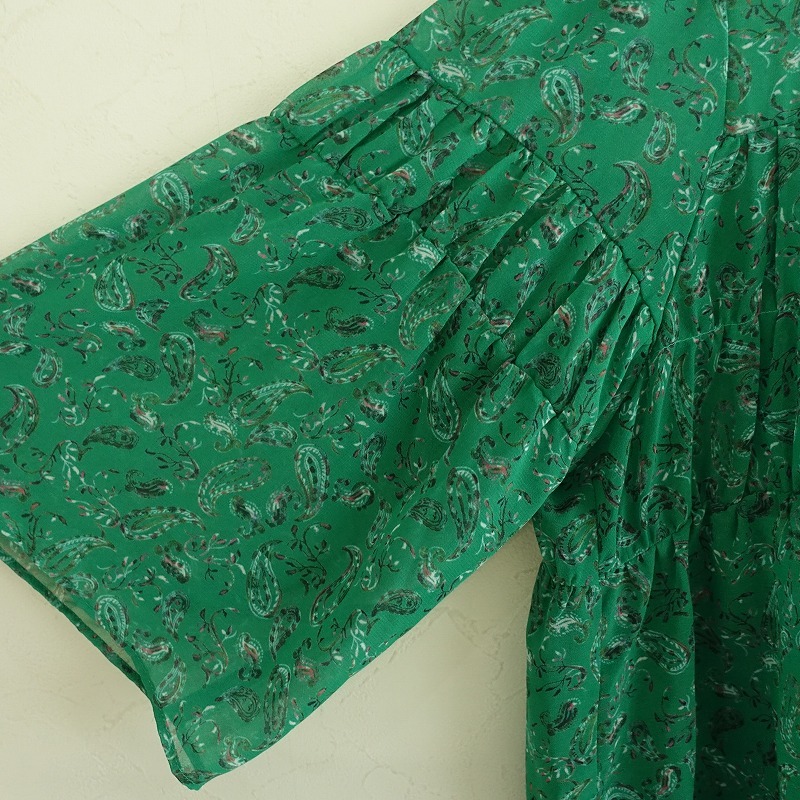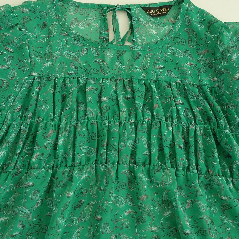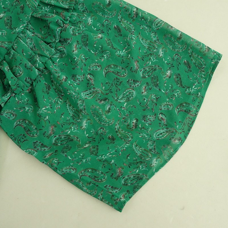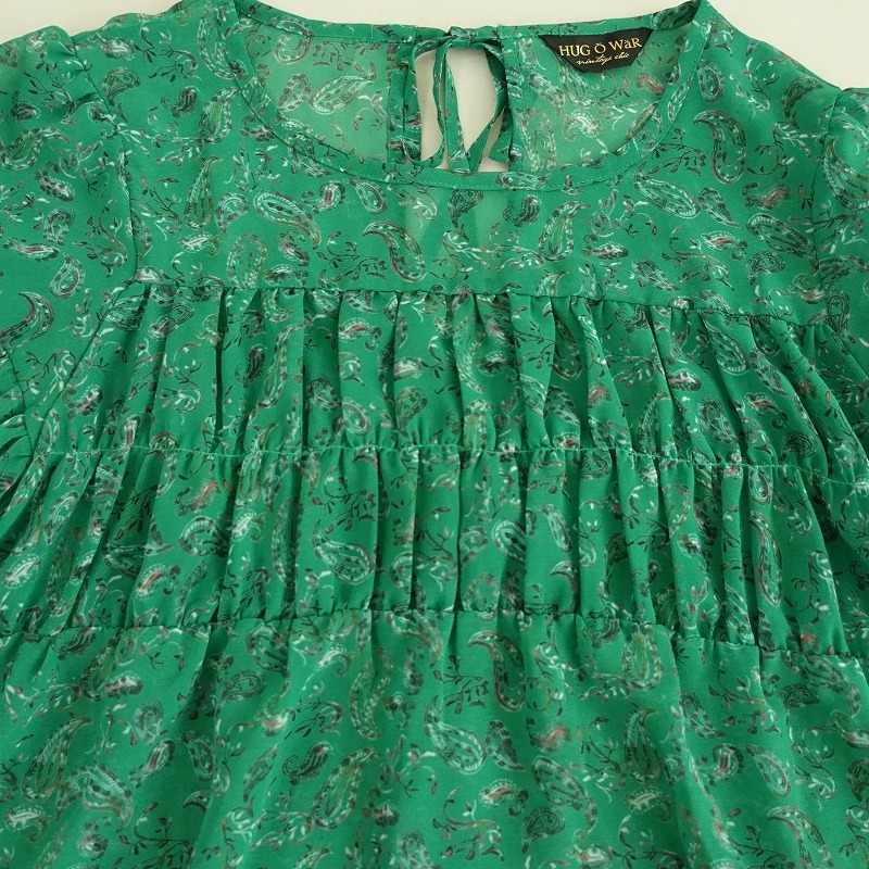 | Hug O Warのペイズリー柄シフォンシャーリングブラウスです。 カラーはグリーンベースのペイズリー柄で、透け感のあるジョーゼットのシアー素材で仕立てられています。後ろ上部にひも結び付きのプルオーバータイプで、胸元や袖にシャーリングがあしらわれています。 |