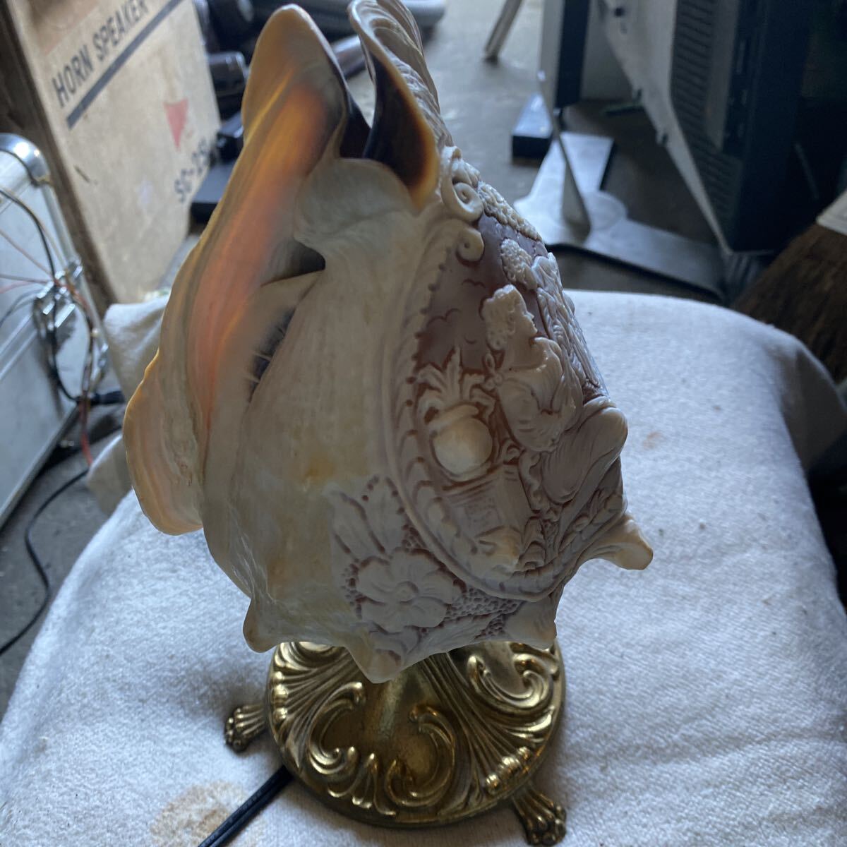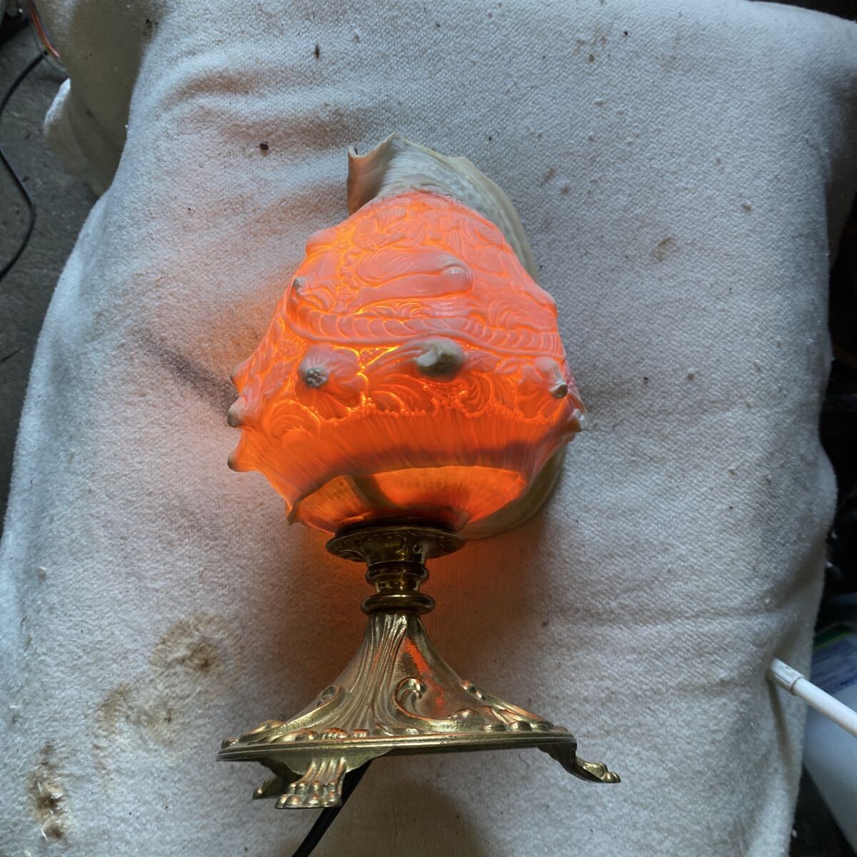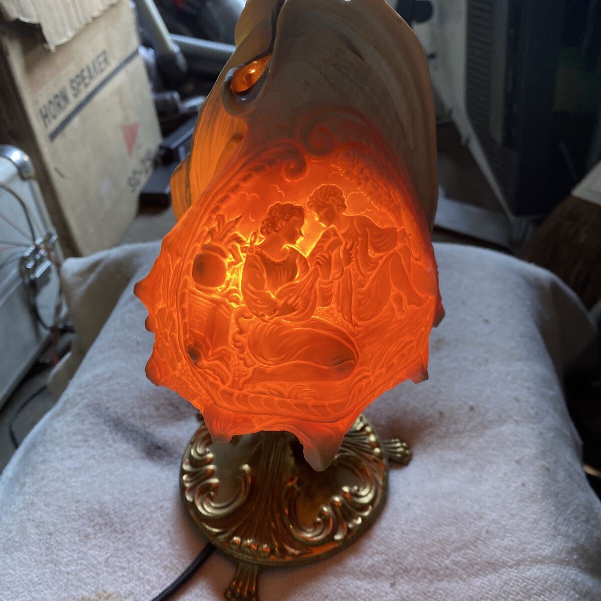 貝殻の層ごとに異なる色を利用した彫刻が特徴で、ランプとして使用すると、光が模様を美しく照らし出します。