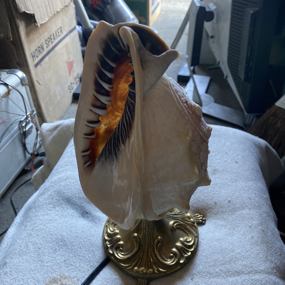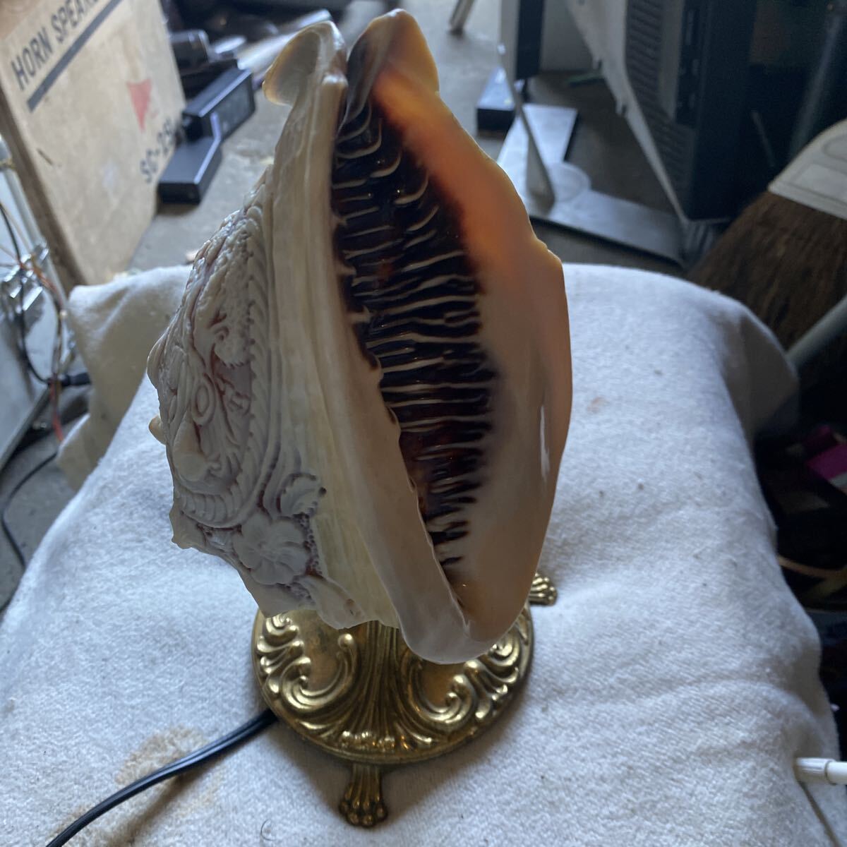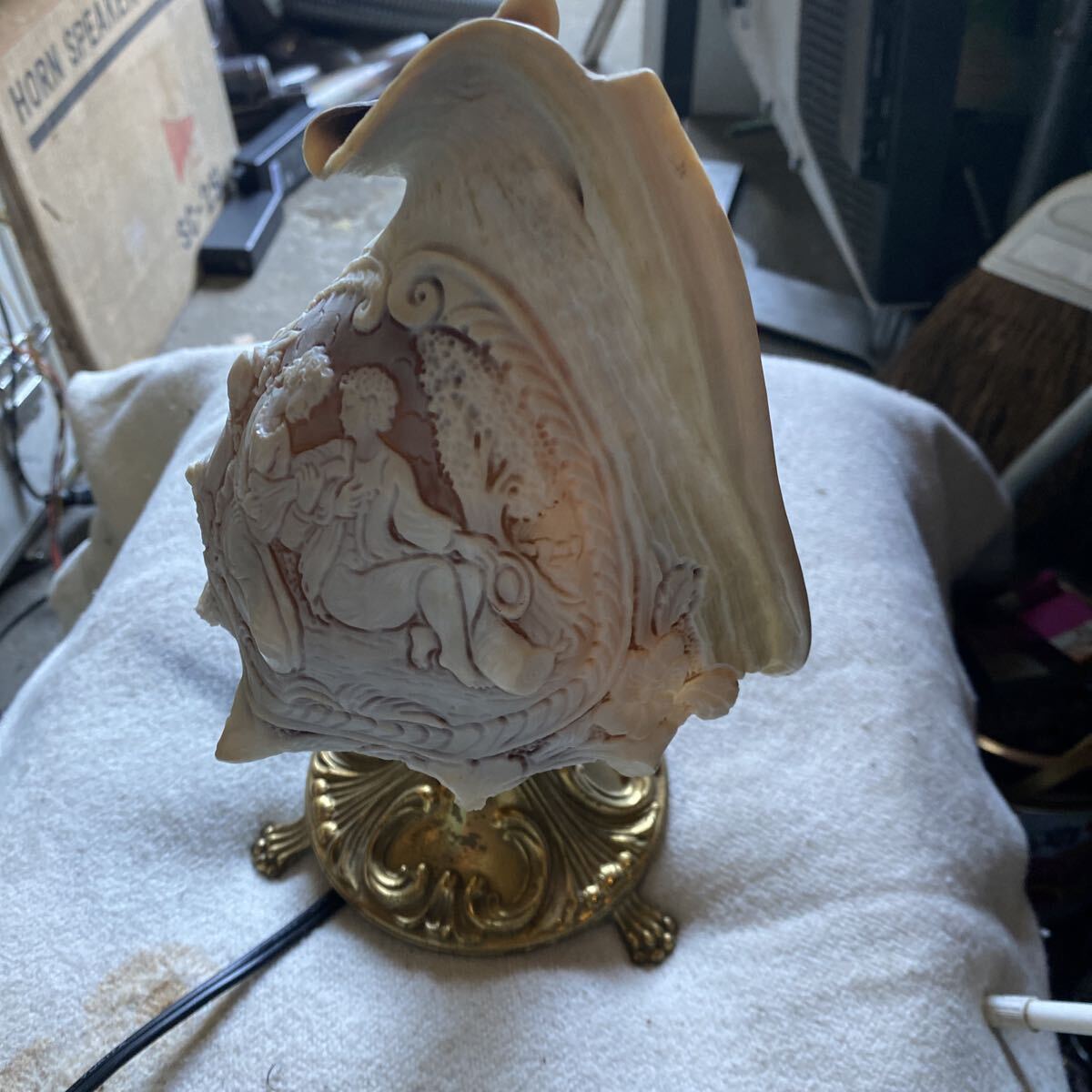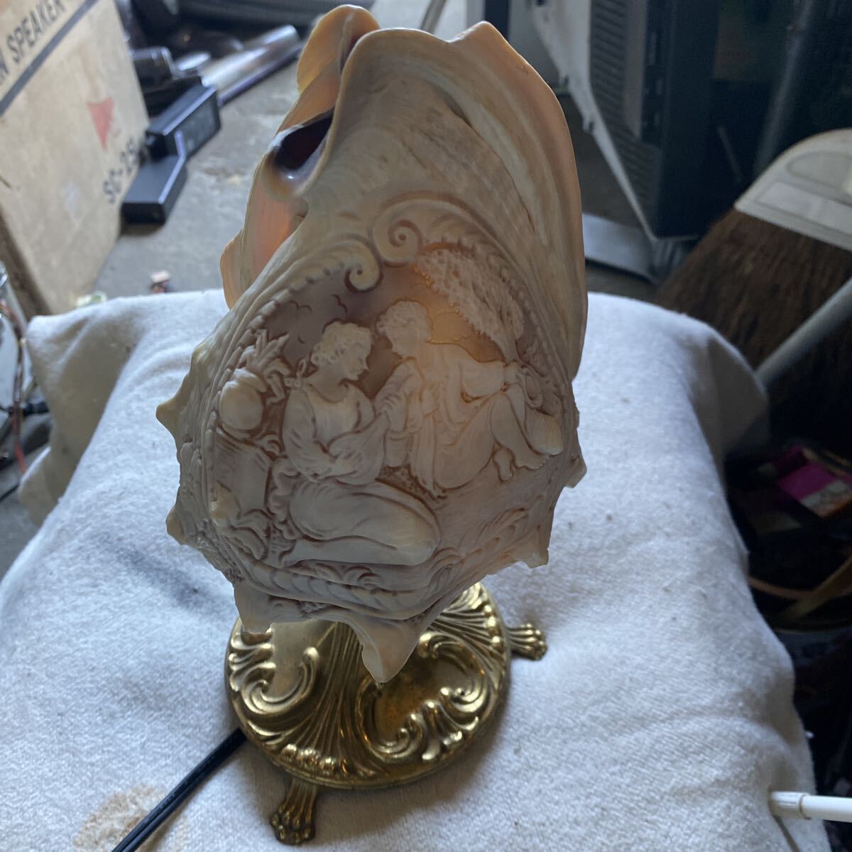 貝殻の層ごとに異なる色を利用した彫刻が特徴で、ランプとして使用すると、光が模様を美しく照らし出します。