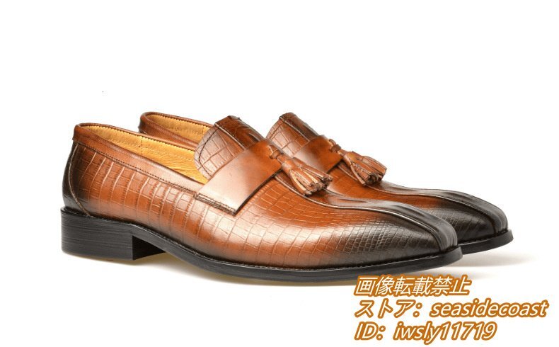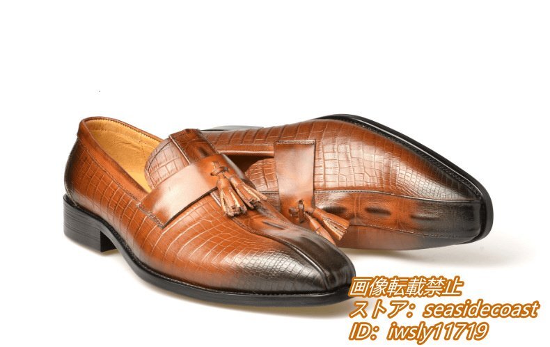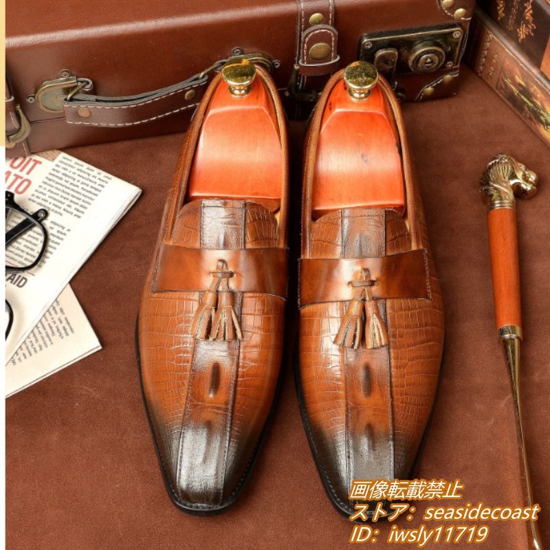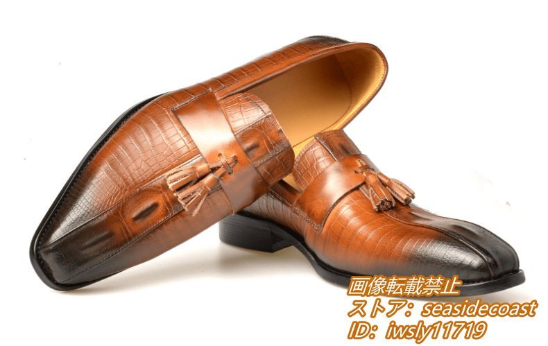 定価9万★最高級 牛革 レザーシューズ タッセル スリッポン ローファー 本革 ビジネスシューズ 鰐柄 職人手作り 紳士 革靴 ブラウン 25.0cm