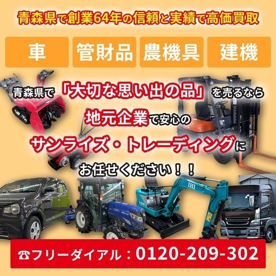 | サンライズ農機買取センター 【住所】青森県青森市八幡林熊谷12-1 【TEL】 017-752-8977 【対応時間】 9:00~18:00 【定休日】 毎週火曜日 URL:https://sunrisetrading.tokyo/ ※定休日・営業時間外のご連絡・ご質問対応は翌営業日以降の対応となります。 | |