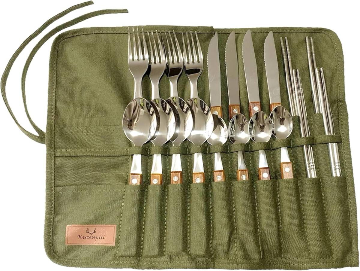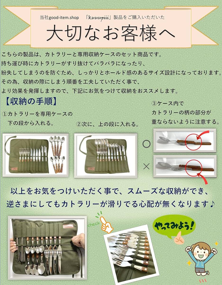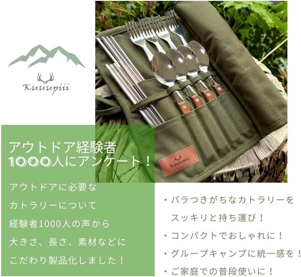 オリーブ色 kuuupiii カトラリーセット 4人用 21点セット キャンプ アウトドア 収納 木製 ステンレス おしゃれ バーベキュー