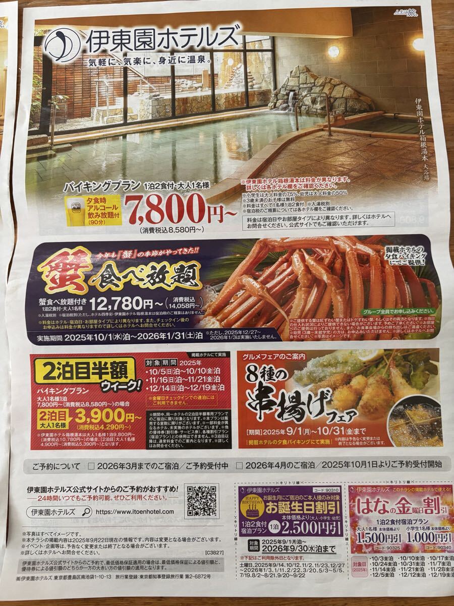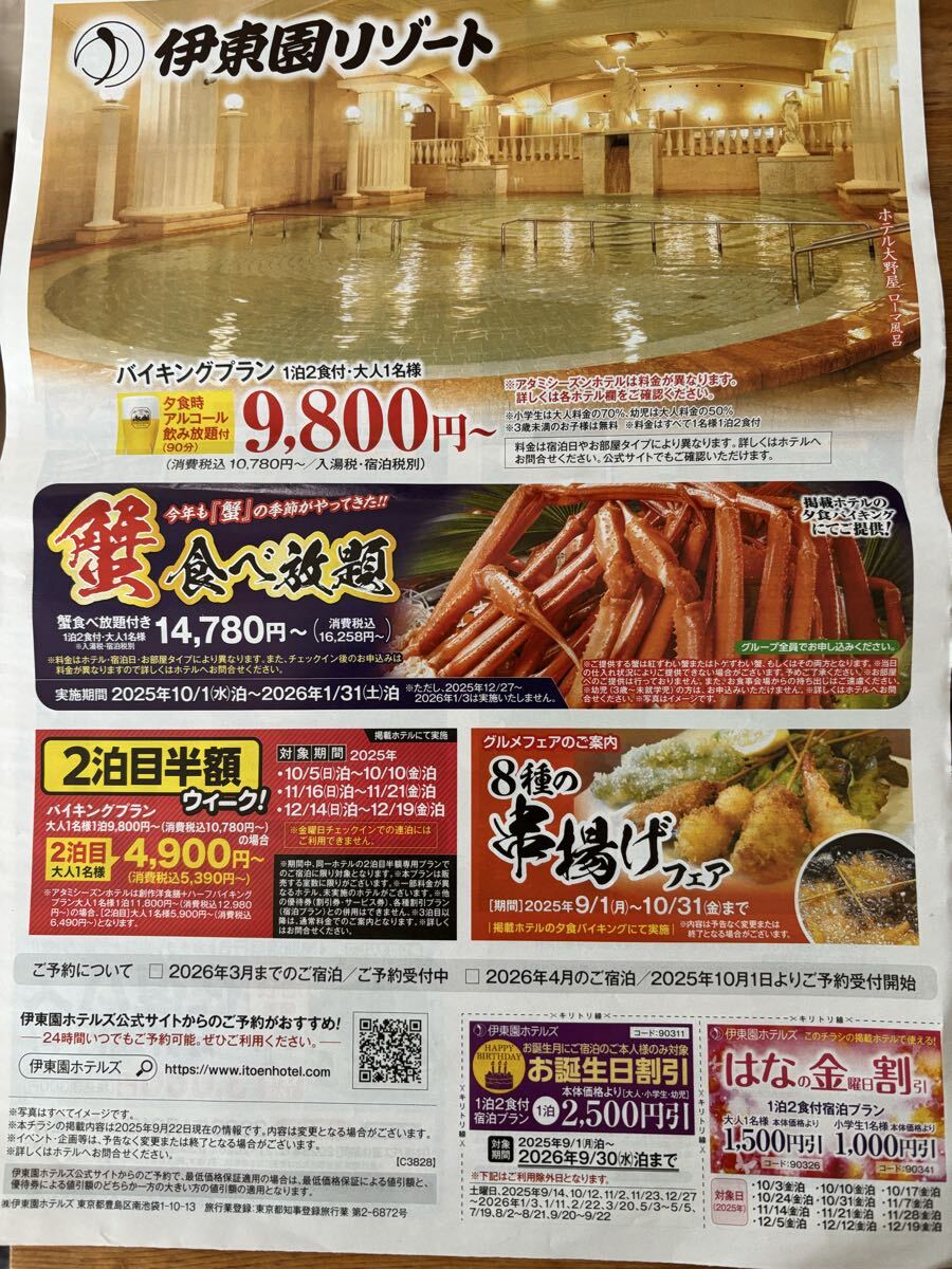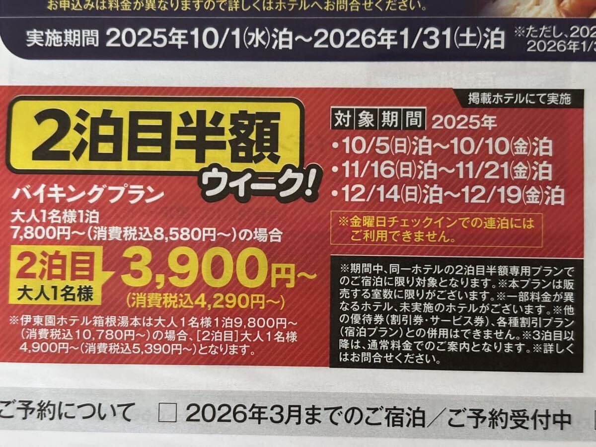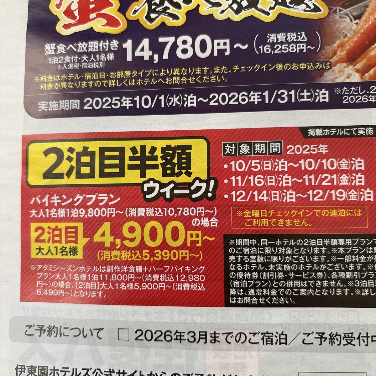 伊東園リゾート 2泊目半額4,900円〜 です。