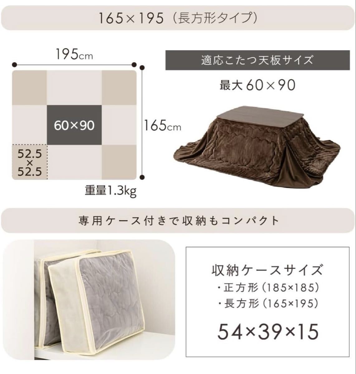 165x195cmのこたつ布団、収納ケース付きでコンパクトに保管可能。