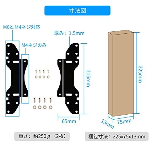 梱包寸法:225x75x13MM、モニターアームVESA変換プレート*2,M6Tネジ(4本)、M6リング(4枚)、M4Tネジ(4本)、M4リング(4枚)、日本語取付け説明書x1。