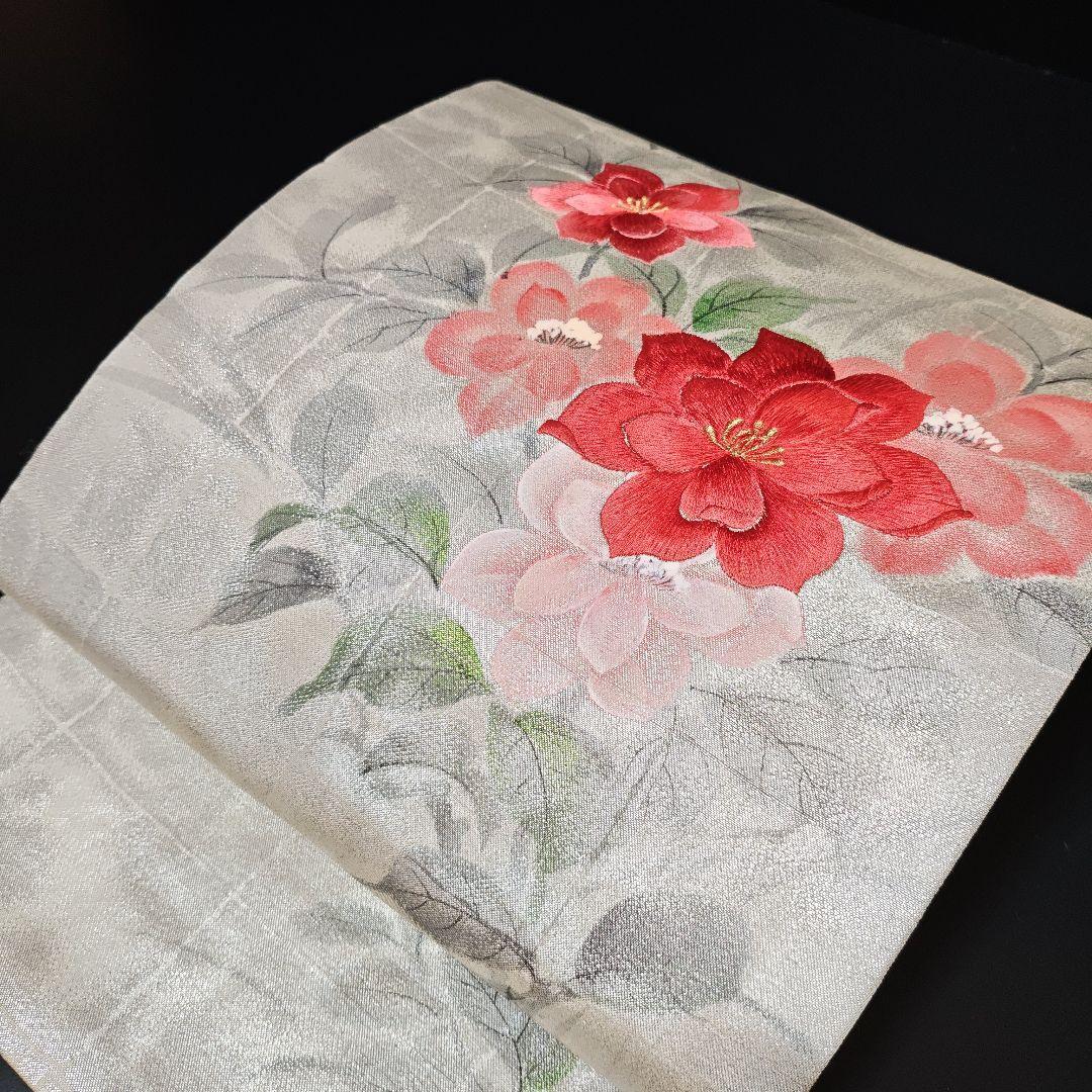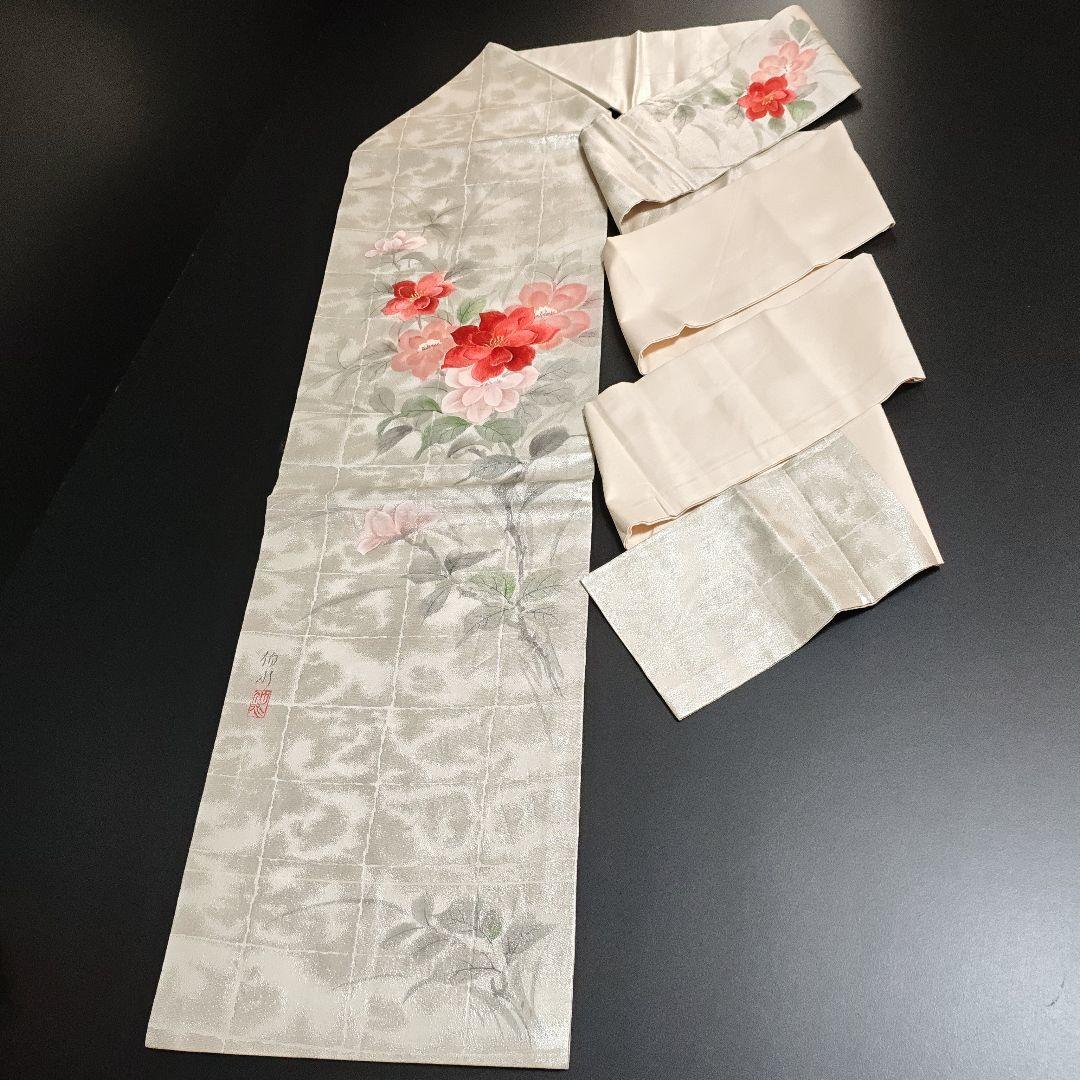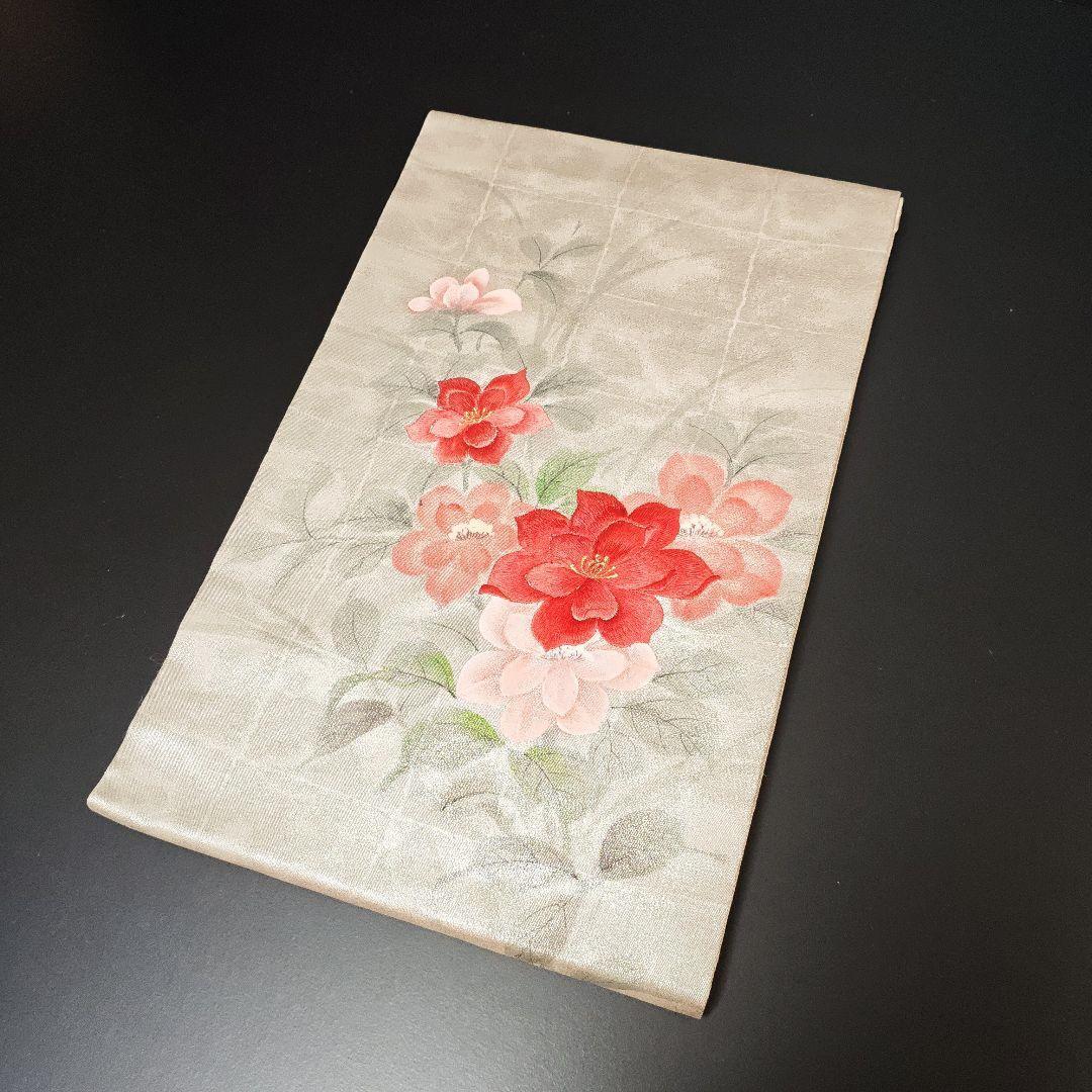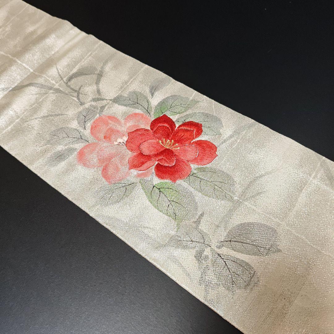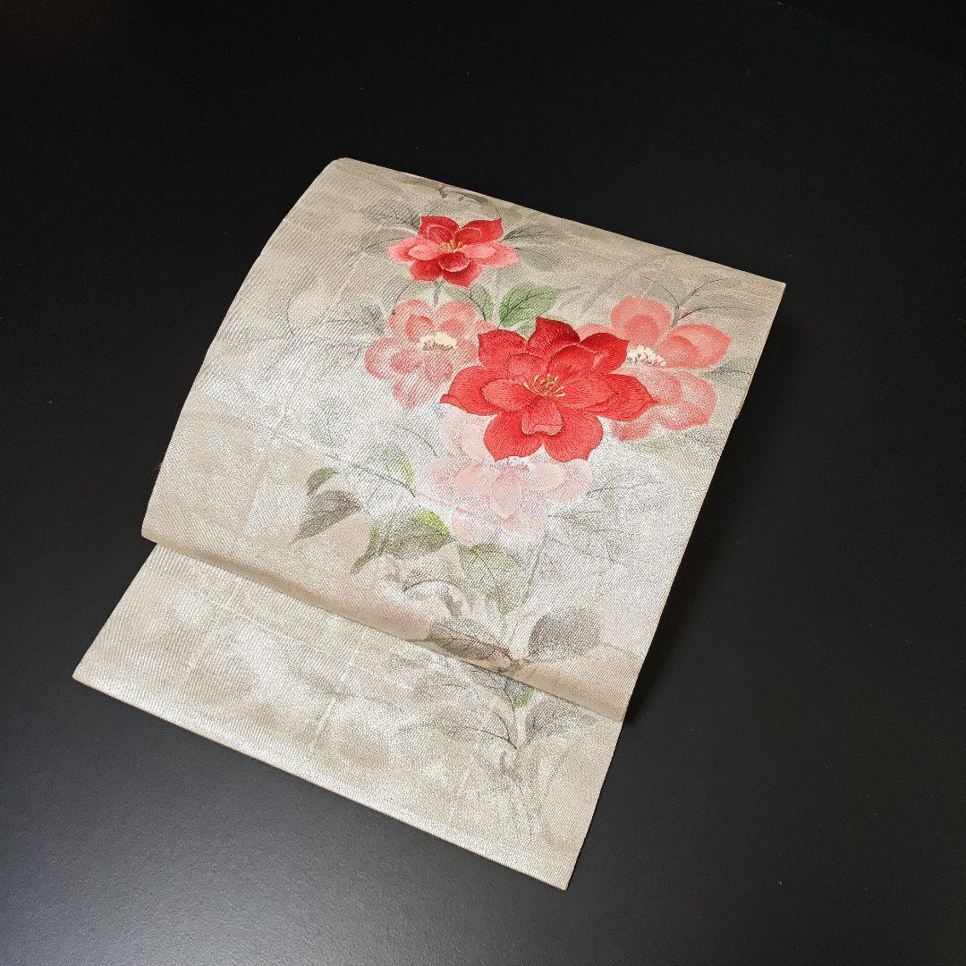 名古屋仕立て 正絹 九寸 美品 手刺繍 手書き 華模様 落款入りの名古屋帯になります^ ^