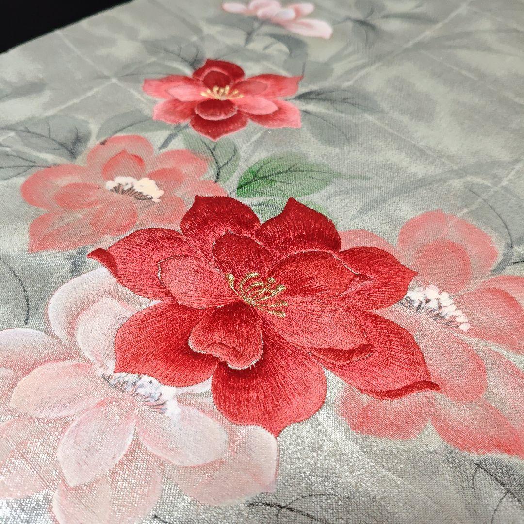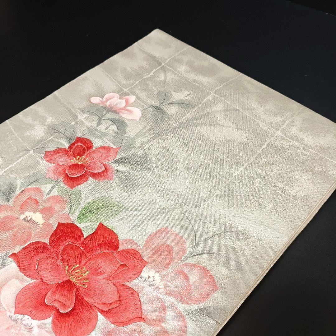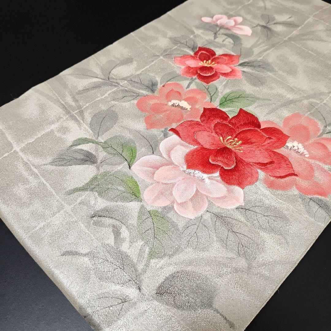 H-703 名古屋帯 名古屋仕立て 正絹 九寸 手刺繍 手書き 華模様 落款入り