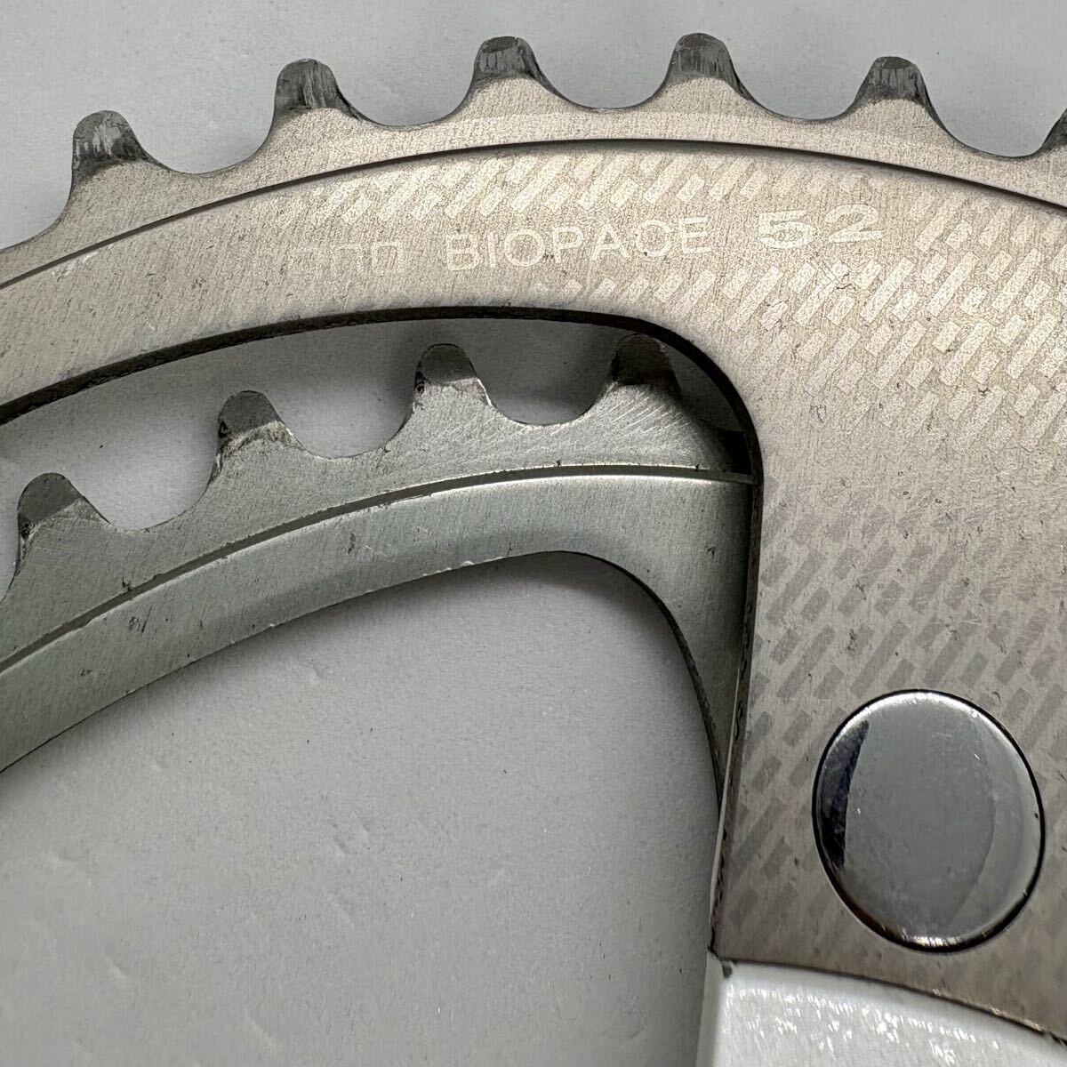 • 希少なクラシックギア: 歯数は52-42Tのダブル仕様。当時のロードレースを象徴するギア比であり、ヴィンテージバイクのリアリティを追求する上で欠かせない構成です。