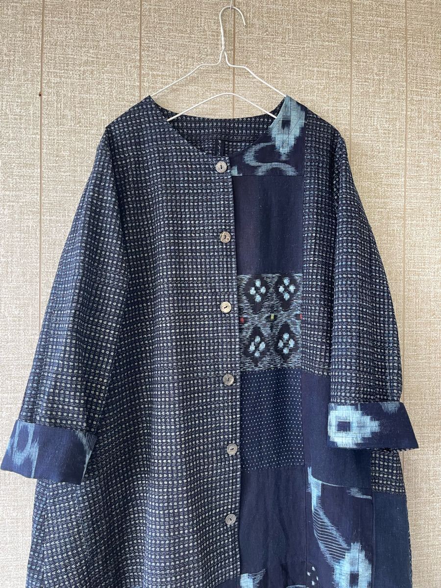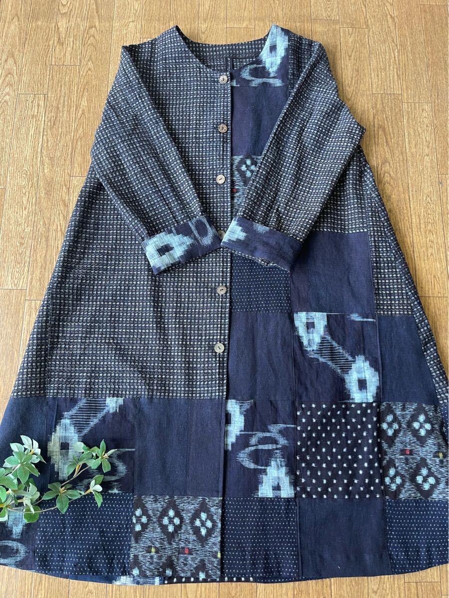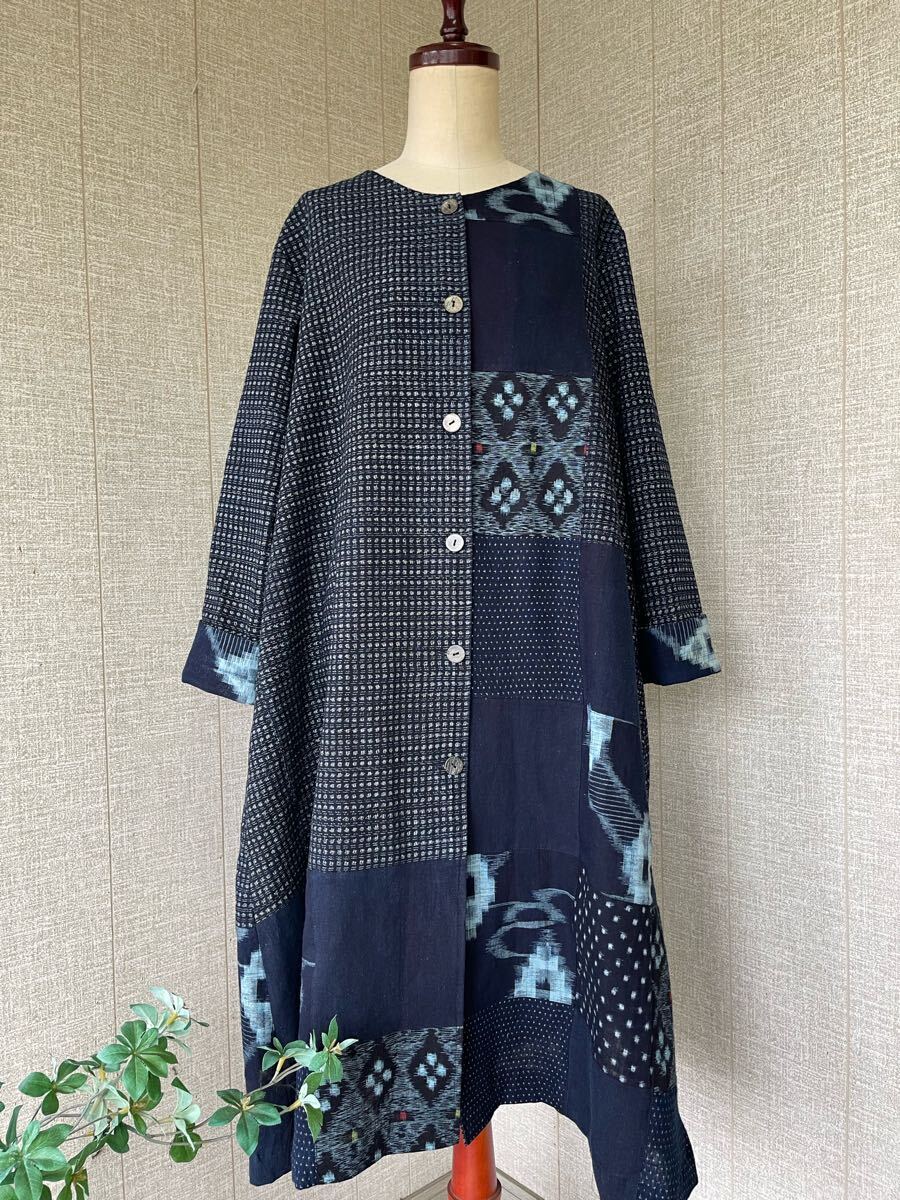 ★blue-sky/古布/着物リメイク/藍染め木綿・久留米書生絣・絵絣/パッチワーク・コートワンピース/ハンドメイド★