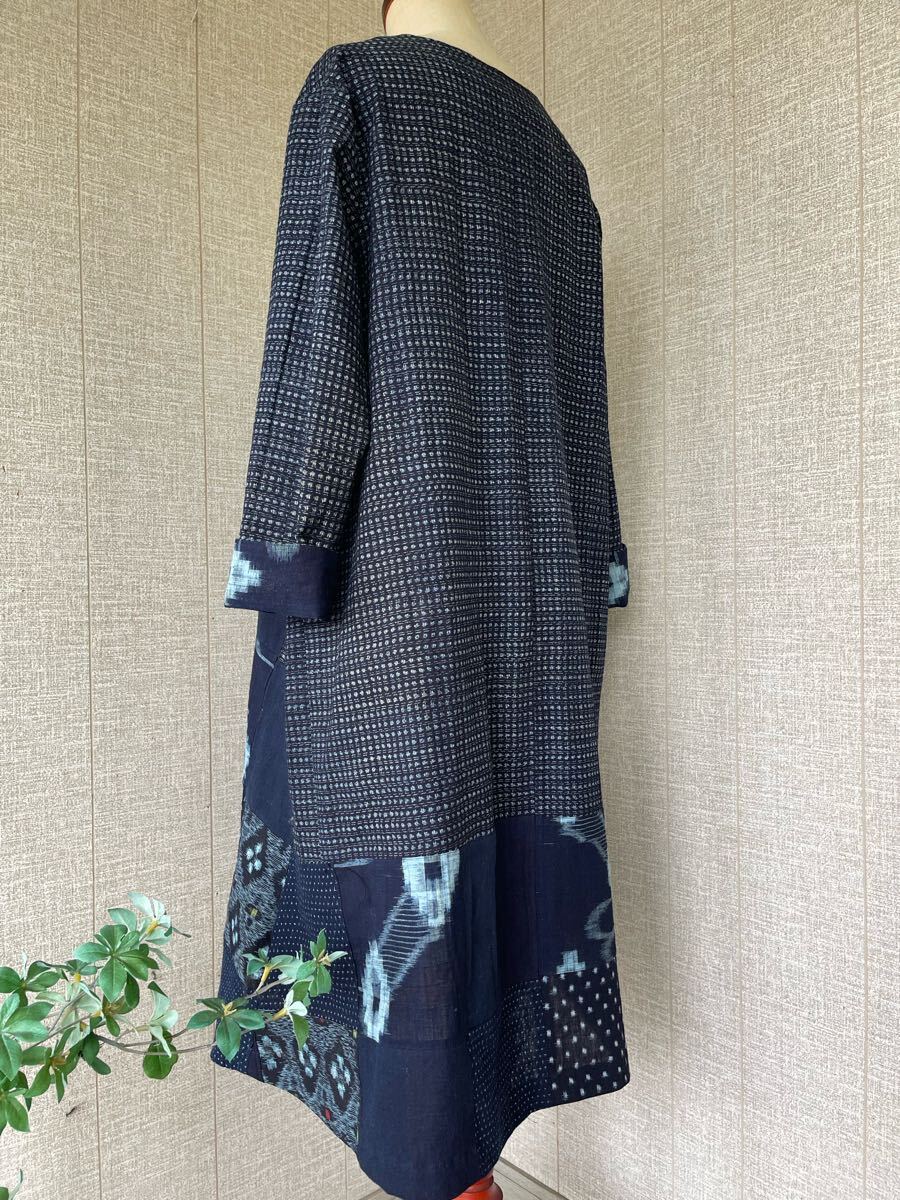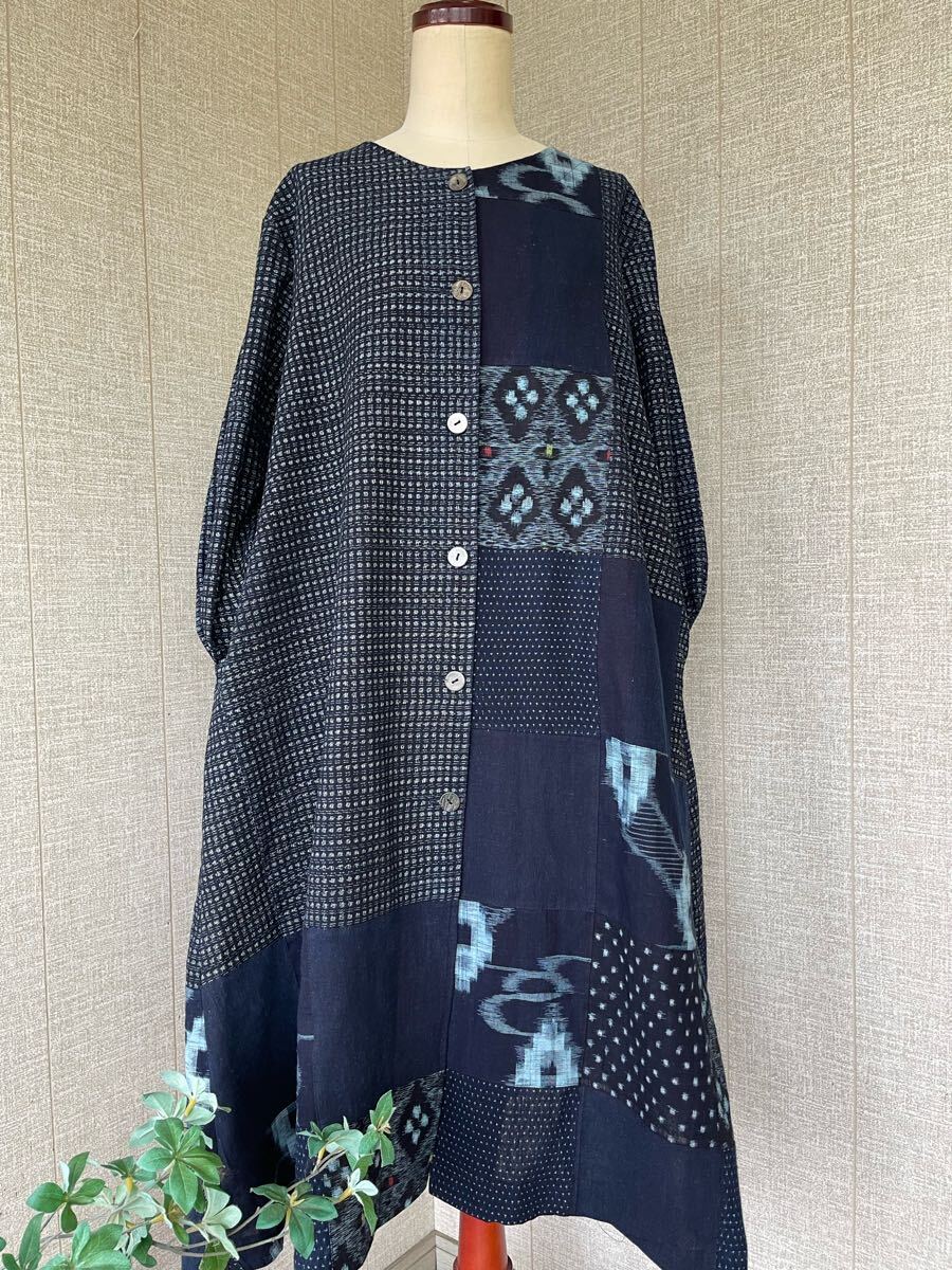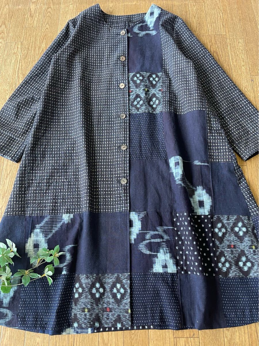 ★blue-sky/古布/着物リメイク/藍染め木綿・久留米書生絣・絵絣/パッチワーク・コートワンピース/ハンドメイド★