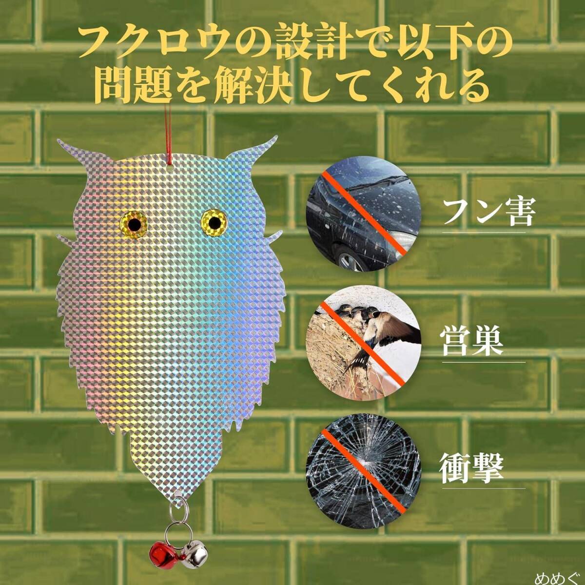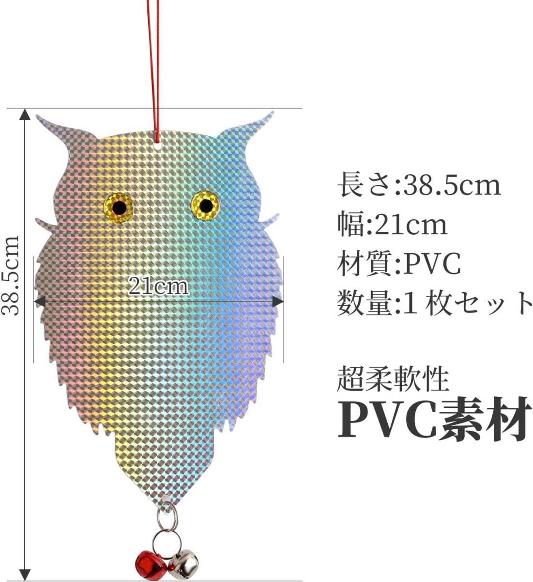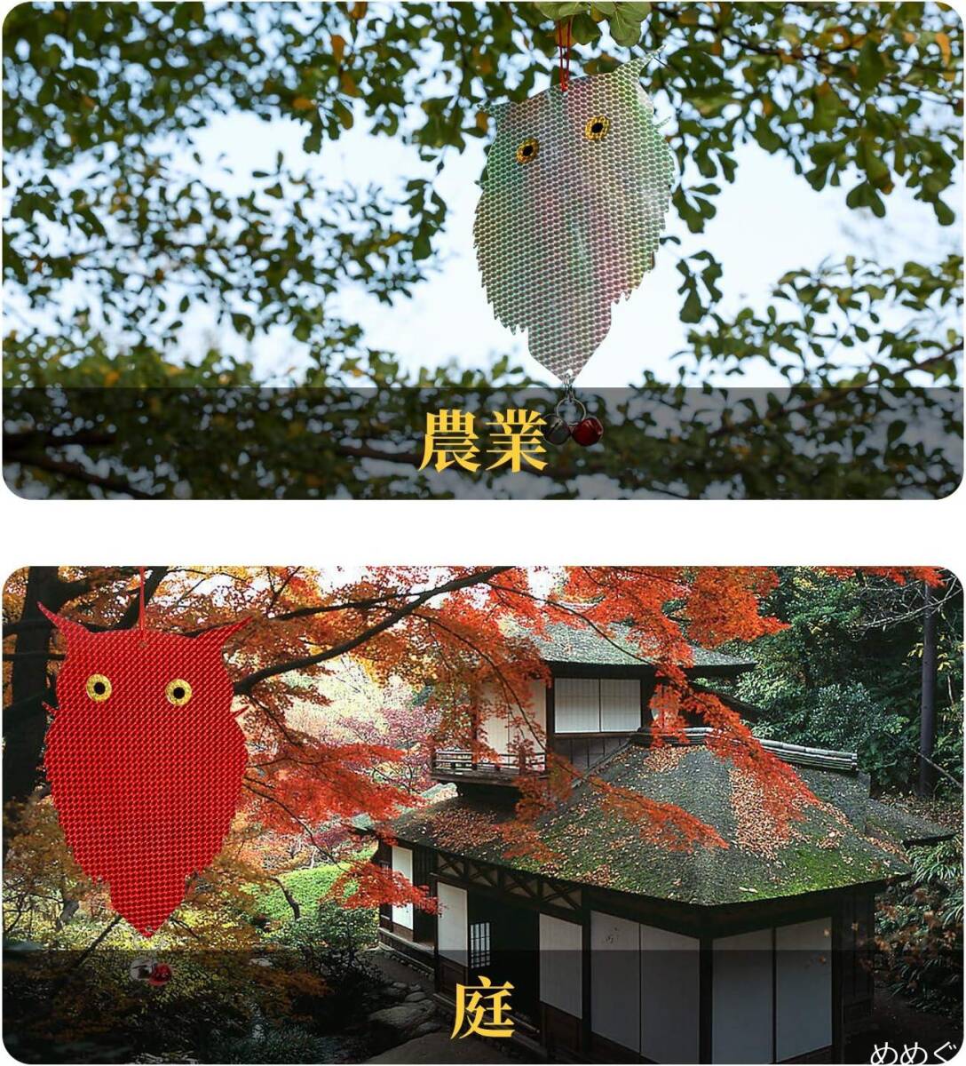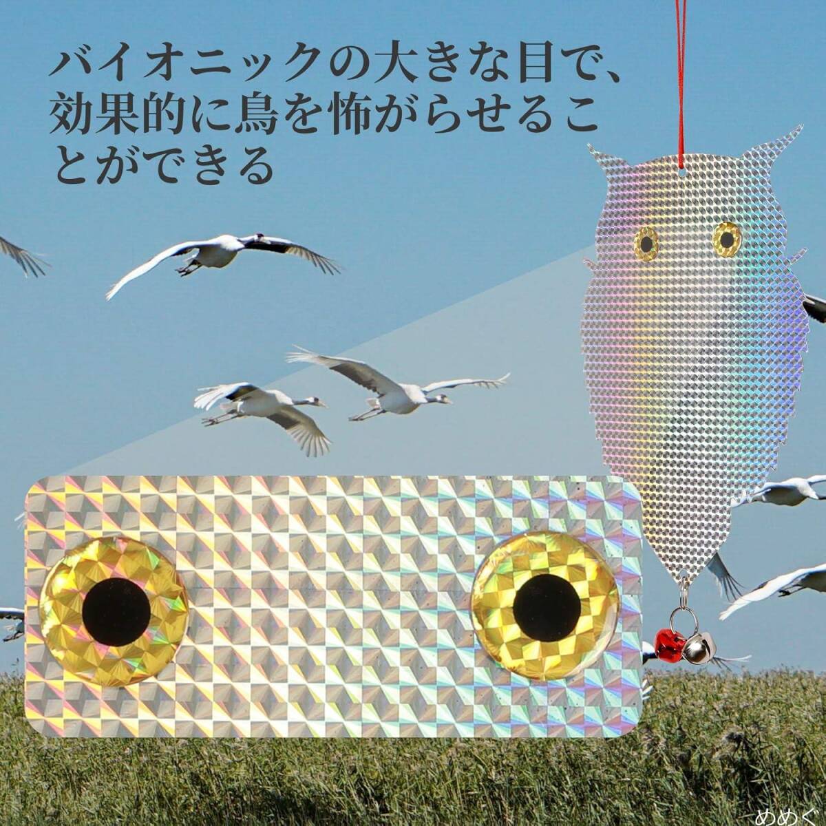 [模様にて鳥よけ] 鳩などの鳥たちが天敵のフクロウを怖がる特徴に基づいて、本製品は猛禽類のフクロウを模して目がイキイキでキラキラしていて、鳩などの鳥が怖がって寄り付けません。